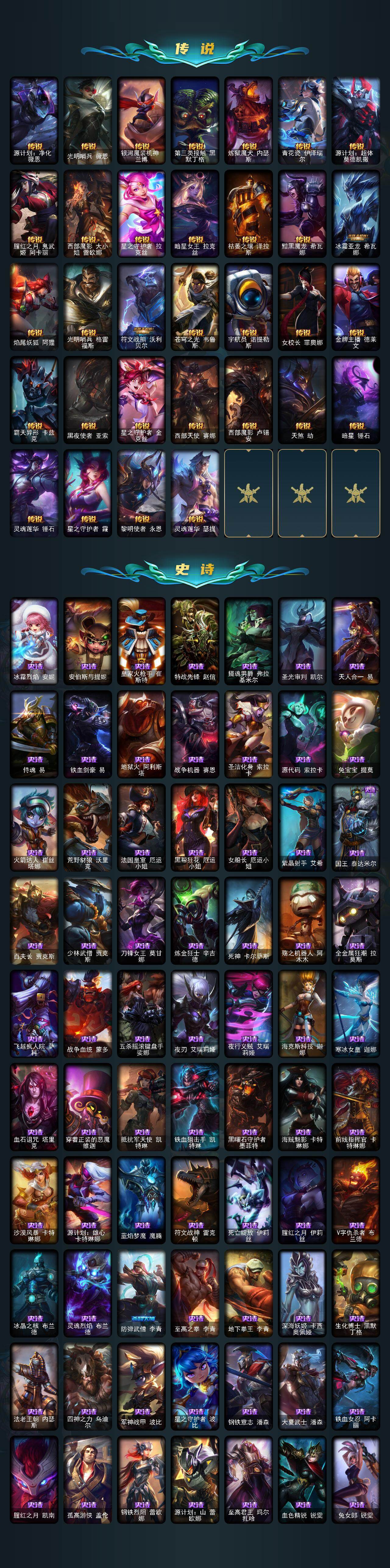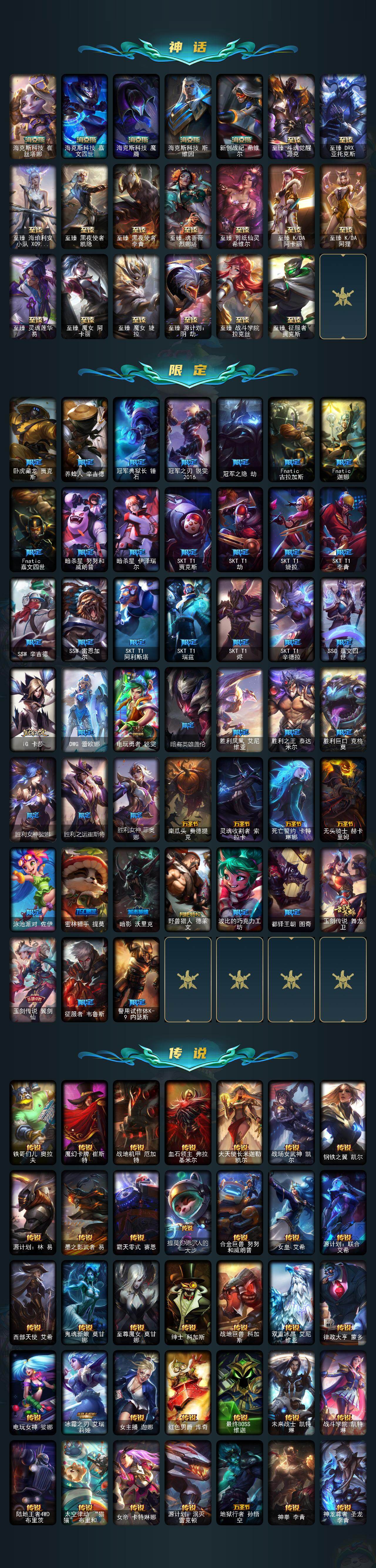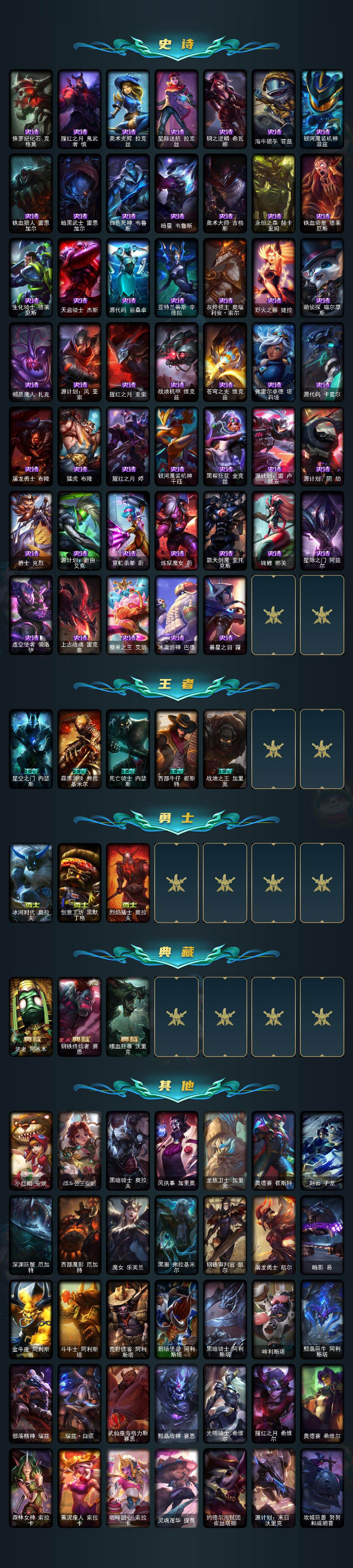 黄金段位-171英雄-576皮肤-188炫彩-1终极-28神话-70限定-67传说-117史诗 【热门头像】:银河魔装机神安妮头像 【至臻皮肤】:至臻灵魂莲华易,至臻剪纸仙灵希维尔,至臻征服者贾克斯,至臻海珀利安小队x09星环灵风迦娜,至臻黑夜使者李青,至臻kda阿卡丽,至臻魔女阿卡丽,至臻战斗学院拉克丝,至臻kda阿狸,至臻黑夜使者凯隐,至臻永恒星灵佐伊,至臻魔女婕拉,至臻源计划阴劫,至臻drx亚托克斯,至臻斗魂觉醒派克,至臻魂蔷薇烈娜塔 【臻彩皮肤】:天龙之子卡莎飞龙乘云,无畏骑士瑟庄妮赤子初心,墨之影武者亚索金墨耀影,雾雨之刃锐雯,神龙尊者圣龙李青龙腾云起,斗魂觉醒拉克丝无限斗志,玉剑传说无极麒麟,西部天使赛娜神选天使长,源计划联合艾希红莲之弓,星之守护者金克丝黑洞,西部天使赛娜贝利尔之怠,源计划火菲奥娜惩戒,霸天异形卡兹克刹那银光,星之守护者霞烈羽,最终boss维迦里大魔王,可爱可爱粉红红布里茨,殿堂传奇乐芙兰登神,魔女阿卡丽虚荣,净雪之月莫甘娜冬虹,心之钢伊泽瑞尔天纵才华 【年限皮肤】:银龙裁决泰隆,定海神珍孙悟空,碧玉之牙卡西奥佩娅,神龙烈焰金克丝,紫金罗刹莫甘娜,虎痴之拳蔚,王国机神苍狼瑟提,天龙之子斯莫德 【海克斯皮肤】:新创战纪希维尔,海克斯科技崔丝塔娜,海克斯科技斯维因,海克斯科技魔腾,海克斯科技嘉文四世 【情人节限定】:穿心之剑菲奥娜,觅心之翼奎因 【冰雪限定】:幸福女神乐芙兰,圣诞开心鬼提莫,圣诞狂欢努努和威朗普,圣诞狂欢基兰,狂心冰王图奇,胡桃夹子萨科,邪恶圣诞老人维迦,雪默丁格,圣诞玩偶波比,圣诞老人古拉加斯,魄罗骑士瑟庄妮,冰雪节辛吉德,北极星使者沃里克,北极星神黛安娜,北极星典狱长锤石 【终极皮肤】:武装战姬厄运小姐 【神话皮肤】:十周年纪念安妮,殿堂传奇乐芙兰,十五周年纪念希维尔,水晶圣骑艾希,新卧虎藏龙贾克斯,神凰行者瑞羽圣凰艾尼维亚,灰烬骑士莫德凯撒,海克斯科技崔丝塔娜,海克斯科技嘉文四世,海克斯科技魔腾,海克斯科技斯维因,新创战纪希维尔,至臻征服者贾克斯,至臻斗魂觉醒派克,至臻drx亚托克斯,至臻海珀利安小队x09星环灵风迦娜,至臻黑夜使者凯隐,至臻黑夜使者李青,至臻魂蔷薇烈娜塔,至臻剪纸仙灵希维尔,至臻kda阿卡丽,至臻kda阿狸,至臻灵魂莲华易,至臻魔女阿卡丽,至臻魔女婕拉,至臻源计划阴劫,至臻战斗学院拉克丝 【限定皮肤】:卧虎藏龙贾克斯,养蜂人辛吉德,冠军典狱长锤石,冠军之刃锐雯2016,冠军之隐劫,fnatic古拉加斯,fnatic迦娜,fnatic嘉文四世,暗杀星努努和威朗普,暗杀星伊泽瑞尔,sktt1贾克斯,sktt1劫,sktt1婕拉,sktt1李青,ssw辛吉德,ssw雷恩加尔,sktt1阿利斯塔,sktt1瑞兹,sktt1烬,sktt1辛德拉,ssg嘉文四世,ig卡莎,dwg蕾欧娜,电玩勇者锐雯,暗裔英雄盖伦,胜利凤凰艾尼维亚,胜利之王泰达米尔,胜利巨口克格莫,胜利女神娑娜,胜利之运崔斯特,胜利女神菲奥娜,南瓜头费德提克,灵魂收割者索拉卡,死亡誓约卡特琳娜,无头骑士赫卡里姆,泳池派对佐伊,密林猎手提莫,暗影沃里克,野兽猎人德莱文,波比的巧克力工坊,都铎王朝图奇,玉剑传说舞龙卫,玉剑传说翼剑仙,征服者韦鲁斯,警用试作体k9内瑟斯 【传说皮肤】:铁哥们儿奥拉夫,魔幻卡牌崔斯特,战地机甲厄加特,血石领主弗拉基米尔,大天使长米迦勒凯尔,战场女武神凯尔,钢铁之翼凯尔,源计划林易,墨之影武者易,霸天零式赛恩,提莫约德尔人的一大步,合金巨兽努努和威朗普,女皇艾希,源计划联合艾希,西部天使艾希,鬼魂新娘莫甘娜,至尊魔女莫甘娜,绅士科加斯,战地巨兽科加斯,双重冰晶艾尼维亚,律政大亨蒙多,电玩女神娑娜,冰霜之刃艾瑞莉娅,女主播迦娜,红色男爵库奇,最终boss维迦,未来战士凯特琳,战斗学院凯特琳,陆地王者4wd布里茨,太空律动猫猫布里和里茨,女帝卡特琳娜,源计划泯灭雷克顿,地狱行者孙悟空,神拳李青,神龙尊者圣龙李青,源计划净化薇恩,光明哨兵薇恩,银河魔装机神兰博,第三类接触黑默丁格,炼狱魔犬内瑟斯,青花瓷伊泽瑞尔,源计划超体莫德凯撒,腥红之月鬼武姬阿卡丽,西部魔影大小姐蕾欧娜,星之守护者拉克丝,暗星女王拉克丝,枯萎之壤泽拉斯,黯黑魔龙希瓦娜,冰霜亚龙希瓦娜,焰尾妖狐阿狸,光明哨兵格雷福斯,符文战熊沃利贝尔,苍穹之光韦鲁斯,宇航员诺提勒斯,女校长菲奥娜,金牌主播德莱文,霸天异形卡兹克,黑夜使者亚索,星之守护者金克丝,西部天使赛娜,西部魔影卢锡安,天煞劫,暗星锤石,灵魂莲华锤石,星之守护者霞,黎明使者永恩,灵魂莲华瑟提 【史诗皮肤】:冰霜烈焰安妮,安伯斯与提妮,皇家火呛手崔斯特,特战先锋赵信,摄魂男爵弗拉基米尔,圣光审判凯尔,天人合一易,侍魂易,铁血剑豪易,地狱火阿利斯塔,战争机器赛恩,圣洁化身索拉卡,源代码索拉卡,兔宝宝提莫,火箭达人崔丝塔娜,荒野豺狼沃里克,法国皇室厄运小姐,黑帮狂花厄运小姐,女船长厄运小姐,紫晶射手艾希,国王泰达米尔,百夫长贾克斯,少林武僧贾克斯,刀锋女王莫甘娜,炼金狂士辛吉德,死神卡尔萨斯,殇之机器人阿木木,全金属狂潮拉莫斯,飞越疯人院萨科,战争血统蒙多,五杀摇滚键盘手娑娜,夜刃艾瑞莉娅,夜行义贼艾瑞莉娅,海克斯科技迦娜,寒冰女皇迦娜,血石诅咒塔里克,穿着正装的恶魔维迦,抵抗军天使凯特琳,铁血狙击手凯特琳,黑曜石守护者墨菲特,海贼魅影卡特琳娜,前线指挥官卡特琳娜,沙漠风暴卡特琳娜,源计划雄心卡特琳