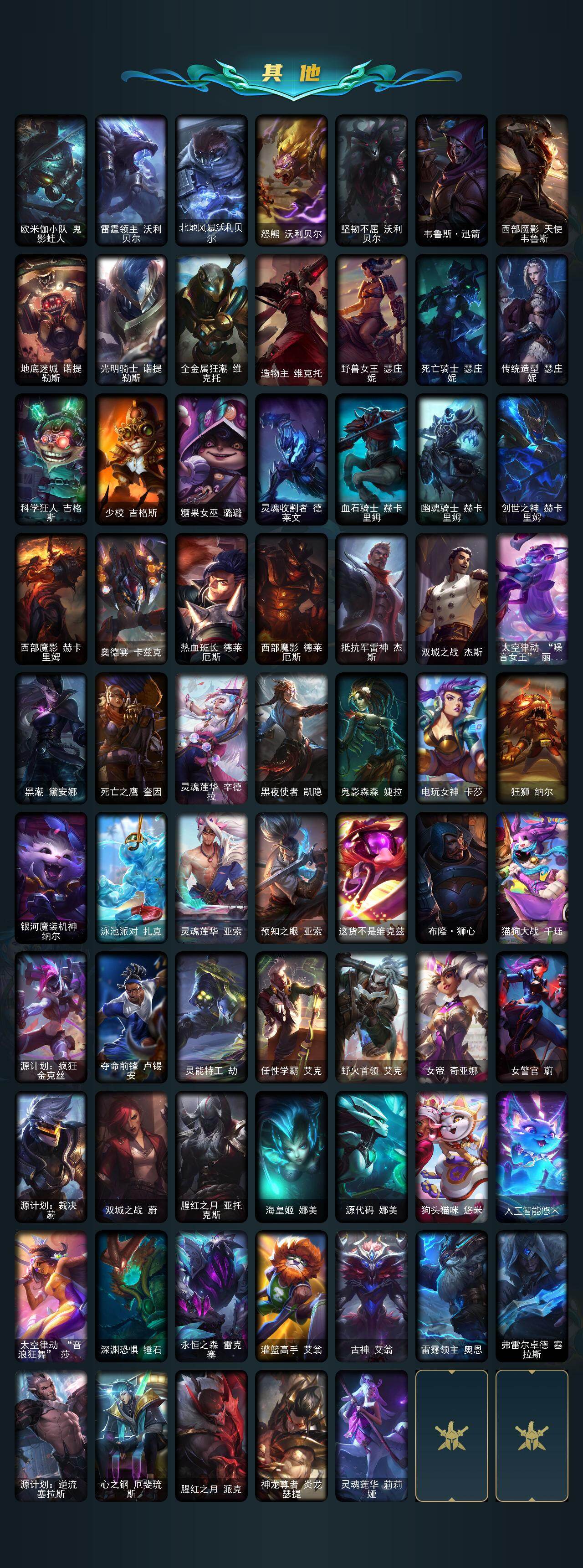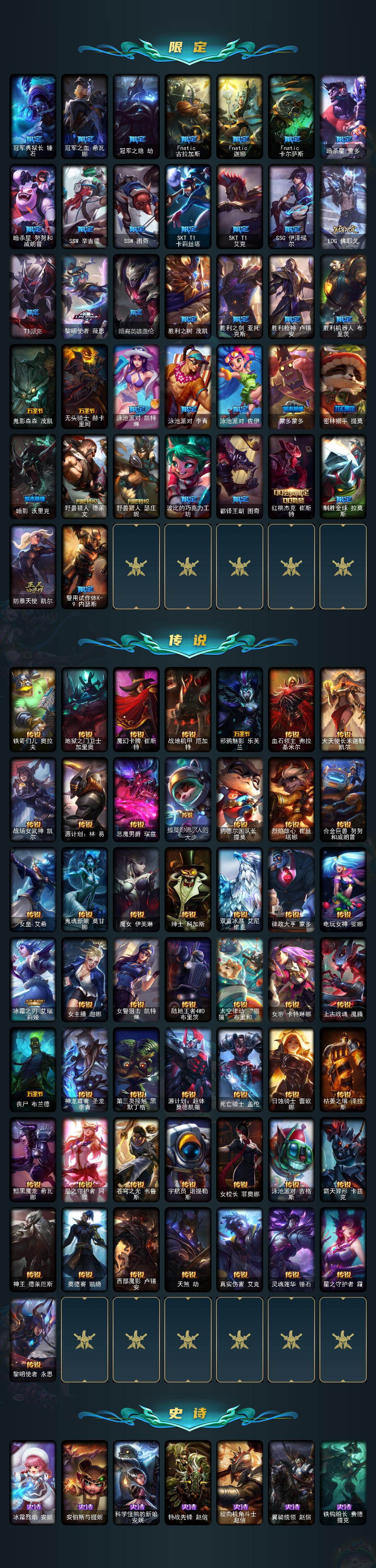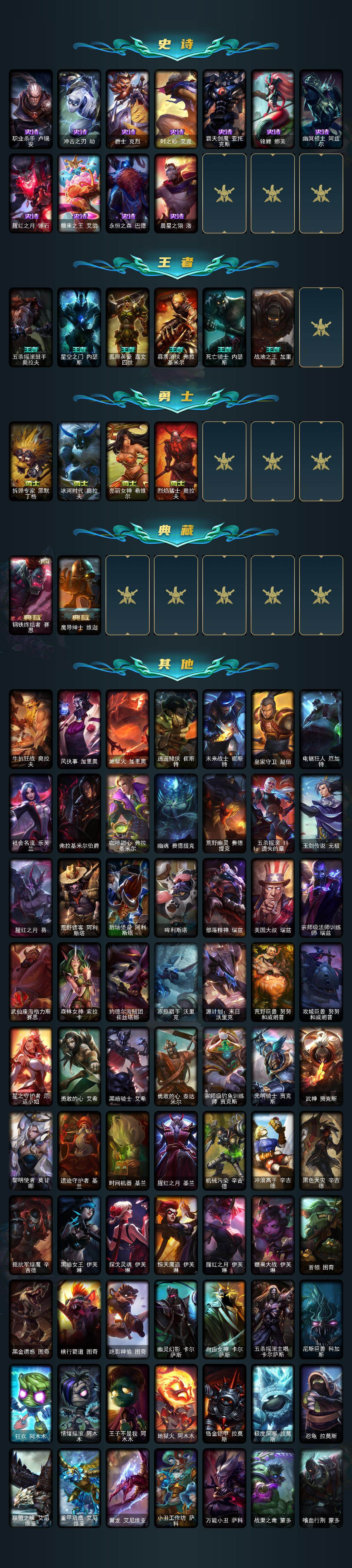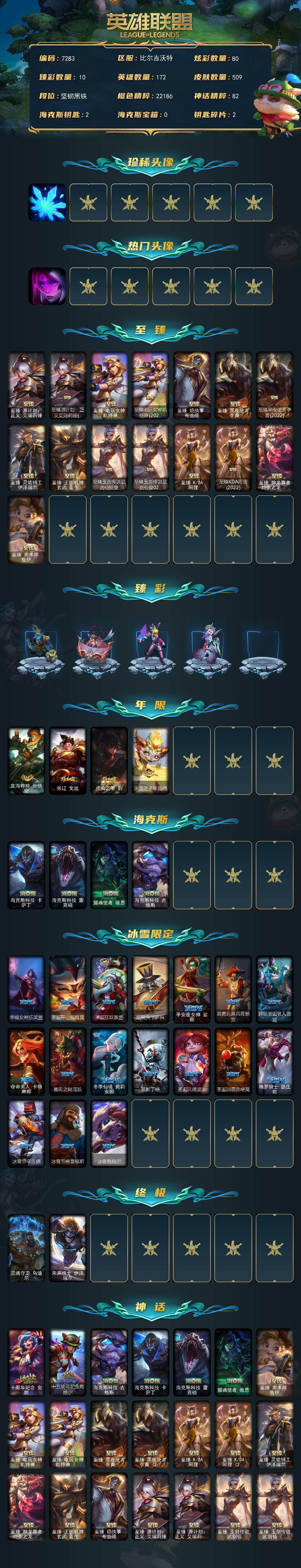 未定级段位-172英雄-509皮肤-80炫彩-2终极-21神话-58限定-50传说-123史诗 【珍稀头像】:雪花头像 【热门头像】:源计划刀妹头像 【至臻皮肤】:至臻源计划正义艾瑞莉娅,至臻源计划:正义艾瑞莉娅2022,至臻电玩女神凯特琳,至臻电玩女神凯特琳2022,至臻焰执事布兰德,至臻黑夜使者李青,至臻黑夜使者李青2022,至臻灵能特工伊泽瑞尔,至臻王国机神玄武盖伦,至臻玉剑传说武剑仙锐雯,至臻玉剑传说武剑仙2022,至臻kda阿狸,至臻kda阿狸2022,至臻神龙尊者均衡之龙沃利贝尔,至臻奥术师佐伊 【臻彩皮肤】:天龙之子卡莎飞龙乘云,墨之影武者亚索金墨耀影,冠军典狱长锤石凯旋圣装,战斗学院卡特琳娜盛典礼服,玉剑传说琴仙子丁香,幻灵战斗兔锐雯梦幻强袭,春晖神女艾希玉露金风,魔女阿卡丽虚荣,净雪之月莫甘娜冬虹,心之钢伊泽瑞尔天纵才华 【年限皮肤】:定海神珍孙悟空,张辽文远,虎痴之拳蔚,天龙之子斯莫德 【海克斯皮肤】:海克斯科技卡萨丁,海克斯科技雷克顿,摄魂使者薇恩,海克斯科技吉格斯 【冰雪限定】:幸福女神乐芙兰,圣诞开心鬼提莫,圣诞狂欢基兰,胡桃夹子萨科,平安夜女神娑娜,英勇玩具兵普朗克,邪恶圣诞老人维迦,夺命美人卡特琳娜,喜庆之树茂凯,冬季仙境奥莉安娜,雪默丁格,圣诞玩偶波比,圣诞驯鹿克格莫,魄罗骑士瑟庄妮,冰雪节辛吉德,冰雪节格雷福斯,冰雪兽纳尔 【终极皮肤】:灵魂守卫乌迪尔,未来战士伊泽瑞尔 【神话皮肤】:十周年纪念安妮,十五周年纪念希维尔,海克斯科技吉格斯,海克斯科技卡萨丁,海克斯科技雷克顿,摄魂使者薇恩,至臻奥术师佐伊,至臻电玩女神凯特琳,至臻电玩女神凯特琳2022,至臻黑夜使者李青,至臻黑夜使者李青2022,至臻kda阿狸,至臻kda阿狸2022,至臻灵能特工伊泽瑞尔,至臻神龙尊者均衡之龙沃利贝尔,至臻王国机神玄武盖伦,至臻焰执事布兰德,至臻源计划正义艾瑞莉娅,至臻源计划正义艾瑞莉娅2022,至臻玉剑传说武剑仙,至臻玉剑传说武剑仙2022 【限定皮肤】:冠军典狱长锤石,冠军之血希瓦娜,冠军之隐劫,fnatic古拉加斯,fnatic迦娜,fnatic卡尔萨斯,暗杀星蒙多,暗杀星努努和威朗普,ssw辛吉德,ssw图奇,sktt1卡莉丝塔,sktt1艾克,ssg伊泽瑞尔,edg佛耶戈,t1派克,黎明使者薇恩,暗裔英雄盖伦,胜利之树茂凯,胜利之剑亚托克斯,胜利呛神卢锡安,胜利机器人布里茨,鬼影森森茂凯,无头骑士赫卡里姆,泳池派对凯特琳,泳池派对李青,泳池派对佐伊,蒙多蒙多,密林猎手提莫,暗影沃里克,野兽猎人德莱文,野兽猎人瑟庄妮,波比的巧克力工坊,都铎王朝图奇,红桃杰克崔斯特,制胜金球拉莫斯,防暴天使凯尔,警用试作体k9内瑟斯 【传说皮肤】:铁哥们儿奥拉夫,地狱之门卫士加里奥,魔幻卡牌崔斯特,战地机甲厄加特,邪鸦魅影乐芙兰,血石领主弗拉基米尔,大天使长米迦勒凯尔,战场女武神凯尔,源计划林易,恶魔男爵瑞兹,提莫约德尔人的一大步,约德尔国队长提莫,烈焰雄心崔丝塔娜,合金巨兽努努和威朗普,女皇艾希,鬼魂新娘莫甘娜,魔女伊芙琳,绅士科加斯,双重冰晶艾尼维亚,律政大亨蒙多,电玩女神娑娜,冰霜之刃艾瑞莉娅,女主播迦娜,女警狙击凯特琳,陆地王者4wd布里茨,太空律动猫猫布里和里茨,女帝卡特琳娜,上古战魂魔腾,丧尸布兰德,神龙尊者圣龙李青,第三类接触黑默丁格,源计划超体莫德凯撒,死亡骑士盖伦,日蚀骑士蕾欧娜,枯萎之壤泽拉斯,黯黑魔龙希瓦娜,星之守护者阿狸,苍穹之光韦鲁斯,宇航员诺提勒斯,女校长菲奥娜,泳池派对吉格斯,霸天异形卡兹克,神王德莱厄斯,奥德赛凯隐,西部魔影卢锡安,天煞劫,真实伤害艾克,灵魂莲华锤石,星之守护者霞,黎明使者永恩 【史诗皮肤】:冰霜烈焰安妮,安伯斯与提妮,科学怪熊的新娘安妮,特战先锋赵信,绞肉机角斗士赵信,翼骑统领赵信,铁钩船长费德提克,重生之沙费德提克,圣光审判凯尔,天人合一易,铁血剑豪易,地狱火阿利斯塔,战场公主希维尔,圣洁化身索拉卡,源代码索拉卡,兔宝宝提莫,荒野豺狼沃里克,法国皇室厄运小姐,黑帮狂花厄运小姐,女船长厄运小姐,国王泰达米尔,百夫长贾克斯,刀锋女王莫甘娜,黑色荆棘莫甘娜,炼金狂士辛吉德,死神卡尔萨斯,侏罗纪化石科加斯,殇之机器人阿木木,熔火之心拉莫斯,全金属狂潮拉莫斯,贵族血统萨科,飞越疯人院萨科,武动巅峰萨科,战争血统蒙多,掠星魔刃卡萨丁,海克斯科技迦娜,恐惧新星普朗克,血石诅咒塔里克,穿着正装的恶魔维迦,北领前线斯维因,绝代智将斯维因,抵抗军天使凯特琳,黑曜石守护者墨菲特,海贼魅影卡特琳娜,前线指挥官卡特琳娜,蓝焰梦魔魔腾,符文战神雷克顿,枯萎之壤雷克顿,凯旋英雄嘉文四世,死亡绽放伊莉丝,腥红之月伊莉丝,灵骨工匠奥莉安娜,斗战胜佛孙悟空,v字仇杀者布兰德,灵魂烈焰布兰德,地下拳王李青,屠龙勇士薇恩,苍穹之光薇恩,深海妖姬卡西奥佩娅,生化博士黑默丁格,法老王朝内瑟斯,艳后奈德丽,四神之力乌迪尔,军神战甲波比,血色之锤波比,星之守护者波比,飞车暴走族古拉加斯,钢铁意志潘森,大夏武士潘森,死亡领主莫德凯撒,银色之牙阿卡丽,刺客信条凯南,腥红之月凯南,铁甲雄心盖伦,孤高游侠盖伦,至高君王玛尔扎哈,腥红之月泰隆,血色精锐锐雯,帝王斑蝶克格莫,深海怪鱼克格莫,战国大名慎,奥术光辉拉克丝,odst地狱伞兵拉克丝,沙之守护泽拉斯,钢之逆鳞希瓦娜,骸骨之爪希瓦娜,银河魔装机神希瓦娜,虚空海灵菲兹,铁血猎人雷恩加尔,暗黑武