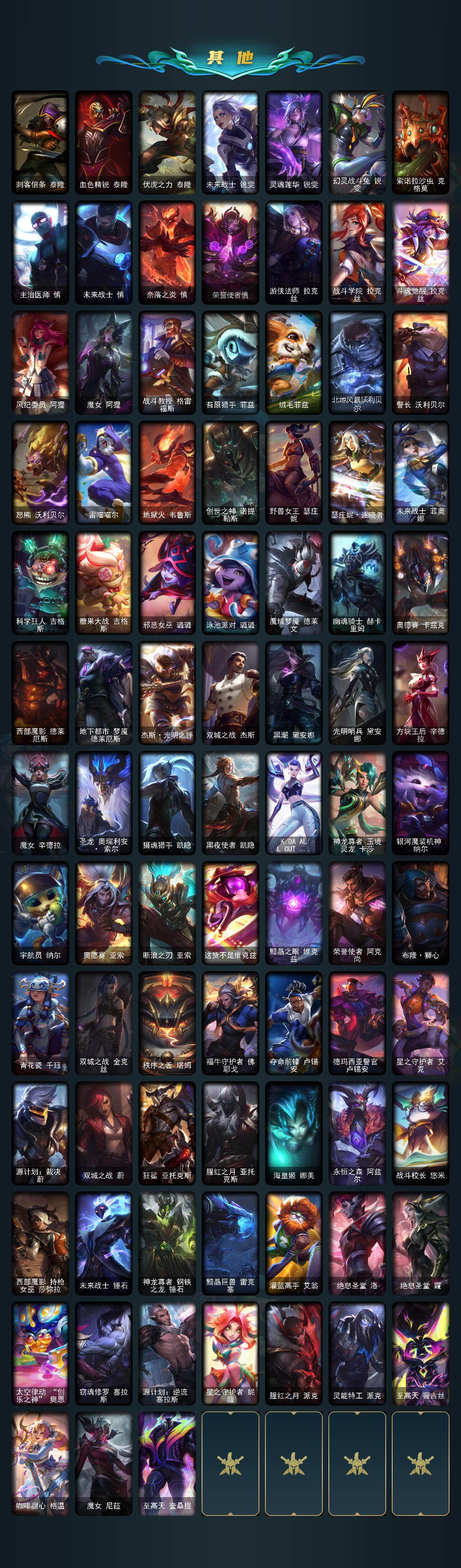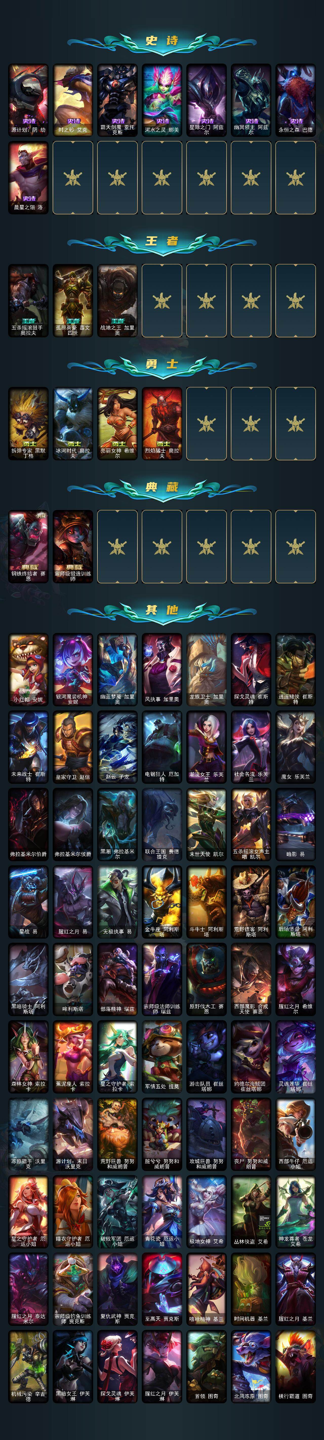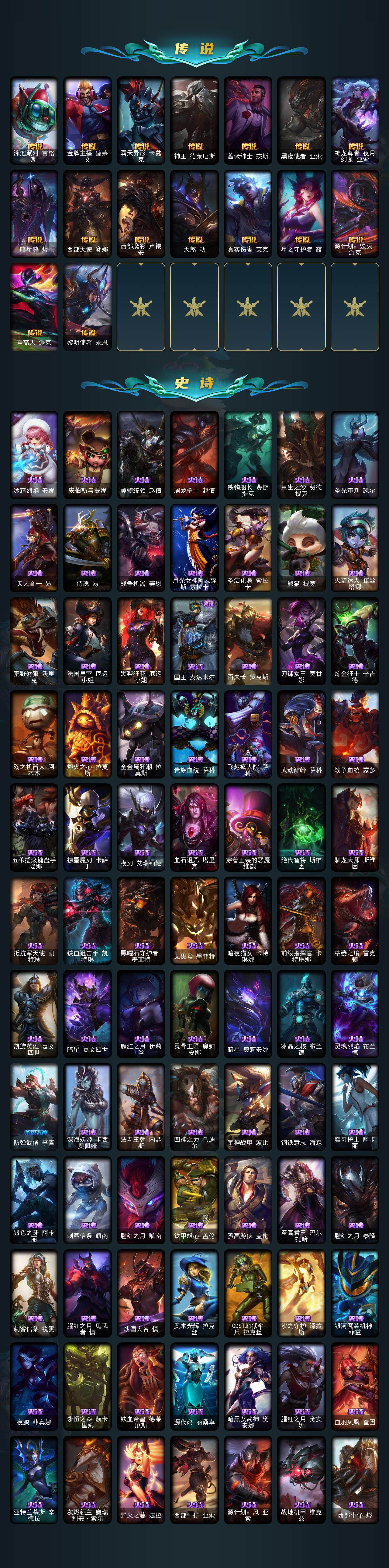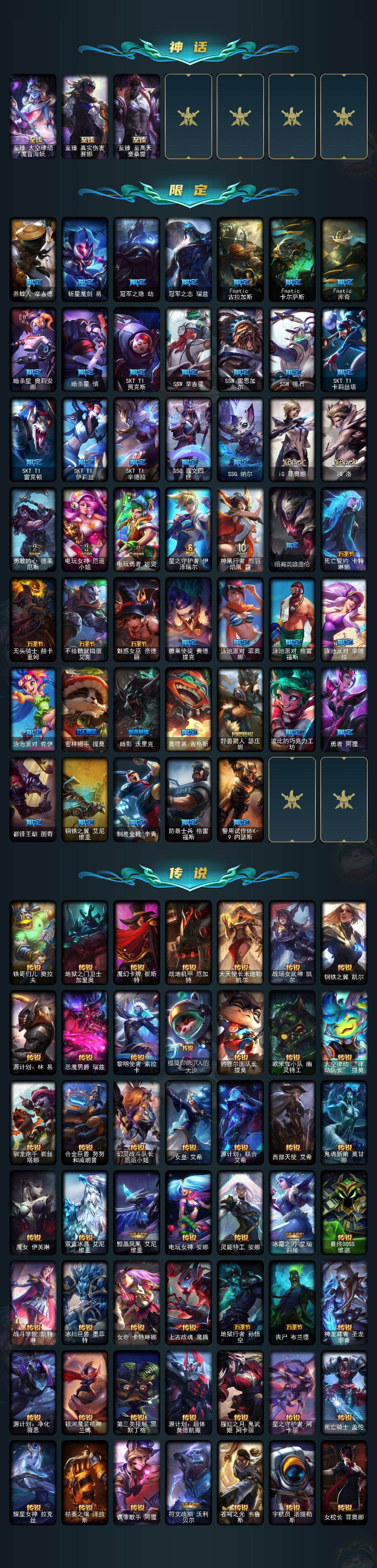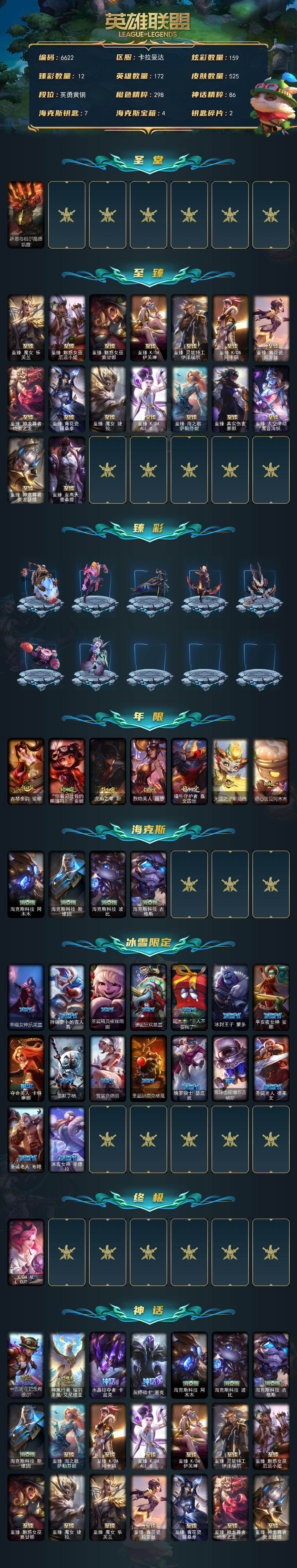 【萨恩乌祖尔莫德凯撒】青铜段位-172英雄-525皮肤-159炫彩-3终极-24神话-71限定-65传说-92史诗 【圣堂皮肤】:萨恩乌祖尔莫德凯撒 【至臻皮肤】:至臻魔女乐芙兰,至臻魅惑女巫厄运小姐,至臻魅惑女巫莫甘娜,至臻kda伊芙琳,至臻灵能特工伊泽瑞尔,至臻kda阿卡丽,至臻青花瓷拉克丝,至臻神龙尊者均衡之龙沃利贝尔,至臻青花瓷丽桑卓,至臻魔女婕拉,至臻kdaallout卡莎,至臻海之歌萨勒芬妮,至臻真实伤害赛娜,至臻太空律动魔音海妖娜美,至臻神龙尊者炎龙瑟提,至臻至高天奎桑提 【臻彩皮肤】:天龙之子卡莎飞龙乘云,无畏骑士瑟庄妮赤子初心,墨之影武者亚索金墨耀影,神龙尊者圣龙李青登龙,西部天使赛娜神选天使长,源计划联合艾希红莲之弓,霸天异形卡兹克刹那银光,灵魂莲华亚索霜见之时,可爱可爱粉红红布里茨,魔女阿卡丽虚荣,净雪之月莫甘娜冬虹,心之钢伊泽瑞尔天纵才华 【年限皮肤】:古琴余韵娑娜,你看见过我的熊猫吗安妮,虎痴之拳蔚,烈焰美人薇恩,福牛守护者嘉文四世,天龙之子斯莫德,点心宝贝阿木木 【海克斯皮肤】:海克斯科技阿木木,海克斯科技斯维因,海克斯科技波比,海克斯科技吉格斯 【冰雪限定】:幸福女神乐芙兰,持胡萝卜的雪人易,圣诞精灵崔丝塔娜,圣诞狂欢基兰,阿木木“主人不要我了”,冰封王子蒙多,平安夜女神娑娜,夺命美人卡特琳娜,雪默丁格,雪装奈德丽,圣诞驯鹿克格莫,魄罗骑士瑟庄妮,雪球也能爆炸吉格斯,圣诞老人德莱文,圣诞老人布隆,冰雪女神辛德拉 【终极皮肤】:kdaallout萨勒芬妮独立音乐人 【神话皮肤】:十五周年纪念希维尔,神凰行者瑞羽圣凰艾尼维亚,水晶掠夺者卡兹克,灰烬骑士派克,海克斯科技阿木木,海克斯科技波比,海克斯科技吉格斯,海克斯科技斯维因,至臻真实伤害赛娜,至臻至高天奎桑提,至臻海之歌萨勒芬妮,至臻kda阿卡丽,至臻kdaallout卡莎,至臻kda伊芙琳,至臻灵能特工伊泽瑞尔,至臻魅惑女巫厄运小姐,至臻魅惑女巫莫甘娜,至臻魔女婕拉,至臻魔女乐芙兰,至臻青花瓷拉克丝,至臻青花瓷丽桑卓,至臻神龙尊者均衡之龙沃利贝尔,至臻神龙尊者炎龙瑟提,至臻太空律动魔音海妖娜美 【限定皮肤】:养蜂人辛吉德,斩星魔剑易,冠军之隐劫,冠军之志瑞兹,fnatic古拉加斯,fnatic卡尔萨斯,fnatic库奇,暗杀星奥莉安娜,暗杀星慎,sktt1贾克斯,ssw辛吉德,ssw雷恩加尔,ssw锤石,sktt1卡莉丝塔,sktt1雷克顿,sktt1伊莉丝,sktt1辛德拉,ssg嘉文四世,ssg纳尔,ig菲奥娜,ig洛,勇敢的心德莱厄斯,电玩女神厄运小姐,电玩勇者锐雯,星之守护者伊泽瑞尔,神凰行者烈羽焰凰霞,暗裔英雄盖伦,死亡誓约卡特琳娜,无头骑士赫卡里姆,不给糖就捣蛋艾克,魅惑女巫奈德丽,糖果使徒费德提克,泳池派对菲奥娜,泳池派对格雷福斯,泳池派对辛德拉,泳池派对佐伊,密林猎手提莫,暗影沃里克,奥德赛吉格斯,野兽猎人瑟庄妮,波比的巧克力工坊,勇者阿狸,都铎王朝图奇,钢铁之翼艾尼维亚,制胜金靴李青,防暴士兵格雷福斯,警用试作体k9内瑟斯,双城之战2教授黑默丁格 【传说皮肤】:铁哥们儿奥拉夫,地狱之门卫士加里奥,魔幻卡牌崔斯特,战地机甲厄加特,大天使长米迦勒凯尔,战场女武神凯尔,钢铁之翼凯尔,源计划林易,恶魔男爵瑞兹,黎明使者索拉卡,提莫约德尔人的一大步,约德尔国队长提莫,欧米伽小队幽灵特工,太空律动律动队长提莫,驯龙炮手崔丝塔娜,合金巨兽努努和威朗普,幻灵战斗队长厄运小姐,女皇艾希,源计划联合艾希,西部天使艾希,鬼魂新娘莫甘娜,魔女伊芙琳,双重冰晶艾尼维亚,黯晶凤凰艾尼维亚,电玩女神娑娜,灵能特工娑娜,冰霜之刃艾瑞莉娅,最终boss维迦,战斗学院凯特琳,冰川巨兽墨菲特,女帝卡特琳娜,上古战魂魔腾,地狱行者孙悟空,丧尸布兰德,神龙尊者圣龙李青,源计划净化薇恩,银河魔装机神兰博,第三类接触黑默丁格,源计划超体莫德凯撒,腥红之月鬼武姬阿卡丽,星之守护者阿卡丽,死亡骑士盖伦,耀星女神拉克丝,枯萎之壤泽拉斯,偶像歌手阿狸,符文战熊沃利贝尔,苍穹之光韦鲁斯,宇航员诺提勒斯,女校长菲奥娜,泳池派对吉格斯,金牌主播德莱文,霸天异形卡兹克,神王德莱厄斯,蔷薇绅士杰斯,黑夜使者亚索,神龙尊者夜月幻龙亚索,暗星尊烬,西部天使赛娜,西部魔影卢锡安,天煞劫,真实伤害艾克,星之守护者霞,源计划毁灭派克,至高天派克,黎明使者永恩 【史诗皮肤】:冰霜烈焰安妮,安伯斯与提妮,翼骑统领赵信,屠龙勇士赵信,铁钩船长费德提克,重生之沙费德提克,圣光审判凯尔,天人合一易,侍魂易,战争机器赛恩,月光女神阿忒弥斯索拉卡,圣洁化身索拉卡,熊猫提莫,火箭达人崔丝塔娜,荒野豺狼沃里克,法国皇室厄运小姐,黑帮狂花厄运小姐,国王泰达米尔,百夫长贾克斯,刀锋女王莫甘娜,炼金狂士辛吉德,殇之机器人阿木木,熔火之心拉莫斯,全金属狂潮拉莫斯,贵族血统萨科,飞越疯人院萨科,武动巅峰萨科,战争血统蒙多,五杀摇滚键盘手娑娜,掠星魔刃卡萨丁,夜刃艾瑞莉娅,血石诅咒塔里克,穿着正装的恶魔维迦,绝代智将斯维因,驯龙大师斯维因,抵抗军天使凯特琳,铁血狙击手凯特琳,黑曜石守护者墨菲特,无畏号墨菲特,暗夜猫女卡特琳娜,前线指挥官卡特琳娜,枯萎之壤雷克顿,凯旋英雄嘉文四世,暗星嘉文四世,腥红之月伊莉丝,灵骨工匠奥莉安娜,暗星奥莉安娜,冰晶之核布兰德,灵魂烈焰布兰德,防弹武僧李青,深海妖姬卡西奥佩娅,法老王朝内瑟斯,四神之力乌迪尔,军神战甲波
