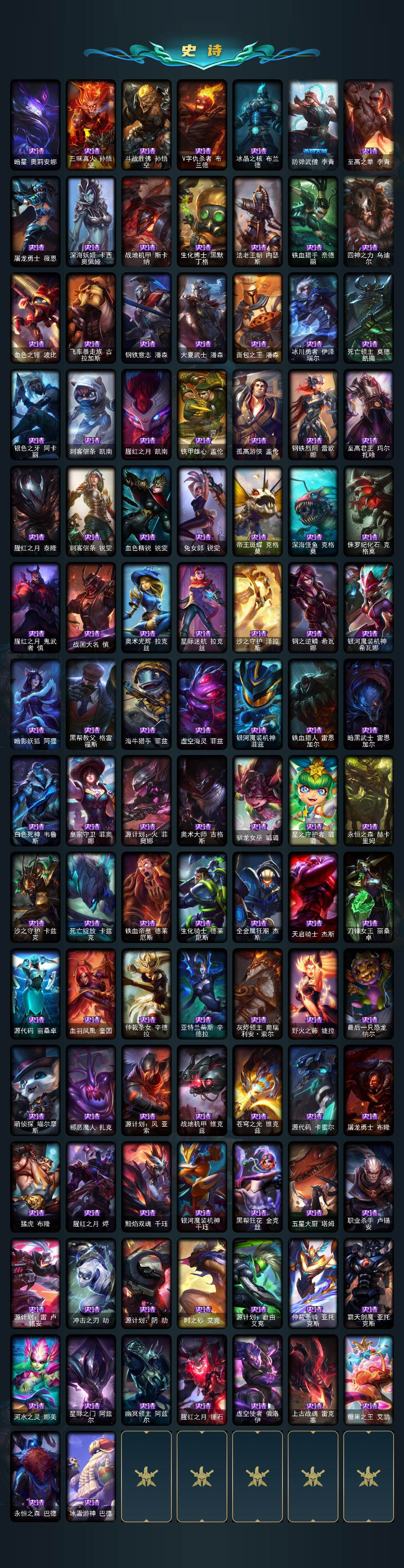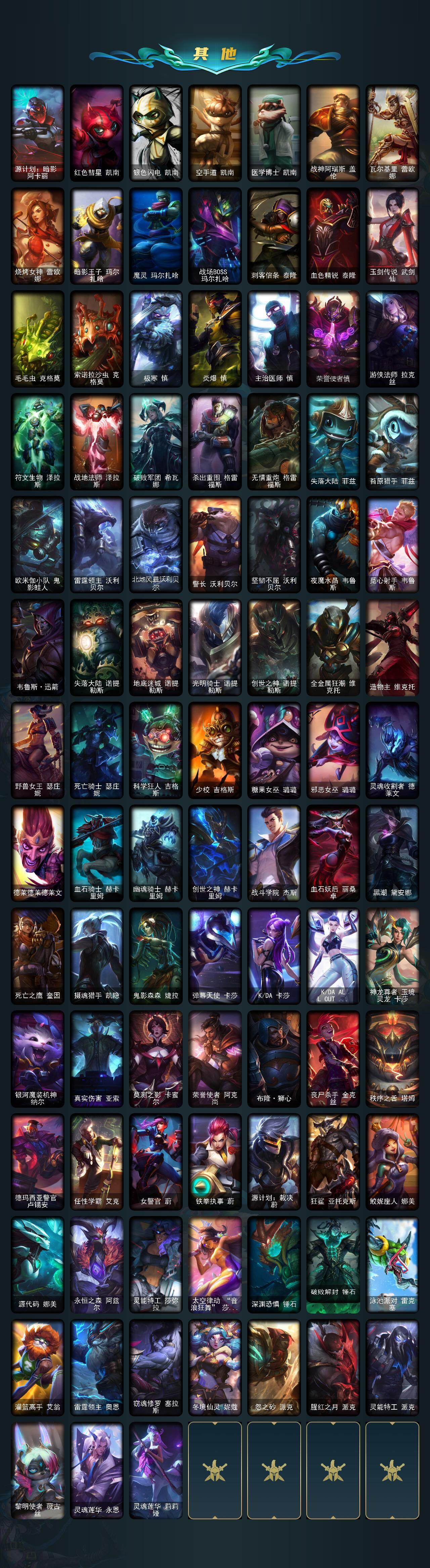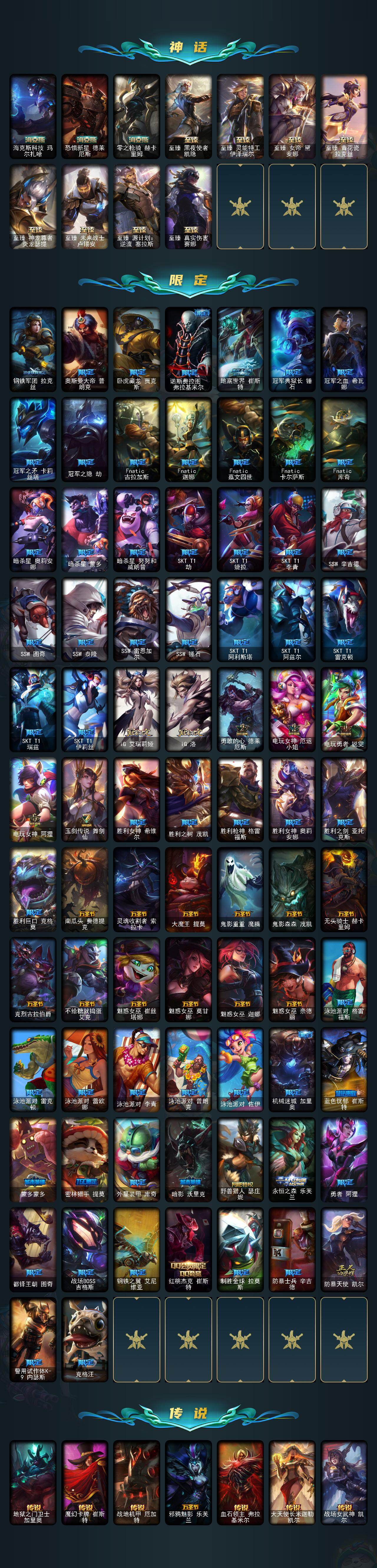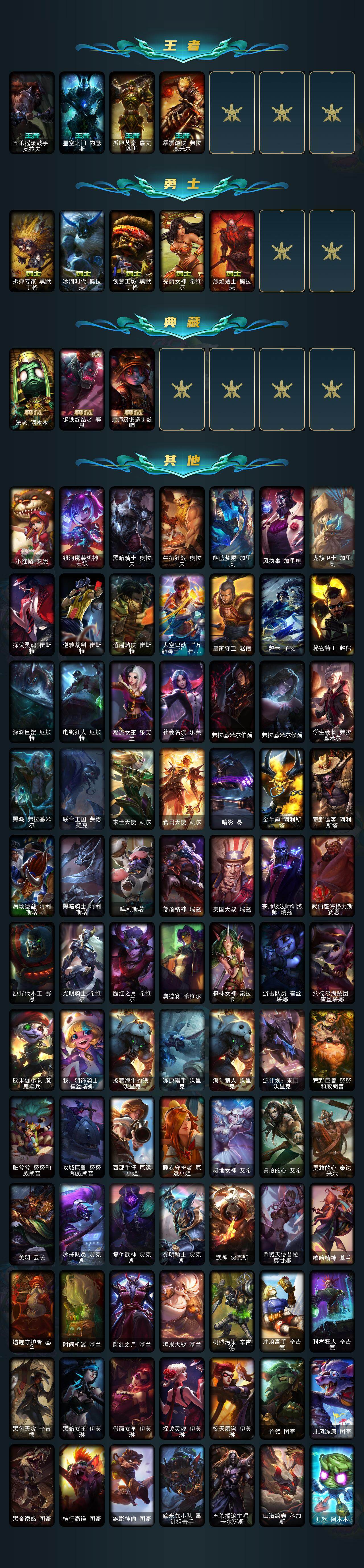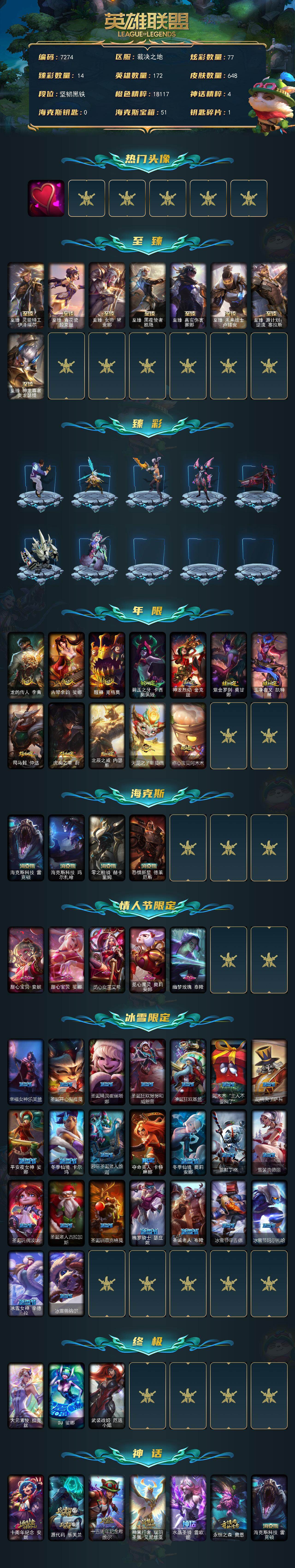 未定级段位-172英雄-648皮肤-77炫彩-3终极-18神话-119限定-49传说-163史诗 【热门头像】:爱意绵绵头像 【至臻皮肤】:至臻灵能特工伊泽瑞尔,至臻青花瓷拉克丝,至臻女帝黛安娜,至臻黑夜使者凯隐,至臻真实伤害赛娜,至臻未来战士卢锡安,至臻源计划逆流塞拉斯,至臻神龙尊者炎龙瑟提 【臻彩皮肤】:龙的传人李青跃龙在渊,天龙之子卡莎飞龙乘云,冰霜之刃艾瑞莉娅炫金,墨之影武者亚索金墨耀影,雾雨之刃锐雯,弹幕天使卡莎炽天使勇敢,西部天使赛娜贝利尔之怠,霸天巨兽雪崩墨菲特,咖啡甜心格温酒醉樱桃,魔女阿卡丽虚荣,净雪之月莫甘娜冬虹,幻灵战斗兔阿萝拉梦幻强袭,红莲之刃锐雯,心之钢伊泽瑞尔天纵才华 【年限皮肤】:龙的传人李青,古琴余韵娑娜,醒狮克格莫,碧玉之牙卡西奥佩娅,神龙烈焰金克丝,紫金罗刹莫甘娜,玉净夜叉凯特琳,司马懿仲达,虎痴之拳蔚,北辰之威内瑟斯,天龙之子斯莫德,点心宝贝阿木木 【海克斯皮肤】:海克斯科技雷克顿,海克斯科技玛尔扎哈,零之呛骑赫卡里姆,恐惧新星德莱厄斯 【情人节限定】:甜心宝贝安妮,甜心宝贝娑娜,觅心女王艾希,觅心魔灵奥莉安娜,幽梦玫瑰泰隆 【冰雪限定】:幸福女神乐芙兰,圣诞开心鬼提莫,圣诞精灵崔丝塔娜,圣诞狂欢努努和威朗普,圣诞狂欢基兰,阿木木“主人不要我了”,胡桃夹子萨科,平安夜女神娑娜,冬季仙境卡尔玛,邪恶圣诞老人维迦,夺命美人卡特琳娜,冬季仙境奥莉安娜,雪默丁格,雪装奈德丽,圣诞玩偶波比,圣诞老人古拉加斯,圣诞驯鹿克格莫,魄罗骑士瑟庄妮,圣诞老人布隆,冰雪节辛吉德,冰雪节玛尔扎哈,冰雪女神辛德拉,冰雪兽纳尔 【终极皮肤】:大元素使拉克丝,dj娑娜,武装战姬厄运小姐 【神话皮肤】:十周年纪念安妮,源代码乐芙兰,十五周年纪念希维尔,神凰行者瑞羽圣凰艾尼维亚,水晶圣骑蕾欧娜,永恒之森奥恩,海克斯科技雷克顿,海克斯科技玛尔扎哈,恐惧新星德莱厄斯,零之呛骑赫卡里姆,至臻真实伤害赛娜,至臻黑夜使者凯隐,至臻灵能特工伊泽瑞尔,至臻女帝黛安娜,至臻青花瓷拉克丝,至臻神龙尊者炎龙瑟提,至臻未来战士卢锡安,至臻源计划逆流塞拉斯 【限定皮肤】:钢铁军团拉克丝,奥斯曼大帝普朗克,卧虎藏龙贾克斯,诺斯费拉图弗拉基米尔,地底世界崔斯特,冠军典狱长锤石,冠军之血希瓦娜,冠军之矛卡莉丝塔,冠军之隐劫,fnatic古拉加斯,fnatic迦娜,fnatic嘉文四世,fnatic卡尔萨斯,fnatic库奇,暗杀星奥莉安娜,暗杀星蒙多,暗杀星努努和威朗普,sktt1劫,sktt1婕拉,sktt1李青,ssw辛吉德,ssw图奇,ssw泰隆,ssw雷恩加尔,ssw锤石,sktt1阿利斯塔,sktt1阿兹尔,sktt1雷克顿,sktt1瑞兹,sktt1伊莉丝,ig艾瑞莉娅,ig洛,勇敢的心德莱厄斯,电玩女神厄运小姐,电玩勇者锐雯,电玩女神阿狸,玉剑传说舞剑仙,胜利女神希维尔,胜利之树茂凯,胜利呛神格雷福斯,胜利女神奥莉安娜,胜利之剑亚托克斯,胜利巨口克格莫,南瓜头费德提克,灵魂收割者索拉卡,大魔王提莫,鬼影重重魔腾,鬼影森森茂凯,无头骑士赫卡里姆,克烈古拉伯爵,不给糖就捣蛋艾克,魅惑女巫崔丝塔娜,魅惑女巫莫甘娜,魅惑女巫迦娜,魅惑女巫奈德丽,泳池派对格雷福斯,泳池派对雷克顿,泳池派对蕾欧娜,泳池派对李青,泳池派对普朗克,泳池派对佐伊,机械迷城加里奥,蓝色忧郁崔斯特,蒙多蒙多,密林猎手提莫,外星装甲库奇,暗影沃里克,野兽猎人瑟庄妮,永恒之森乐芙兰,勇者阿狸,都铎王朝图奇,战场boss吉格斯,钢铁之翼艾尼维亚,红桃杰克崔斯特,制胜金球拉莫斯,防暴士兵辛吉德,防暴天使凯尔,警用试作体k9内瑟斯,克格汪 【传说皮肤】:地狱之门卫士加里奥,魔幻卡牌崔斯特,战地机甲厄加特,邪鸦魅影乐芙兰,血石领主弗拉基米尔,大天使长米迦勒凯尔,战场女武神凯尔,钢铁之翼凯尔,源计划林易,恶魔男爵瑞兹,提莫约德尔人的一大步,欧米伽小队幽灵特工,合金巨兽努努和威朗普,源计划联合艾希,鬼魂新娘莫甘娜,绅士科加斯,战地巨兽科加斯,双重冰晶艾尼维亚,律政大亨蒙多,电玩女神娑娜,冰霜之刃艾瑞莉娅,红色男爵库奇,最终boss维迦,女警狙击凯特琳,陆地王者4wd布里茨,苹果机器人布里茨,上古战魂魔腾,源计划泯灭雷克顿,地狱行者孙悟空,丧尸布兰德,神龙尊者圣龙李青,源计划净化薇恩,第三类接触黑默丁格,屠龙勇士潘森,腥红之月鬼武姬阿卡丽,死亡骑士盖伦,钢铁军团盖伦,神王盖伦,星之守护者拉克丝,黯黑魔龙希瓦娜,符文战熊沃利贝尔,女校长菲奥娜,泳池派对吉格斯,金牌主播德莱文,霸天异形卡兹克,灌篮高手德莱厄斯,黑夜使者亚索,星之守护者金克丝,源计划毁灭派克 【史诗皮肤】:安伯斯与提妮,科学怪熊的新娘安妮,皇家火呛手崔斯特,腥红之月崔斯特,绞肉机角斗士赵信,翼骑统领赵信,铁钩船长费德提克,重生之沙费德提克,圣光审判凯尔,铁血剑豪易,地狱火阿利斯塔,战争机器赛恩,战场公主希维尔,月光女神阿忒弥斯索拉卡,圣洁化身索拉卡,兔宝宝提莫,火箭达人崔丝塔娜,荒野豺狼沃里克,法国皇室厄运小姐,黑帮狂花厄运小姐,女船长厄运小姐,百夫长贾克斯,少林武僧贾克斯,黑色荆棘莫甘娜,炼金狂士辛吉德,死神卡尔萨斯,卡尔萨斯祸害之光,侏罗纪化石科加斯,熔火之心拉莫斯,贵族血统萨科,飞越疯人院萨科,武动巅峰萨科,战争血统蒙多,五杀摇滚键盘手娑娜,掠星魔刃卡萨丁,夜刃艾瑞莉娅,海克斯科技迦娜,寒冰女皇迦娜,星之守护者迦娜,特种部队普朗克,恐惧新星普朗克,血