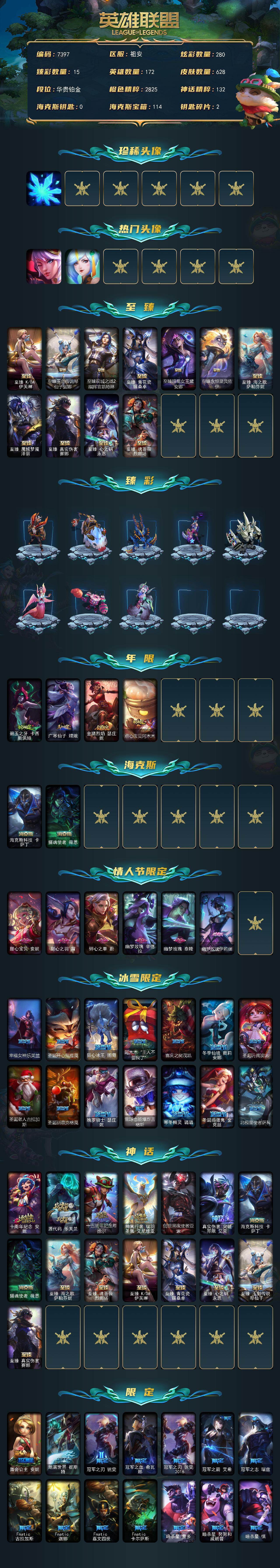【创世黑夜使者亚索 有峡谷资格】铂金段位-172英雄-628皮肤-280炫彩-0终极-19神话-84限定-65传说-115史诗 【珍稀头像】:雪花头像 【热门头像】:觅心之翼奎因头像,春晖神女头像 【至臻皮肤】:至臻kda伊芙琳,至臻玉剑传说琴仙子娑娜,至臻双城之战2指挥官凯特琳,至臻青花瓷丽桑卓,至臻暗星女王黛安娜,至臻永恒星灵佐伊,至臻海之歌萨勒芬妮,至臻魔域梦魇泽丽,至臻真实伤害赛娜,至臻心之钢永恩,至臻魂蔷薇烈娜塔 【臻彩皮肤】:天龙之子卡莎飞龙乘云,巅峰之拳瑟提明镜止水,无畏骑士瑟庄妮赤子初心,墨之影武者亚索金墨耀影,花仙子拉克丝纹白,青花瓷艾瑞莉娅月色,霸天异形卡兹克掠空魅影,星之守护者金克丝黑洞,霸天巨兽雪崩墨菲特,玉剑传说苍鸾丁香,可爱可爱粉红红布里茨,魔女阿卡丽虚荣,净雪之月莫甘娜冬虹,幻灵战斗兔阿萝拉梦幻强袭,心之钢伊泽瑞尔天纵才华 【年限皮肤】:碧玉之牙卡西奥佩娅,广寒仙子嫦娥,金猪烈焰瑟庄妮,点心宝贝阿木木 【海克斯皮肤】:海克斯科技卡萨丁,摄魂使者薇恩 【情人节限定】:甜心宝贝安妮,甜心之羽霞,碎心之拳蔚,幽梦玫瑰辛德拉,幽梦玫瑰泰隆,幽梦玫瑰伊莉丝 【冰雪限定】:幸福女神乐芙兰,圣诞开心鬼提莫,狂心冰王图奇,阿木木“主人不要我了”,喜庆之树茂凯,冬季仙境奥莉安娜,圣诞玩偶波比,圣诞老人古拉加斯,圣诞驯鹿克格莫,魄罗骑士瑟庄妮,雪球也能爆炸吉格斯,寒冬精灵璐璐,圣诞捣蛋鬼金克丝,北极星使者萨科 【神话皮肤】:十周年纪念安妮,源代码乐芙兰,十五周年纪念希维尔,神凰行者瑞羽圣凰艾尼维亚,创世黑夜使者亚索,真实伤害突破界限艾克,海克斯科技卡萨丁,摄魂使者薇恩,至臻真实伤害赛娜,至臻海之歌萨勒芬妮,至臻魂蔷薇烈娜塔,至臻kda伊芙琳,至臻青花瓷丽桑卓,至臻心之钢永恩,至臻玉剑传说琴仙子 【限定皮肤】:舞会公主安妮,地底世界崔斯特,冠军之刃锐雯,冠军之血希瓦娜,冠军之刃锐雯2016,冠军之箭艾希,冠军之志瑞兹,fnatic古拉加斯,fnatic迦娜,fnatic嘉文四世,fnatic卡尔萨斯,暗杀星蒙多,暗杀星努努和威朗普,暗杀星慎,暗杀星伊泽瑞尔,sktt1李青,sktt1薇恩,ssw辛吉德,sktt1娜美,ig菲奥娜,ig卡蜜尔,f墨菲特,dwg崔斯特,edg佛耶戈,drx千珏,drx凯特琳,电玩女神厄运小姐,玉剑传说舞剑仙,神凰行者烈羽焰凰霞,暗裔英雄盖伦,胜利凤凰艾尼维亚,胜利之王泰达米尔,胜利巨口克格莫,胜利女神娑娜,胜利剑圣易,胜利之运崔斯特,南瓜头费德提克,鬼影重重魔腾,鬼影森森茂凯,死亡誓约维克托,魅惑女巫厄运小姐,魅惑女巫莫甘娜,魅惑女巫伊莉丝,魅惑女巫悠米,糖果使徒费德提克,泳池派对雷克顿,泳池派对塔莉垭,女猎手希维尔,暗影沃里克,意乱情迷蔚,都铎王朝图奇,征服者贾克斯,征服者韦鲁斯,防暴士兵辛吉德,防暴天使凯尔,海之歌永恩,克格汪,双城之战2救世主维克托,双城之战2幸存者杰斯,双城之战2孤勇者艾克 【传说皮肤】:铁哥们儿奥拉夫,魔幻卡牌崔斯特,战地机甲厄加特,大天使长米迦勒凯尔,战场女武神凯尔,钢铁之翼凯尔,恶魔男爵瑞兹,霸天零式赛恩,日蚀骑士希维尔,提莫约德尔人的一大步,欧米伽小队幽灵特工,太空律动律动队长提莫,烈焰雄心崔丝塔娜,驯龙炮手崔丝塔娜,合金巨兽努努和威朗普,幻灵战斗队长厄运小姐,女皇艾希,至尊魔女莫甘娜,魔女伊芙琳,绅士科加斯,黯晶凤凰艾尼维亚,律政大亨蒙多,电玩女神娑娜,灵能特工娑娜,最终boss维迦,女警狙击凯特琳,战斗学院凯特琳,苹果机器人布里茨,冰川巨兽墨菲特,上古战魂魔腾,丧尸布兰德,银河魔装机神兰博,第三类接触黑默丁格,战斗学院伊泽瑞尔,源计划超体莫德凯撒,腥红之月鬼武姬阿卡丽,死亡骑士盖伦,钢铁军团盖伦,月蚀骑士蕾欧娜,黎明使者锐雯,绝息圣堂锐雯,枯萎之壤泽拉斯,黯黑魔龙希瓦娜,冰霜亚龙希瓦娜,偶像歌手阿狸,符文战熊沃利贝尔,苍穹之光韦鲁斯,宇航员诺提勒斯,女校长菲奥娜,金牌主播德莱文,霸天异形卡兹克,灌篮高手德莱厄斯,神王德莱厄斯,心之钢凯隐,黑夜使者亚索,神龙尊者昼日真龙亚索,星之守护者金克丝,西部天使赛娜,西部魔影卢锡安,真实伤害艾克,暗星锤石,灵魂莲华锤石,星之守护者洛,星之守护者霞,源计划毁灭派克 【史诗皮肤】:冰霜烈焰安妮,科学怪熊的新娘安妮,皇家火呛手崔斯特,腥红之月崔斯特,绞肉机角斗士赵信,屠龙勇士赵信,摄魂男爵弗拉基米尔,铁钩船长费德提克,圣光审判凯尔,天人合一易,侍魂易,铁血剑豪易,地狱火阿利斯塔,钢铁之心希维尔,月光女神阿忒弥斯索拉卡,圣洁化身索拉卡,源代码索拉卡,兔宝宝提莫,熊猫提莫,狼外婆沃里克,黑帮狂花厄运小姐,女船长厄运小姐,国王泰达米尔,百夫长贾克斯,少林武僧贾克斯,小小骑士阿木木,殇之机器人阿木木,熔火之心拉莫斯,贵族血统萨科,飞越疯人院萨科,掠星魔刃卡萨丁,夜刃艾瑞莉娅,夜行义贼艾瑞莉娅,海克斯科技迦娜,寒冰女皇迦娜,特种部队普朗克,恐惧新星普朗克,穿着正装的恶魔维迦,北领前线斯维因,抵抗军天使凯特琳,霸天巨兽墨菲特,海贼魅影卡特琳娜,前线指挥官卡特琳娜,枯萎之壤雷克顿,凯旋英雄嘉文四世,死亡绽放伊莉丝,腥红之月伊莉丝,三昧真火孙悟空,v字仇杀者布兰德,灵魂烈焰布兰德,屠龙勇士薇恩,苍穹之光薇恩,深海妖姬卡西奥佩娅,生化博士黑默丁格,法老王朝内瑟斯,艳后奈德丽,铁血猎手奈德丽,四神之力乌迪尔,星之守护者波比,冰川