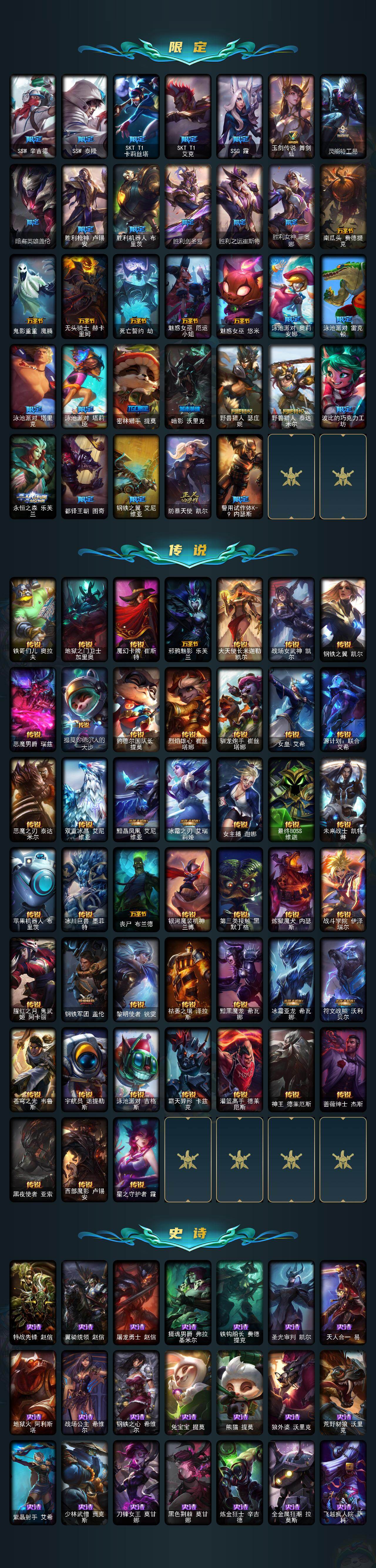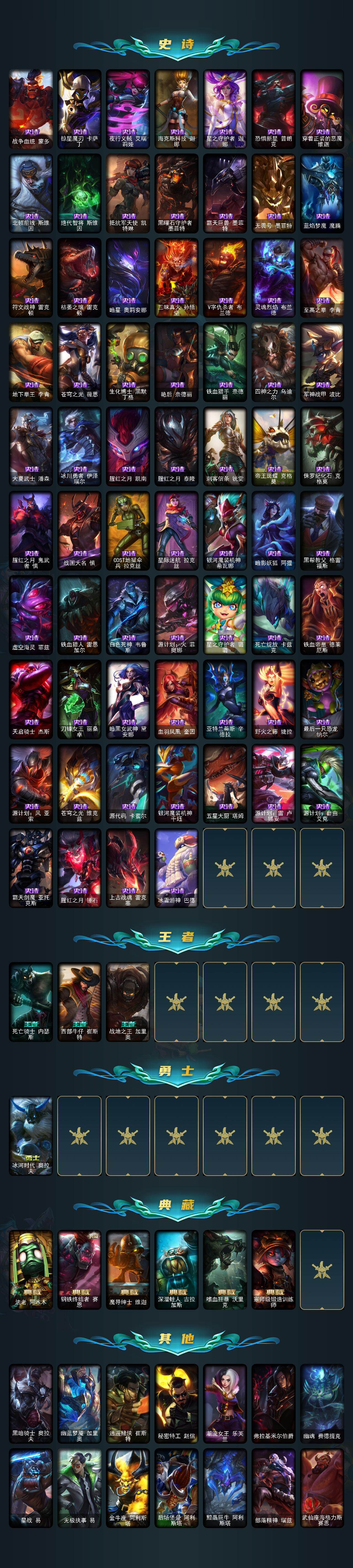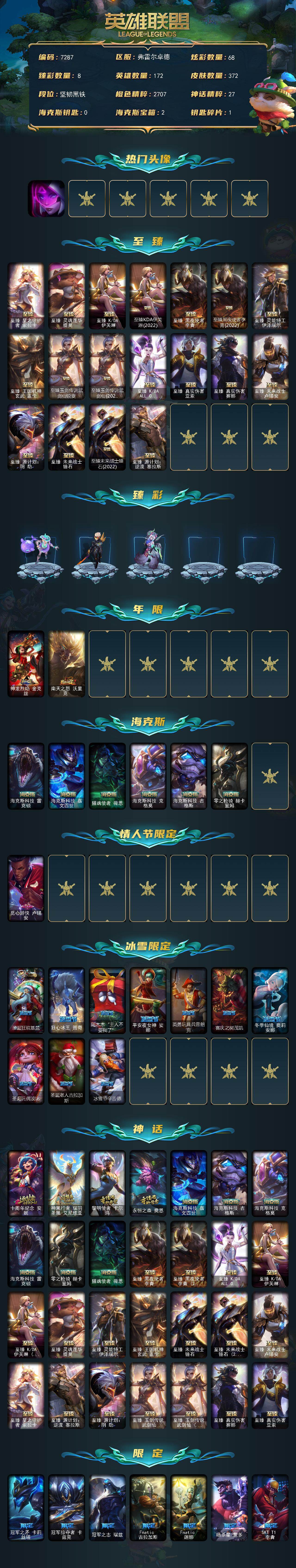 【皇冠号】未定级段位-172英雄-372皮肤-68炫彩-0终极-28神话-53限定-45传说-88史诗 【热门头像】:源计划刀妹头像 【至臻皮肤】:至臻星之守护者索拉卡,至臻灵魂莲华提莫,至臻kda伊芙琳,至臻kda伊芙琳2022,至臻黑夜使者李青,至臻黑夜使者李青2022,至臻灵能特工伊泽瑞尔,至臻王国机神玄武盖伦,至臻玉剑传说武剑仙锐雯,至臻玉剑传说武剑仙2022,至臻kdaallout卡莎,至臻真实伤害亚索,至臻真实伤害赛娜,至臻未来战士卢锡安,至臻源计划阴劫,至臻未来战士锤石,至臻未来战士锤石2022,至臻源计划逆流塞拉斯 【臻彩皮肤】:天龙之子卡莎飞龙乘云,泳池派对奥莉安娜优雅珠光鲸,源计划火菲奥娜惩戒,春晖神女艾希玉露金风,魔女阿卡丽虚荣,净雪之月莫甘娜冬虹,红莲之刃锐雯,霸天异形卡兹克丛林灾厄 【年限皮肤】:神龙烈焰金克丝,南天之怒沃里克 【海克斯皮肤】:海克斯科技雷克顿,海克斯科技嘉文四世,摄魂使者薇恩,海克斯科技克格莫,海克斯科技吉格斯,零之呛骑赫卡里姆 【情人节限定】:觅心游侠卢锡安 【冰雪限定】:圣诞狂欢基兰,狂心冰王图奇,阿木木“主人不要我了”,平安夜女神娑娜,英勇玩具兵普朗克,喜庆之树茂凯,冬季仙境奥莉安娜,圣诞玩偶波比,圣诞老人古拉加斯,冰雪节辛吉德 【神话皮肤】:十周年纪念安妮,神凰行者瑞羽圣凰艾尼维亚,黎明使者卡尔玛,永恒之森奥恩,海克斯科技嘉文四世,海克斯科技吉格斯,海克斯科技克格莫,海克斯科技雷克顿,零之呛骑赫卡里姆,摄魂使者薇恩,至臻真实伤害赛娜,至臻真实伤害亚索,至臻黑夜使者李青,至臻黑夜使者李青2022,至臻kdaallout卡莎,至臻kda伊芙琳,至臻kda伊芙琳2022,至臻灵魂莲华提莫,至臻灵能特工伊泽瑞尔,至臻王国机神玄武盖伦,至臻未来战士锤石,至臻未来战士锤石2022,至臻未来战士卢锡安,至臻星之守护者索拉卡,至臻源计划逆流塞拉斯,至臻源计划阴劫,至臻玉剑传说武剑仙,至臻玉剑传说武剑仙2022 【限定皮肤】:冠军之矛卡莉丝塔,冠军掠夺者卡兹克,冠军之志瑞兹,fnatic古拉加斯,fnatic迦娜,暗杀星蒙多,sktt1李青,ssw辛吉德,ssw泰隆,sktt1卡莉丝塔,sktt1艾克,ssg霞,玉剑传说舞剑仙,灵能特工易,暗裔英雄盖伦,胜利呛神卢锡安,胜利机器人布里茨,胜利剑圣易,胜利之运崔斯特,胜利女神菲奥娜,南瓜头费德提克,鬼影重重魔腾,无头骑士赫卡里姆,死亡誓约劫,魅惑女巫厄运小姐,魅惑女巫悠米,泳池派对奥莉安娜,泳池派对雷克顿,泳池派对塔里克,泳池派对塔莉垭,密林猎手提莫,暗影沃里克,野兽猎人瑟庄妮,野兽猎人泰达米尔,波比的巧克力工坊,永恒之森乐芙兰,都铎王朝图奇,钢铁之翼艾尼维亚,防暴天使凯尔,警用试作体k9内瑟斯 【传说皮肤】:铁哥们儿奥拉夫,地狱之门卫士加里奥,魔幻卡牌崔斯特,邪鸦魅影乐芙兰,大天使长米迦勒凯尔,战场女武神凯尔,钢铁之翼凯尔,恶魔男爵瑞兹,提莫约德尔人的一大步,约德尔国队长提莫,烈焰雄心崔丝塔娜,驯龙炮手崔丝塔娜,女皇艾希,源计划联合艾希,恶魔之刃泰达米尔,双重冰晶艾尼维亚,黯晶凤凰艾尼维亚,冰霜之刃艾瑞莉娅,女主播迦娜,最终boss维迦,未来战士凯特琳,苹果机器人布里茨,冰川巨兽墨菲特,丧尸布兰德,银河魔装机神兰博,第三类接触黑默丁格,炼狱魔犬内瑟斯,战斗学院伊泽瑞尔,腥红之月鬼武姬阿卡丽,钢铁军团盖伦,黎明使者锐雯,枯萎之壤泽拉斯,黯黑魔龙希瓦娜,冰霜亚龙希瓦娜,符文战熊沃利贝尔,苍穹之光韦鲁斯,宇航员诺提勒斯,泳池派对吉格斯,霸天异形卡兹克,灌篮高手德莱厄斯,神王德莱厄斯,蔷薇绅士杰斯,黑夜使者亚索,西部魔影卢锡安,星之守护者霞 【史诗皮肤】:特战先锋赵信,翼骑统领赵信,屠龙勇士赵信,摄魂男爵弗拉基米尔,铁钩船长费德提克,圣光审判凯尔,天人合一易,地狱火阿利斯塔,战场公主希维尔,钢铁之心希维尔,兔宝宝提莫,熊猫提莫,狼外婆沃里克,荒野豺狼沃里克,紫晶射手艾希,少林武僧贾克斯,刀锋女王莫甘娜,黑色荆棘莫甘娜,炼金狂士辛吉德,全金属狂潮拉莫斯,飞越疯人院萨科,战争血统蒙多,掠星魔刃卡萨丁,夜行义贼艾瑞莉娅,海克斯科技迦娜,星之守护者迦娜,恐惧新星普朗克,穿着正装的恶魔维迦,北领前线斯维因,绝代智将斯维因,抵抗军天使凯特琳,黑曜石守护者墨菲特,霸天巨兽墨菲特,无畏号墨菲特,蓝焰梦魔魔腾,符文战神雷克顿,枯萎之壤雷克顿,暗星奥莉安娜,三昧真火孙悟空,v字仇杀者布兰德,灵魂烈焰布兰德,至高之拳李青,地下拳王李青,苍穹之光薇恩,生化博士黑默丁格,艳后奈德丽,铁血猎手奈德丽,四神之力乌迪尔,军神战甲波比,大夏武士潘森,冰川勇者伊泽瑞尔,腥红之月凯南,腥红之月泰隆,刺客信条锐雯,帝王斑蝶克格莫,侏罗纪化石克格莫,腥红之月鬼武者慎,战国大名慎,odst地狱伞兵拉克丝,星际迷航拉克丝,银河魔装机神希瓦娜,暗影妖狐阿狸,黑帮教父格雷福斯,虚空海灵菲兹,铁血猎人雷恩加尔,白色死神韦鲁斯,源计划火菲奥娜,星之守护者璐璐,死亡绽放卡兹克,铁血帝皇德莱厄斯,天启骑士杰斯,刀锋女王丽桑卓,暗黑女武神黛安娜,血羽凤凰奎因,亚特兰蒂斯辛德拉,野火之藤婕拉,最后一只恐龙纳尔,源计划风亚索,苍穹之光维克兹,源代码卡蜜尔,银河魔装机神千珏,五星大厨塔姆,源计划雷卢锡安,源计划自由艾克,霸天剑魔亚托克斯,腥红之月锤石,上古战魂雷克塞,冰雪游神巴德 【王者皮肤】:死亡骑士内瑟斯,西部牛仔崔斯特,战地之王