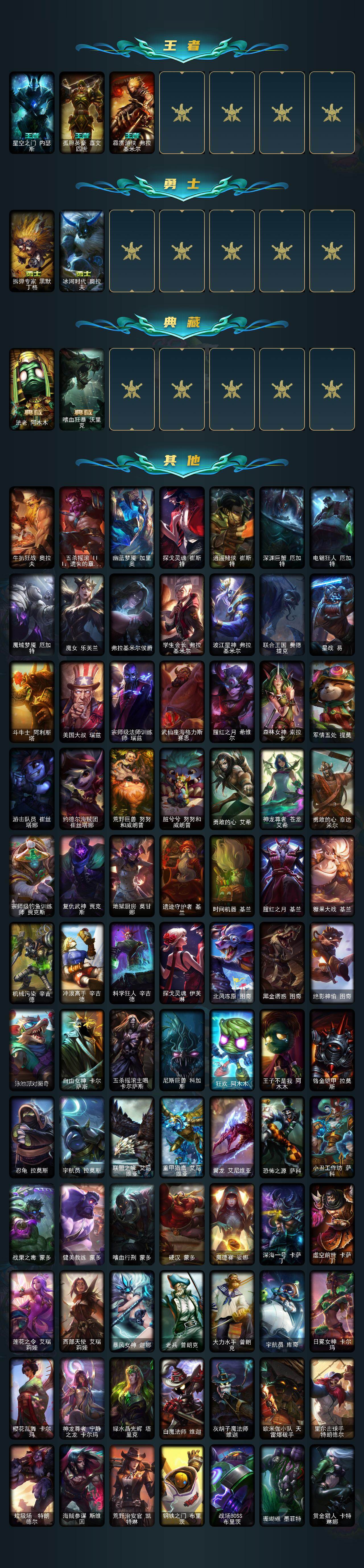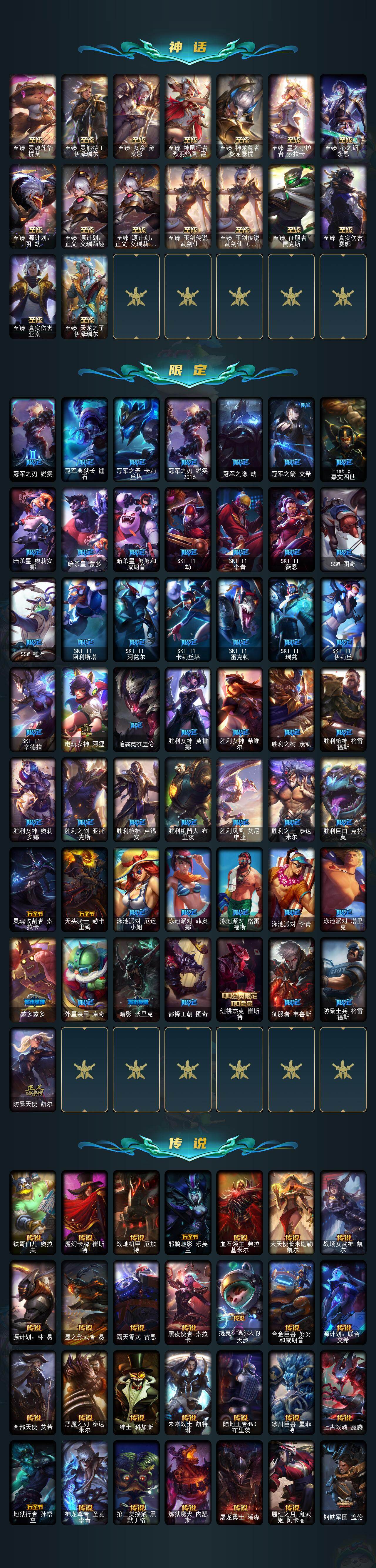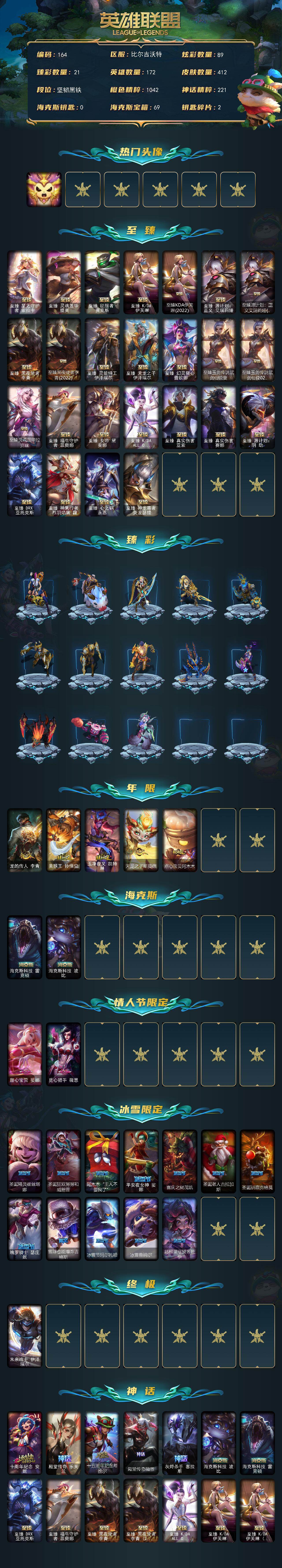【164】未定级段位-172英雄-412皮肤-89炫彩-1终极-32神话-69限定-39传说-85史诗 【热门头像】:星守索拉卡头像 【至臻皮肤】:至臻星之守护者索拉卡,至臻灵魂莲华提莫,至臻征服者贾克斯,至臻kda伊芙琳,至臻kda伊芙琳2022,至臻源计划正义艾瑞莉娅,至臻源计划:正义艾瑞莉娅2022,至臻黑夜使者李青,至臻黑夜使者李青2022,至臻灵能特工伊泽瑞尔,至臻天龙之子伊泽瑞尔,至臻幻灵狮心蕾欧娜,至臻玉剑传说武剑仙锐雯,至臻玉剑传说武剑仙2022,至臻灵魂莲华拉克丝,至臻福牛守护者菲奥娜,至臻女帝黛安娜,至臻kdaallout卡莎,至臻真实伤害亚索,至臻真实伤害赛娜,至臻源计划阴劫,至臻drx亚托克斯,至臻神凰行者烈羽焰凰霞,至臻心之钢永恩,至臻神龙尊者炎龙瑟提 【臻彩皮肤】:神龙烈焰金克丝珍珠龙息,天龙之子卡莎飞龙乘云,无畏骑士瑟庄妮赤子初心,冠军之箭艾希凯旋圣装,赵云子龙炫金将军,墨之影武者亚索金墨耀影,冠军之刃锐雯2016凯旋圣装,冠军典狱长锤石凯旋圣装,冠军之血希瓦娜凯旋圣装,冠军之隐劫凯旋圣装,神龙尊者圣龙李青龙腾云起,霸天异形卡兹克掠空魅影,星之守护者奥莉安娜未来之光,星之守护者金克丝黑洞,山海绘卷科加斯朱红,可爱可爱粉红红布里茨,殿堂传奇乐芙兰登神,魔女阿卡丽虚荣,净雪之月莫甘娜冬虹 【年限皮肤】:龙的传人李青,美猴王孙悟空,玉净夜叉凯特琳,天龙之子斯莫德,点心宝贝阿木木 【海克斯皮肤】:海克斯科技雷克顿,海克斯科技波比 【情人节限定】:甜心宝贝娑娜,觅心猎手薇恩 【冰雪限定】:圣诞精灵崔丝塔娜,圣诞狂欢努努和威朗普,阿木木“主人不要我了”,平安夜女神娑娜,喜庆之树茂凯,圣诞老人古拉加斯,圣诞驯鹿克格莫,魄罗骑士瑟庄妮,雪球也能爆炸吉格斯,冰雪节玛尔扎哈,冰雪兽纳尔,北极星守望者佐伊 【终极皮肤】:未来战士伊泽瑞尔 【神话皮肤】:十周年纪念安妮,殿堂传奇乐芙兰,十五周年纪念希维尔,殿堂传奇薇恩,灰烬杀手塞拉斯,海克斯科技波比,海克斯科技雷克顿,至臻征服者贾克斯,至臻真实伤害赛娜,至臻真实伤害亚索,至臻天龙之子伊泽瑞尔,至臻drx亚托克斯,至臻福牛守护者菲奥娜,至臻黑夜使者李青,至臻黑夜使者李青2022,至臻kdaallout卡莎,至臻kda伊芙琳,至臻kda伊芙琳2022,至臻灵魂莲华提莫,至臻灵能特工伊泽瑞尔,至臻女帝黛安娜,至臻神凰行者烈羽焰凰霞,至臻神龙尊者炎龙瑟提,至臻星之守护者索拉卡,至臻心之钢永恩,至臻源计划阴劫,至臻源计划正义艾瑞莉娅,至臻源计划正义艾瑞莉娅2022,至臻玉剑传说武剑仙,至臻玉剑传说武剑仙2022 【限定皮肤】:冠军之刃锐雯,冠军典狱长锤石,冠军之矛卡莉丝塔,冠军之刃锐雯2016,冠军之隐劫,冠军之箭艾希,fnatic嘉文四世,暗杀星奥莉安娜,暗杀星蒙多,暗杀星努努和威朗普,sktt1劫,sktt1李青,sktt1薇恩,ssw图奇,ssw锤石,sktt1阿利斯塔,sktt1阿兹尔,sktt1卡莉丝塔,sktt1雷克顿,sktt1瑞兹,sktt1伊莉丝,sktt1辛德拉,电玩女神阿狸,暗裔英雄盖伦,胜利女神莫甘娜,胜利女神希维尔,胜利之树茂凯,胜利呛神格雷福斯,胜利女神奥莉安娜,胜利之剑亚托克斯,胜利呛神卢锡安,胜利机器人布里茨,胜利凤凰艾尼维亚,胜利之王泰达米尔,胜利巨口克格莫,灵魂收割者索拉卡,无头骑士赫卡里姆,泳池派对厄运小姐,泳池派对菲奥娜,泳池派对格雷福斯,泳池派对李青,泳池派对塔里克,蒙多蒙多,外星装甲库奇,暗影沃里克,都铎王朝图奇,红桃杰克崔斯特,征服者韦鲁斯,防暴士兵格雷福斯,防暴天使凯尔 【传说皮肤】:铁哥们儿奥拉夫,魔幻卡牌崔斯特,战地机甲厄加特,邪鸦魅影乐芙兰,血石领主弗拉基米尔,大天使长米迦勒凯尔,战场女武神凯尔,源计划林易,墨之影武者易,霸天零式赛恩,黑夜使者索拉卡,提莫约德尔人的一大步,合金巨兽努努和威朗普,源计划联合艾希,西部天使艾希,恶魔之刃泰达米尔,绅士科加斯,未来战士凯特琳,陆地王者4wd布里茨,冰川巨兽墨菲特,上古战魂魔腾,地狱行者孙悟空,神龙尊者圣龙李青,第三类接触黑默丁格,炼狱魔犬内瑟斯,屠龙勇士潘森,腥红之月鬼武姬阿卡丽,钢铁军团盖伦,暗星女王拉克丝,焰尾妖狐阿狸,偶像歌手阿狸,金牌主播德莱文,霸天异形卡兹克,灌篮高手德莱厄斯,蔷薇绅士杰斯,黑夜使者亚索,星之守护者金克丝,西部天使赛娜,西部魔影卢锡安 【史诗皮肤】:绞肉机角斗士赵信,翼骑统领赵信,摄魂男爵弗拉基米尔,圣光审判凯尔,天人合一易,战场公主希维尔,火箭达人崔丝塔娜,百夫长贾克斯,少林武僧贾克斯,侏罗纪化石科加斯,小小骑士阿木木,殇之机器人阿木木,熔火之心拉莫斯,贵族血统萨科,武动巅峰萨科,战争血统蒙多,掠星魔刃卡萨丁,特种部队普朗克,恐惧新星普朗克,血石诅咒塔里克,穿着正装的恶魔维迦,抵抗军天使凯特琳,古墓丽影凯特琳,铁血狙击手凯特琳,霸天巨兽墨菲特,暗夜猫女卡特琳娜,源计划雄心卡特琳娜,符文战神雷克顿,枯萎之壤雷克顿,死亡绽放伊莉丝,腥红之月伊莉丝,防弹武僧李青,至高之拳李青,地下拳王李青,屠龙勇士薇恩,苍穹之光薇恩,生化博士黑默丁格,法老王朝内瑟斯,艳后奈德丽,铁血猎手奈德丽,四神之力乌迪尔,军神战甲波比,血色之锤波比,飞车暴走族古拉加斯,实习护士阿卡丽,铁血女忍阿卡丽,铁甲雄心盖伦,血色精锐锐雯,兔女郎锐雯,帝王斑蝶克格莫,侏罗纪化石克格莫,odst地狱伞兵拉克丝,骸骨之爪希瓦娜,银河魔装机神希瓦娜,黑帮教父格雷福斯,
