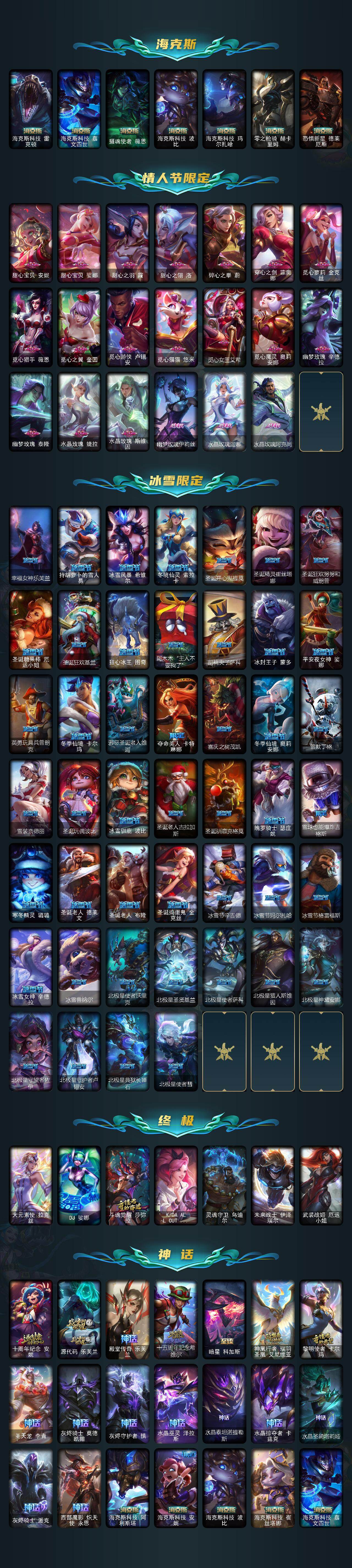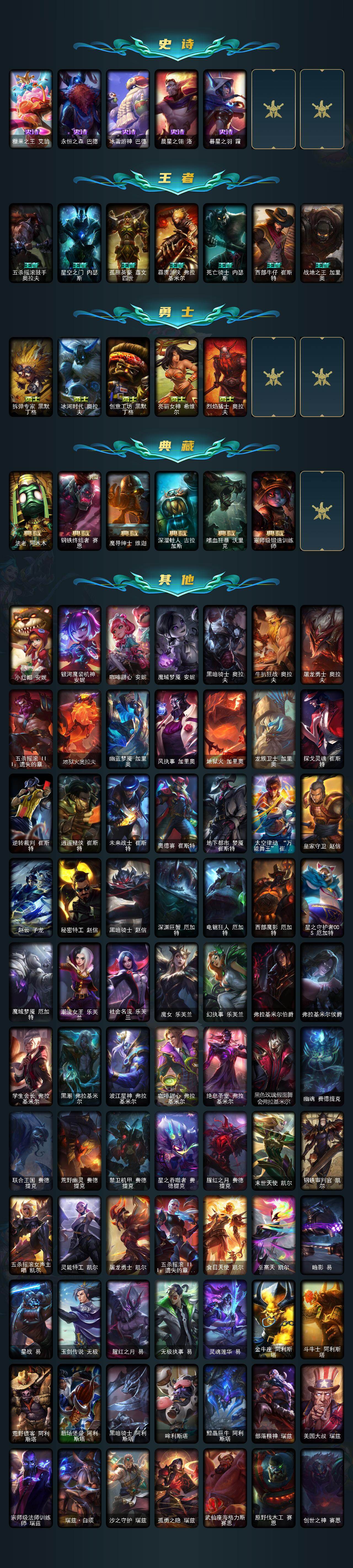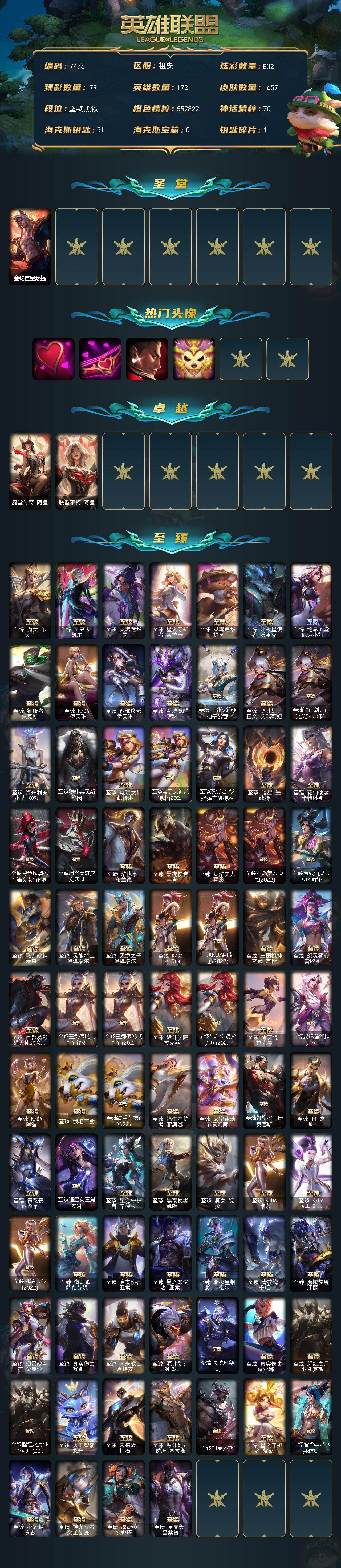 【联盟不朽阿狸签名版,,金蛇巨星瑟提,西部魔影炽天使永恩,龙瞎三炫彩,皇冠号】未定级段位-172英雄-1657皮肤-832炫彩-9终极-111神话-339限定-125传说-215史诗 【圣堂皮肤】:金蛇巨星瑟提 【热门头像】:爱意绵绵头像,爱情之歌头像,觅心游侠卢锡安头像,星守索拉卡头像 【卓越皮肤】:殿堂传奇阿狸,联盟不朽阿狸,签名版联盟不朽阿狸 【至臻皮肤】:至臻魔女乐芙兰,至臻至高天凯尔,至臻灵魂莲华易,至臻星之守护者索拉卡,至臻灵魂莲华提莫,至臻北极星使者沃里克,至臻绝息圣堂厄运小姐,至臻征服者贾克斯,至臻kda伊芙琳,至臻西部魔影伊芙琳,至臻斗魂觉醒萨科,至臻玉剑传说琴仙子娑娜,至臻源计划正义艾瑞莉娅,至臻源计划:正义艾瑞莉娅2022,至臻海珀利安小队x09星环灵风迦娜,至臻狼神英灵斯维因,至臻电玩女神凯特琳,至臻电玩女神凯特琳2022,至臻双城之战2指挥官凯特琳,至臻暗星墨菲特,至臻花仙使者卡特琳娜,至臻黑色玫瑰假面舞会卡特琳娜,至臻暗裔英雄嘉文四世,至臻焰执事布兰德,至臻黑夜使者李青,至臻烈焰美人薇恩,至臻烈焰美人薇恩2022,至臻剪纸仙灵卡西奥佩娅,至臻飞升战神潘森,至臻灵能特工伊泽瑞尔,至臻天龙之子伊泽瑞尔,至臻kda阿卡丽,至臻kda阿卡丽2022,至臻王国机神玄武盖伦,至臻幻灵狮心蕾欧娜,至臻西部魔影猎天使恶魔泰隆,至臻玉剑传说武剑仙锐雯,至臻玉剑传说武剑仙2022,至臻战斗学院拉克丝,至臻战斗学院拉克丝2022,至臻青花瓷拉克丝,至臻灵魂莲华拉克丝,至臻kda阿狸,至臻绒毛菲兹,至臻绒毛菲兹2022,至臻福牛守护者菲奥娜,至臻太空律动节奏幻师璐璐,至臻凯旋将军德莱厄斯,至臻t1杰斯,至臻青花瓷丽桑卓,至臻暗星女王黛安娜,至臻星之守护者辛德拉,至臻黑夜使者凯隐,至臻魔女婕拉,至臻kda卡莎,至臻kdaallout卡莎,至臻kda卡莎2022,至臻海之歌萨勒芬妮,至臻真实伤害亚索,至臻墨之影武者亚索,至臻北极星钢影卡蜜尔,至臻青花瓷千珏,至臻魔域梦魇泽丽,至臻幻灵战斗猫金克丝,至臻真实伤害赛娜,至臻未来战士卢锡安,至臻源计划阴劫,至臻灵魂莲华劫,至臻真实伤害奇亚娜,至臻腥红之月亚托克斯,至臻腥红之月亚托克斯2022,至臻人工智能悠米,至臻未来战士锤石,至臻源计划逆流塞拉斯,至臻t1塞拉斯,至臻星之守护者妮蔻,至臻莲华温泉厄斐琉斯,至臻心之钢永恩,至臻神龙尊者炎龙瑟提,至臻魂蔷薇烈娜塔,至臻至高天奎桑提 【臻彩皮肤】:龙的传人李青飞龙在天,龙的传人李青龙战于野,龙的传人李青潜龙勿用,皓彩霓裳嫦娥,银龙裁决泰隆潜龙在渊,神龙之翼库奇飞龙腾云,天龙之子易云起龙骧,剪纸仙灵嘉文四世日进斗金,古琴余韵娑娜龙神天籁,定海神珍孙悟空四海扬威,天龙之子黛安娜玉龙舞夜,剪纸仙灵娜美吉祥如意,天龙之子迦娜蛟龙得水,天龙之子卡莎矫若惊龙,天龙之子卡莎飞龙乘云,无畏骑士瑟庄妮赤子初心,冠军之箭艾希凯旋圣装,玉剑传说无极白虎,张辽文远炫金将军,墨之影武者亚索金墨耀影,南天之怒沃里克炫金天神,墨之影武者易金墨耀影,雾雨之刃锐雯,偶像歌手阿狸极地雪莲,墨之影武者永恩云墨漾影,斗魂觉醒格温幻之魂焰,神龙尊者圣龙李青登龙,怦然心动凯特琳未相见心已至,sktt1辛德拉至强,殿堂传奇乐芙兰至强,西部魔影永恩忠诚,幻灵白鸽萨勒芬妮梦幻强袭,青花瓷艾瑞莉娅釉色,花仙子拉克丝纹白,青花瓷艾瑞莉娅月色,霸天战士雷恩加尔星啸天火,玉剑传说无影竞星,泳池派对菲奥娜清凉苹果冰,星之守护者奥莉安娜未来之光,咖啡甜心金克丝核桃巴菲,玉剑传说翼剑仙珠光,咖啡甜心兰博核桃巴菲,净雪之月阿狸水竹,幻灵战斗蝠薇恩梦幻强袭,泳池派对奥莉安娜优雅珠光鲸,灵魂莲华锐雯流火,星之守护者霞烈羽,最终boss维迦里大魔王,玉剑传说寒潭夭夭胭脂,破败军团厄运小姐灵岛征伐使,可爱可爱粉红红布里茨,殿堂传奇乐芙兰登神,春晖神女艾希玉露金风,咖啡甜心格温酒醉樱桃,咖啡甜心波比焦糖布丁,魔女辛德拉饕餮,魔女阿卡丽虚荣,净雪之月莫甘娜冬虹,幻灵战斗兔阿萝拉梦幻强袭,咖啡甜心金克丝提子班戟,玉剑传说星仙子丁香,幻灵孤狼亚索魅影闪击,幽梦玫瑰辛德拉纯洁花蕾,青花瓷厄运小姐月色,心之钢伊泽瑞尔锐意曲风,花仙子崔丝塔娜蓝闪,咖啡甜心璐璐海盐泡芙,幽梦玫瑰伊莉丝浪漫花蕾,斗魂觉醒烬幻之魂焰,北极星钢影卡蜜尔智慧纽带,心之钢伊泽瑞尔天纵才华 【年限皮肤】:龙的传人李青,银龙裁决泰隆,古琴余韵娑娜,定海神珍孙悟空,醒狮克格莫,你看见过我的熊猫吗安妮,碧玉之牙卡西奥佩娅,神龙之翼库奇,替父从军花木兰,广寒仙子嫦娥,神龙烈焰金克丝,美猴王孙悟空,紫金罗刹莫甘娜,玉净夜叉凯特琳,张辽文远,司马懿仲达,虎痴之拳蔚,南天之怒沃里克,北辰之威内瑟斯,春晖神女拉克丝,金猪烈焰瑟庄妮,烈焰美人薇恩,纳财大帝塔姆,王国机神青龙德莱文,王国机神朱雀蕾欧娜,王国机神苍狼瑟提,王国机神白虎贾克斯,王国机神玄武盖伦,福牛守护者安妮,福牛守护者厄斐琉斯,福牛守护者德莱厄斯,福牛守护者阿利斯塔,福牛守护者嘉文四世,福牛守护者菲奥娜,猛虎下山赵信,招财进宝提莫,虎头虎脑崔丝塔娜,烈焰仙子黛安娜,龙腾虎跃瑟提,剪纸仙灵艾瑞莉娅,剪纸仙灵加里奥,剪纸仙灵希维尔,剪纸仙灵盖伦,剪纸仙灵婕拉,天龙之子李青,天龙之子易,天龙之子迦娜,天龙之子伊泽瑞尔,天龙之子黛安娜,天龙之子卡莎,天