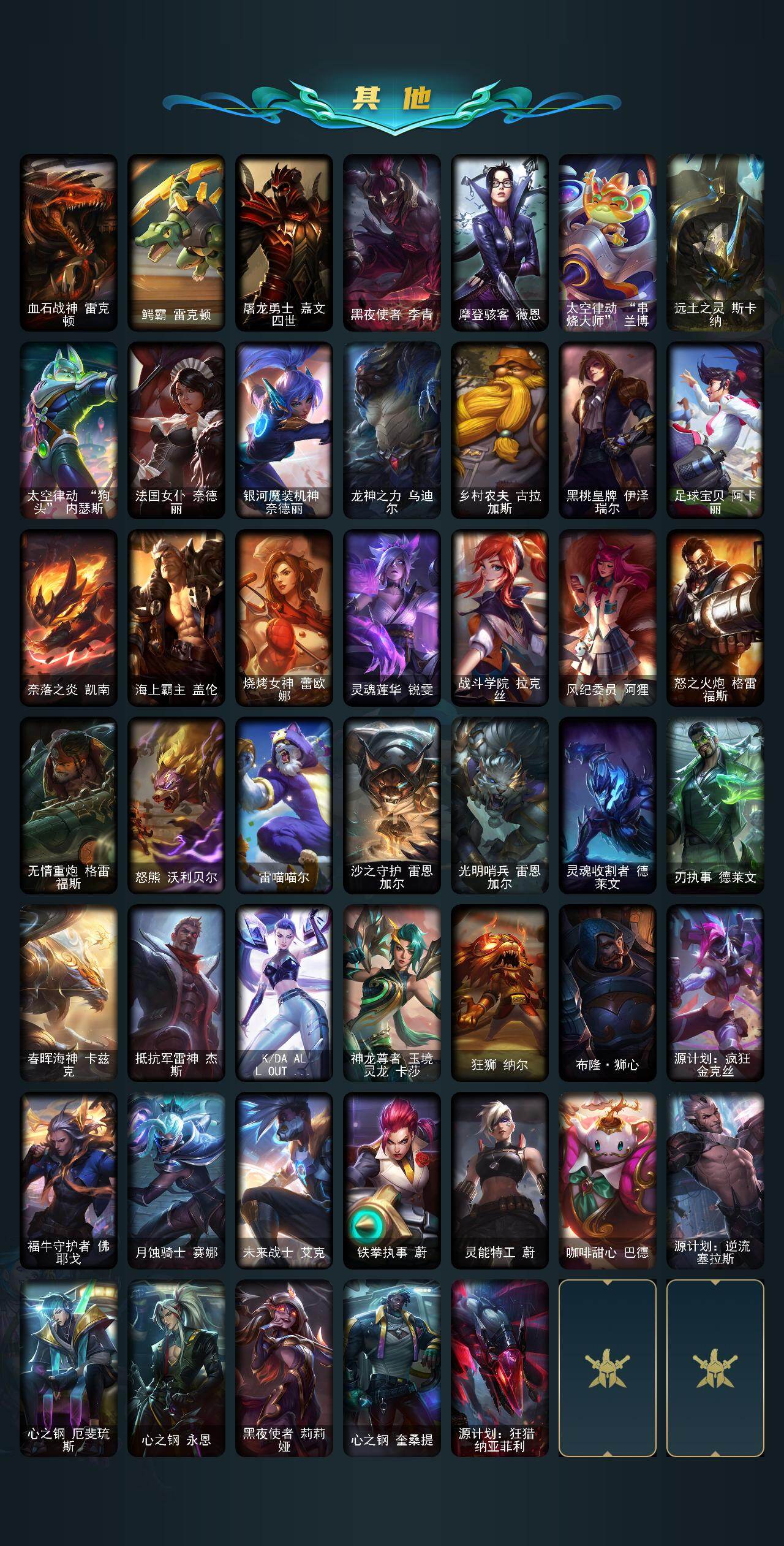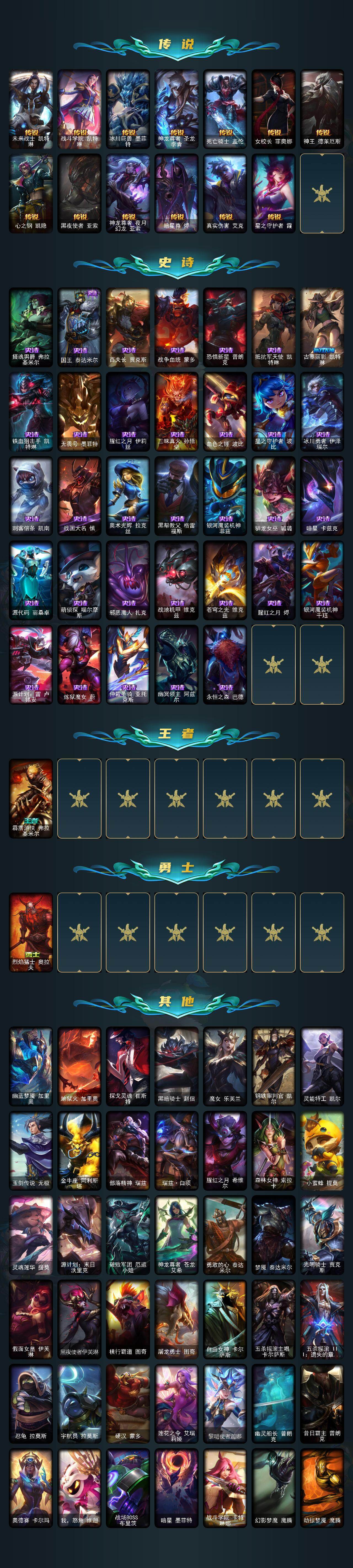 白银段位-170英雄-190皮肤-78炫彩-3终极-10神话-35限定-20传说-33史诗 【热门头像】:爱情之歌头像 【至臻皮肤】:至臻灵魂莲华易,至臻源计划正义艾瑞莉娅,至臻焰执事布兰德,至臻魔女阿卡丽,至臻源计划阴劫,至臻灵魂莲华劫,至臻神凰行者烈羽焰凰霞 【臻彩皮肤】:无畏骑士瑟庄妮赤子初心,赵云子龙炫金将军,冠军之志瑞兹凯旋圣装,玉剑传说无极麒麟,可爱可爱粉红红布里茨,魔女阿卡丽虚荣,西部魔影执行人卡特琳娜纯洁 【年限皮肤】:银龙裁决泰隆,定海神珍孙悟空,神龙烈焰金克丝,王国机神青龙德莱文,王国机神玄武盖伦,福牛守护者安妮,龙腾虎跃瑟提,天龙之子斯莫德 【海克斯皮肤】:摄魂使者薇恩 【情人节限定】:甜心之翎洛 【冰雪限定】:圣诞精灵崔丝塔娜,阿木木“主人不要我了”,平安夜女神娑娜,夺命美人卡特琳娜,圣诞老人古拉加斯,魄罗骑士瑟庄妮,雪球也能爆炸吉格斯 【终极皮肤】:kdaallout萨勒芬妮独立音乐人 【神话皮肤】:神凰行者瑞羽圣凰艾尼维亚,殿堂传奇薇恩,摄魂使者薇恩,至臻灵魂莲华易,至臻魔女阿卡丽,至臻神凰行者烈羽焰凰霞,至臻焰执事布兰德,至臻源计划阴劫,至臻源计划正义艾瑞莉娅 【限定皮肤】:fnatic古拉加斯,sktt1贾克斯,sktt1婕拉,ssw泰隆,sktt1雷克顿,ssg塔莉垭,安妮梦游仙境,玉剑传说神机花火,暗裔英雄盖伦,胜利之王泰达米尔,胜利巨口克格莫,胜利女神菲奥娜,克烈古拉伯爵,魅惑女巫奈德丽,泳池派对奥莉安娜,泳池派对格雷福斯,外星装甲库奇,玉剑传说翼剑仙,警用试作体k9内瑟斯 【传说皮肤】:铁哥们儿奥拉夫,地狱之门卫士加里奥,大天使长米迦勒凯尔,约德尔国队长提莫,烈焰雄心崔丝塔娜,女皇艾希,西部天使艾希,未来战士凯特琳,战斗学院凯特琳,冰川巨兽墨菲特,神龙尊者圣龙李青,死亡骑士盖伦,女校长菲奥娜,神王德莱厄斯,心之钢凯隐,黑夜使者亚索,神龙尊者夜月幻龙亚索,暗星尊烬,真实伤害艾克,星之守护者霞 【史诗皮肤】:摄魂男爵弗拉基米尔,国王泰达米尔,百夫长贾克斯,战争血统蒙多,恐惧新星普朗克,抵抗军天使凯特琳,古墓丽影凯特琳,铁血狙击手凯特琳,无畏号墨菲特,腥红之月伊莉丝,三昧真火孙悟空,血色之锤波比,星之守护者波比,冰川勇者伊泽瑞尔,刺客信条凯南,战国大名慎,奥术光辉拉克丝,黑帮教父格雷福斯,银河魔装机神菲兹,驯龙女巫璐璐,暗星卡兹克,源代码丽桑卓,萌侦探喵尔摩斯,邪恶魔人扎克,战地机甲维克兹,苍穹之光维克兹,腥红之月烬,银河魔装机神千珏,源计划雷卢锡安,炼狱魔女蔚,仲裁圣骑亚托克斯,幽冥领主阿兹尔,永恒之森巴德 【王者皮肤】:霹雳游侠弗拉基米尔 【勇士皮肤】:烈焰猛士奥拉夫 【其他皮肤1】:幽蓝梦魇加里奥,地狱火加里奥,探戈灵魂崔斯特,黑暗骑士赵信,魔女乐芙兰,钢铁审判官凯尔,灵能特工凯尔,玉剑传说无极,金牛座阿利斯塔,部落精神瑞兹,瑞兹白须,腥红之月希维尔,森林女神索拉卡,小蜜蜂提莫,灵魂莲华提莫,源计划末日沃里克,破败军团厄运小姐,神龙尊者苍龙艾希,勇敢的心泰达米尔,梦魇泰达米尔,光明骑士贾克斯,假面女皇伊芙琳,黑夜使者伊芙琳,横行霸道图奇,屠龙勇士图奇,自由女神卡尔萨斯,五杀摇滚主唱卡尔萨斯,五杀摇滚iii遗失的章节卡尔萨斯,忍龟拉莫斯,宇航员拉莫斯,硬汉蒙多,莲花之令艾瑞莉娅,黎明使者迦娜,幽灵船长普朗克,昔日霸主普朗克,奥德赛卡尔玛,我怒角维迦,战场boss布里茨,暗星墨菲特,战斗学院卡特琳娜,幻影梦魔魔腾,劫掠梦魇魔腾,血石战神雷克顿,鳄霸雷克顿,屠龙勇士嘉文四世,黑夜使者李青,摩登骇客薇恩,太空律动串烧大师兰博,远土之灵斯卡纳,太空律动狗头内瑟斯,法国女仆奈德丽,银河魔装机神奈德丽,龙神之力乌迪尔,乡村农夫古拉加斯,黑桃皇牌伊泽瑞尔,足球宝贝阿卡丽,奈落之炎凯南,海上霸主盖伦,烧烤女神蕾欧娜,灵魂莲华锐雯,战斗学院拉克丝,风纪委员阿狸,怒之火炮格雷福斯,无情重炮格雷福斯,怒熊沃利贝尔,雷喵喵尔,沙之守护雷恩加尔,光明哨兵雷恩加尔,灵魂收割者德莱文,刃执事德莱文,春晖海神卡兹克,抵抗军雷神杰斯,kdaallout卡莎,神龙尊者玉境灵龙卡莎,狂狮纳尔,布隆狮心,源计划疯狂金克丝,福牛守护者佛耶戈,月蚀骑士赛娜,未来战士艾克,铁拳执事蔚,灵能特工蔚,咖啡甜心巴德,源计划逆流塞拉斯,心之钢厄斐琉斯,心之钢永恩,黑夜使者莉莉娅,心之钢奎桑提,源计划狂猎纳亚菲利