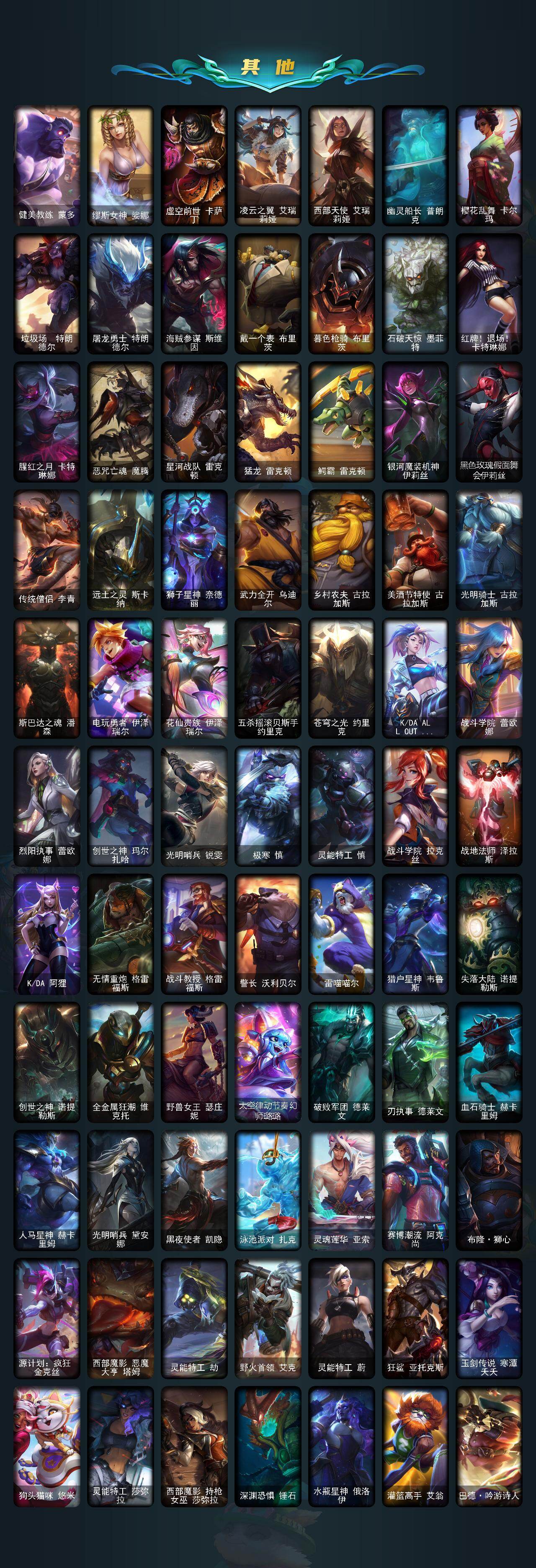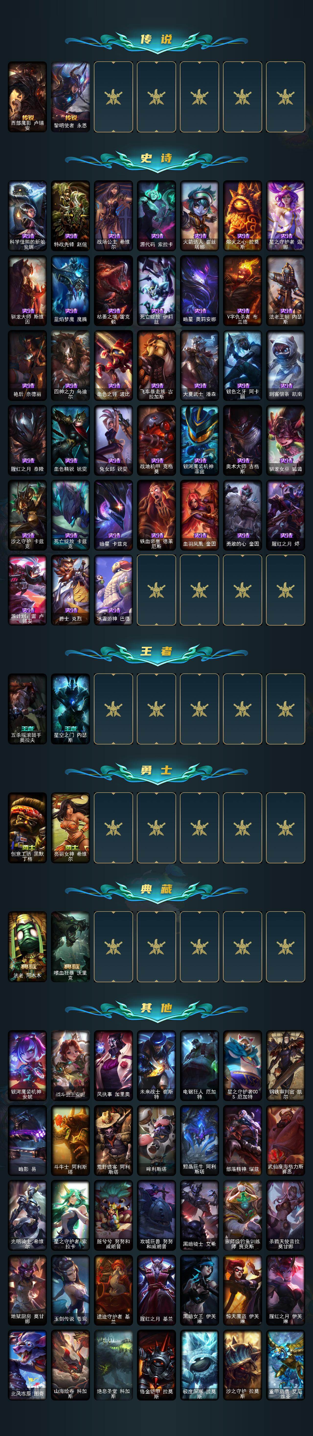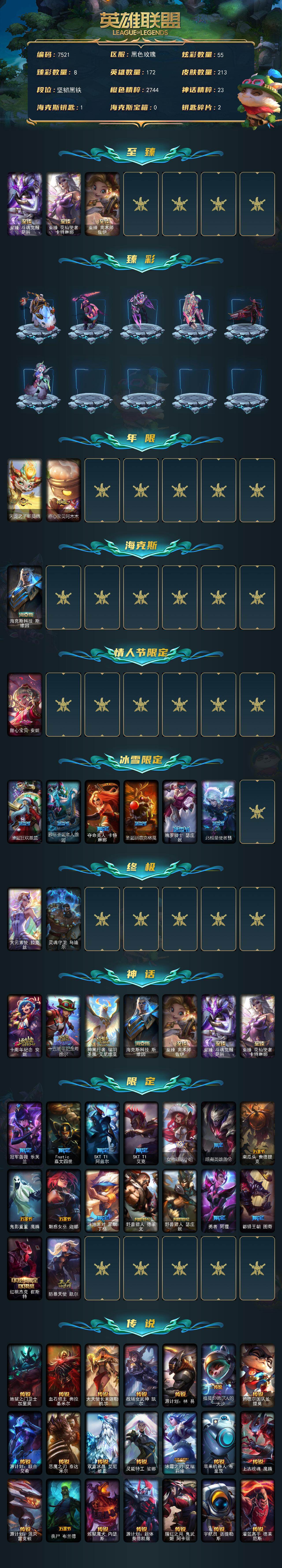 未定级段位-172英雄-213皮肤-55炫彩-2终极-7神话-25限定-23传说-38史诗 【至臻皮肤】:至臻斗魂觉醒萨科,至臻花仙使者卡特琳娜,至臻奥术师佐伊 【臻彩皮肤】:无畏骑士瑟庄妮赤子初心,源计划毁灭派克幻灭,天煞劫恒星游历者,幻灵战斗猫金克丝梦幻强袭,西部天使赛娜贝利尔之怠,魔女阿卡丽虚荣,净雪之月莫甘娜冬虹,心之钢伊泽瑞尔锐意曲风 【年限皮肤】:天龙之子斯莫德,点心宝贝阿木木 【海克斯皮肤】:海克斯科技斯维因 【情人节限定】:甜心宝贝安妮 【冰雪限定】:圣诞狂欢基兰,邪恶圣诞老人维迦,夺命美人卡特琳娜,圣诞驯鹿克格莫,魄罗骑士瑟庄妮,北极星使者彗 【终极皮肤】:大元素使拉克丝,灵魂守卫乌迪尔 【神话皮肤】:十周年纪念安妮,十五周年纪念希维尔,神凰行者瑞羽圣凰艾尼维亚,海克斯科技斯维因,至臻奥术师佐伊,至臻斗魂觉醒萨科,至臻花仙使者卡特琳娜 【限定皮肤】:冠军蔷薇乐芙兰,fnatic嘉文四世,sktt1阿兹尔,sktt1艾克,女帝厄运小姐,暗裔英雄盖伦,南瓜头费德提克,鬼影重重魔腾,魅惑女巫迦娜,泳池派对黑默丁格,野兽猎人德莱文,野兽猎人瑟庄妮,勇者阿狸,都铎王朝图奇,红桃杰克崔斯特,防暴天使凯尔 【传说皮肤】:地狱之门卫士加里奥,血石领主弗拉基米尔,大天使长米迦勒凯尔,战场女武神凯尔,源计划林易,提莫约德尔人的一大步,约德尔国队长提莫,源计划联合艾希,恶魔之刃泰达米尔,双重冰晶艾尼维亚,灵能特工娑娜,冰霜之刃艾瑞莉娅,苹果机器人布里茨,上古战魂魔腾,源计划泯灭雷克顿,丧尸布兰德,炼狱魔犬内瑟斯,源计划超体莫德凯撒,腥红之月鬼武姬阿卡丽,宇航员诺提勒斯,灌篮高手德莱厄斯,西部魔影卢锡安,黎明使者永恩 【史诗皮肤】:科学怪熊的新娘安妮,特战先锋赵信,战场公主希维尔,源代码索拉卡,火箭达人崔丝塔娜,熔火之心拉莫斯,星之守护者迦娜,驯龙大师斯维因,蓝焰梦魔魔腾,枯萎之壤雷克顿,死亡绽放伊莉丝,暗星奥莉安娜,v字仇杀者布兰德,法老王朝内瑟斯,艳后奈德丽,四神之力乌迪尔,血色之锤波比,飞车暴走族古拉加斯,大夏武士潘森,银色之牙阿卡丽,刺客信条凯南,腥红之月泰隆,血色精锐锐雯,兔女郎锐雯,战地机甲克格莫,银河魔装机神菲兹,奥术大师吉格斯,驯龙女巫璐璐,沙之守护卡兹克,死亡绽放卡兹克,暗星卡兹克,铁血帝皇德莱厄斯,血羽凤凰奎因,勇敢的心奎因,腥红之月烬,源计划雷卢锡安,爵士克烈,冰雪游神巴德 【王者皮肤】:五杀摇滚鼓手奥拉夫,星空之门内瑟斯 【勇士皮肤】:创意工坊黑默丁格,亮丽女神希维尔 【典藏皮肤】:法老阿木木,嗜血狂暴沃里克 【其他皮肤1】:银河魔装机神安妮,战斗公主安妮,风执事加里奥,未来战士崔斯特,电锯狂人厄加特,星之守护者cos厄加特,钢铁审判官凯尔,暗影易,斗牛士阿利斯塔,荒野镖客阿利斯塔,哞利斯塔,黯晶巨牛阿利斯塔,部落精神瑞兹,武仙座海格力斯赛恩,光明骑士希维尔,星之守护者索拉卡,脏兮兮努努和威朗普,攻城巨兽努努和威朗普,黑暗骑士艾希,宗师级钓鱼训练师贾克斯,杀戮天使昔拉莫甘娜,地狱厨房莫甘娜,玉剑传说苍鸾,遗迹守护者基兰,腥红之月基兰,黑暗女王伊芙琳,惊天魔盗伊芙琳,腥红之月伊芙琳,北风冻原图奇,山海绘卷科加斯,绝息圣堂科加斯,铬金铠甲拉莫斯,极度深寒拉莫斯,沙之守护拉莫斯,重甲猎鹰艾尼维亚,健美教练蒙多,缪斯女神娑娜,虚空前世卡萨丁,凌云之翼艾瑞莉娅,西部天使艾瑞莉娅,幽灵船长普朗克,樱花乱舞卡尔玛,垃圾场特朗德尔,屠龙勇士特朗德尔,海贼参谋斯维因,戴一个表布里茨,暮色呛骑布里茨,石破天惊墨菲特,红牌退场卡特琳娜,腥红之月卡特琳娜,恶咒亡魂魔腾,星河战队雷克顿,猛龙雷克顿,鳄霸雷克顿,银河魔装机神伊莉丝,黑色玫瑰假面舞会伊莉丝,传统僧侣李青,远土之灵斯卡纳,狮子星神奈德丽,武力全开乌迪尔,乡村农夫古拉加斯,美酒节特使古拉加斯,光明骑士古拉加斯,斯巴达之魂潘森,电玩勇者伊泽瑞尔,花仙贵族伊泽瑞尔,五杀摇滚贝斯手约里克,苍穹之光约里克,kdaallout阿卡丽,战斗学院蕾欧娜,烈阳执事蕾欧娜,创世之神玛尔扎哈,光明哨兵锐雯,极寒慎,灵能特工慎,战斗学院拉克丝,战地法师泽拉斯,kda阿狸,无情重炮格雷福斯,战斗教授格雷福斯,警长沃利贝尔,雷喵喵尔,猎户星神韦鲁斯,失落大陆诺提勒斯,创世之神诺提勒斯,全金属狂潮维克托,野兽女王瑟庄妮,太空律动节奏幻师璐璐,破败军团德莱文,刃执事德莱文,血石骑士赫卡里姆,人马星神赫卡里姆,光明哨兵黛安娜,黑夜使者凯隐,泳池派对扎克,灵魂莲华亚索,赛博潮流阿克尚,布隆狮心,源计划疯狂金克丝,西部魔影恶魔大亨塔姆,灵能特工劫,野火首领艾克,灵能特工蔚,狂鲨亚托克斯,玉剑传说寒潭夭夭,狗头猫咪悠米,灵能特工莎弥拉,西部魔影持呛女巫莎弥拉,深渊恐惧锤石,水瓶星神俄洛伊,灌篮高手艾翁,巴德吟游诗人