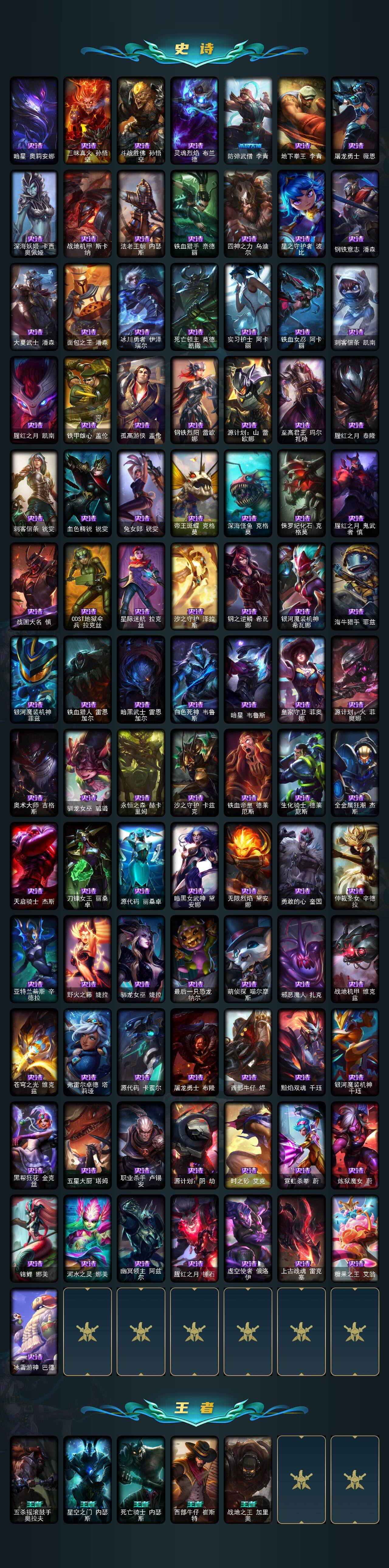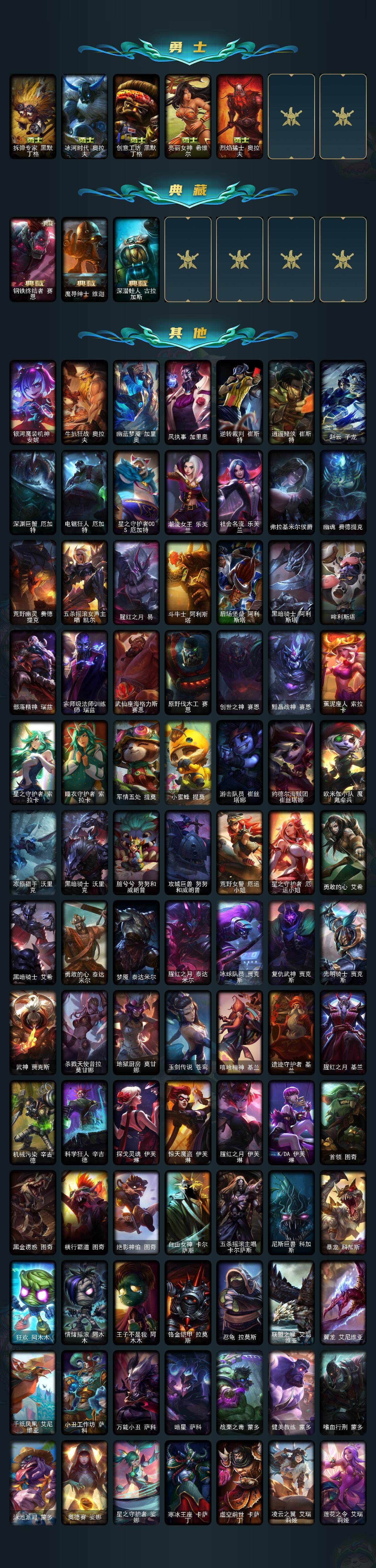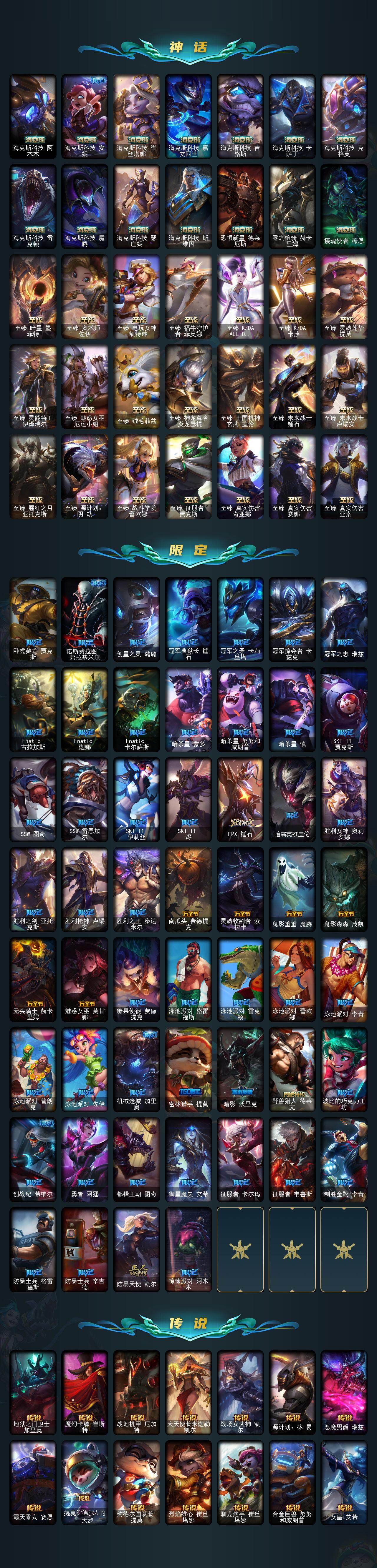 未定级段位-172英雄-619皮肤-111炫彩-1终极-42神话-79限定-56传说-155史诗 【热门头像】:爱意绵绵头像 【至臻皮肤】:至臻灵魂莲华提莫,至臻魅惑女巫厄运小姐,至臻征服者贾克斯,至臻电玩女神凯特琳,至臻暗星墨菲特,至臻灵能特工伊泽瑞尔,至臻王国机神玄武盖伦,至臻战斗学院蕾欧娜,至臻绒毛菲兹,至臻福牛守护者菲奥娜,至臻奥术师佐伊,至臻kda卡莎,至臻kdaallout卡莎,至臻真实伤害亚索,至臻真实伤害赛娜,至臻未来战士卢锡安,至臻源计划阴劫,至臻真实伤害奇亚娜,至臻腥红之月亚托克斯,至臻未来战士锤石,至臻神龙尊者炎龙瑟提 【臻彩皮肤】:无畏骑士瑟庄妮赤子初心,冠军之志瑞兹凯旋圣装,冠军典狱长锤石凯旋圣装,玉剑传说无影竞星 【年限皮肤】:银龙裁决泰隆,定海神珍孙悟空,碧玉之牙卡西奥佩娅,广寒仙子嫦娥,美猴王孙悟空,虎痴之拳蔚,南天之怒沃里克,烈焰美人薇恩,王国机神朱雀蕾欧娜,天龙之子斯莫德 【海克斯皮肤】:海克斯科技安妮,海克斯科技阿利斯塔,海克斯科技崔丝塔娜,海克斯科技阿木木,海克斯科技卡萨丁,海克斯科技斯维因,海克斯科技魔腾,海克斯科技雷克顿,海克斯科技嘉文四世,摄魂使者薇恩,海克斯科技克格莫,海克斯科技瑟庄妮,海克斯科技吉格斯,零之呛骑赫卡里姆,恐惧新星德莱厄斯 【情人节限定】:觅心猎手薇恩,觅心游侠卢锡安,幽梦玫瑰辛德拉 【冰雪限定】:幸福女神乐芙兰,圣诞开心鬼提莫,圣诞狂欢努努和威朗普,圣诞狂欢基兰,阿木木“主人不要我了”,胡桃夹子萨科,平安夜女神娑娜,英勇玩具兵普朗克,邪恶圣诞老人维迦,雪默丁格,圣诞玩偶波比,魄罗骑士瑟庄妮,冰雪节玛尔扎哈 【终极皮肤】:灵魂守卫乌迪尔 【神话皮肤】:十周年纪念安妮,源代码乐芙兰,十五周年纪念希维尔,暗星科加斯,神凰行者瑞羽圣凰艾尼维亚,黎明使者卡尔玛,海克斯科技阿利斯塔,海克斯科技阿木木,海克斯科技安妮,海克斯科技崔丝塔娜,海克斯科技嘉文四世,海克斯科技吉格斯,海克斯科技卡萨丁,海克斯科技克格莫,海克斯科技雷克顿,海克斯科技魔腾,海克斯科技瑟庄妮,海克斯科技斯维因,恐惧新星德莱厄斯,零之呛骑赫卡里姆,摄魂使者薇恩,至臻征服者贾克斯,至臻真实伤害奇亚娜,至臻真实伤害赛娜,至臻真实伤害亚索,至臻暗星墨菲特,至臻奥术师佐伊,至臻电玩女神凯特琳,至臻福牛守护者菲奥娜,至臻kdaallout卡莎,至臻kda卡莎,至臻灵魂莲华提莫,至臻灵能特工伊泽瑞尔,至臻魅惑女巫厄运小姐,至臻绒毛菲兹,至臻神龙尊者炎龙瑟提,至臻王国机神玄武盖伦,至臻未来战士锤石,至臻未来战士卢锡安,至臻腥红之月亚托克斯,至臻源计划阴劫,至臻战斗学院蕾欧娜 【限定皮肤】:卧虎藏龙贾克斯,诺斯费拉图弗拉基米尔,创星之灵璐璐,冠军典狱长锤石,冠军之矛卡莉丝塔,冠军掠夺者卡兹克,冠军之志瑞兹,fnatic古拉加斯,fnatic迦娜,fnatic卡尔萨斯,暗杀星蒙多,暗杀星努努和威朗普,暗杀星慎,sktt1贾克斯,ssw图奇,ssw雷恩加尔,sktt1伊莉丝,sktt1烬,f锤石,暗裔英雄盖伦,胜利女神奥莉安娜,胜利之剑亚托克斯,胜利呛神卢锡安,胜利之王泰达米尔,南瓜头费德提克,灵魂收割者索拉卡,鬼影重重魔腾,鬼影森森茂凯,无头骑士赫卡里姆,魅惑女巫莫甘娜,糖果使徒费德提克,泳池派对格雷福斯,泳池派对雷克顿,泳池派对蕾欧娜,泳池派对李青,泳池派对普朗克,泳池派对佐伊,机械迷城加里奥,密林猎手提莫,暗影沃里克,野兽猎人德莱文,波比的巧克力工坊,创战纪希维尔,勇者阿狸,都铎王朝图奇,御星魔矢艾希,征服者卡尔玛,征服者韦鲁斯,制胜金靴李青,防暴士兵格雷福斯,防暴士兵辛吉德,防暴天使凯尔,惊悚派对阿木木 【传说皮肤】:地狱之门卫士加里奥,魔幻卡牌崔斯特,战地机甲厄加特,大天使长米迦勒凯尔,战场女武神凯尔,源计划林易,恶魔男爵瑞兹,霸天零式赛恩,提莫约德尔人的一大步,约德尔国队长提莫,烈焰雄心崔丝塔娜,驯龙炮手崔丝塔娜,合金巨兽努努和威朗普,女皇艾希,鬼魂新娘莫甘娜,绅士科加斯,战地巨兽科加斯,双重冰晶艾尼维亚,律政大亨蒙多,电玩女神娑娜,冰霜之刃艾瑞莉娅,女主播迦娜,红色男爵库奇,最终boss维迦,女警狙击凯特琳,未来战士凯特琳,陆地王者4wd布里茨,冰川巨兽墨菲特,地狱行者孙悟空,丧尸布兰德,神龙尊者圣龙李青,银河魔装机神兰博,第三类接触黑默丁格,炼狱魔犬内瑟斯,屠龙勇士潘森,战斗学院伊泽瑞尔,腥红之月鬼武姬阿卡丽,星之守护者拉克丝,枯萎之壤泽拉斯,黯黑魔龙希瓦娜,冰霜亚龙希瓦娜,偶像歌手阿狸,星之守护者阿狸,符文战熊沃利贝尔,苍穹之光韦鲁斯,宇航员诺提勒斯,泳池派对吉格斯,金牌主播德莱文,霸天异形卡兹克,灌篮高手德莱厄斯,黑夜使者亚索,星之守护者金克丝,西部魔影卢锡安,天煞劫,暗星锤石,源计划毁灭派克 【史诗皮肤】:冰霜烈焰安妮,安伯斯与提妮,皇家火呛手崔斯特,翼骑统领赵信,摄魂男爵弗拉基米尔,铁钩船长费德提克,重生之沙费德提克,圣光审判凯尔,天人合一易,铁血剑豪易,地狱火阿利斯塔,战争机器赛恩,战场公主希维尔,圣洁化身索拉卡,源代码索拉卡,兔宝宝提莫,熊猫提莫,火箭达人崔丝塔娜,狼外婆沃里克,火牙狼人沃里克,荒野豺狼沃里克,法国皇室厄运小姐,黑帮狂花厄运小姐,女船长厄运小姐,国王泰达米尔,少林武僧贾克斯,刀锋女王莫甘娜,黑色荆棘莫甘娜,炼金狂士辛吉德,死神卡尔萨斯,卡尔萨斯祸害之光,小