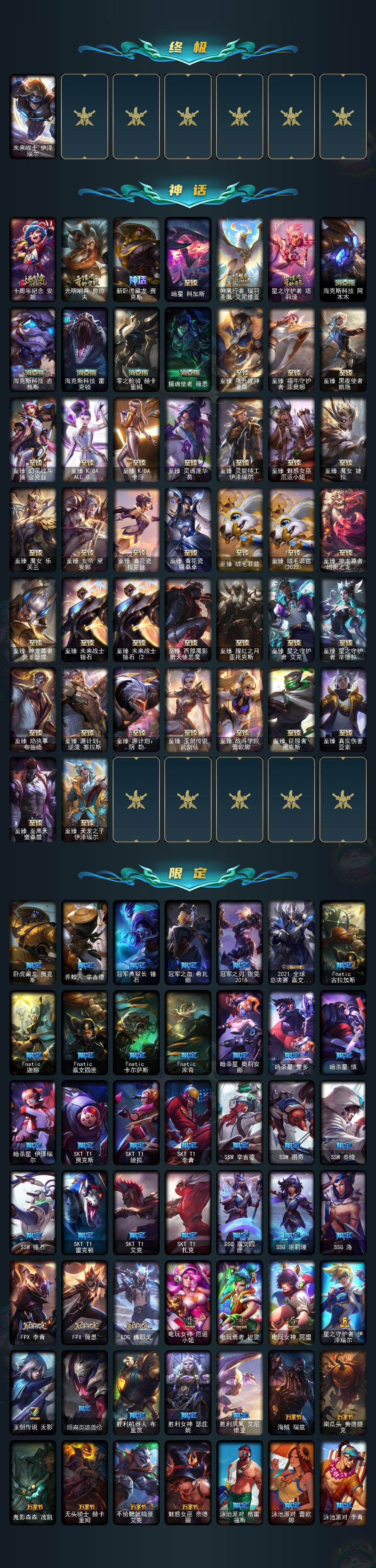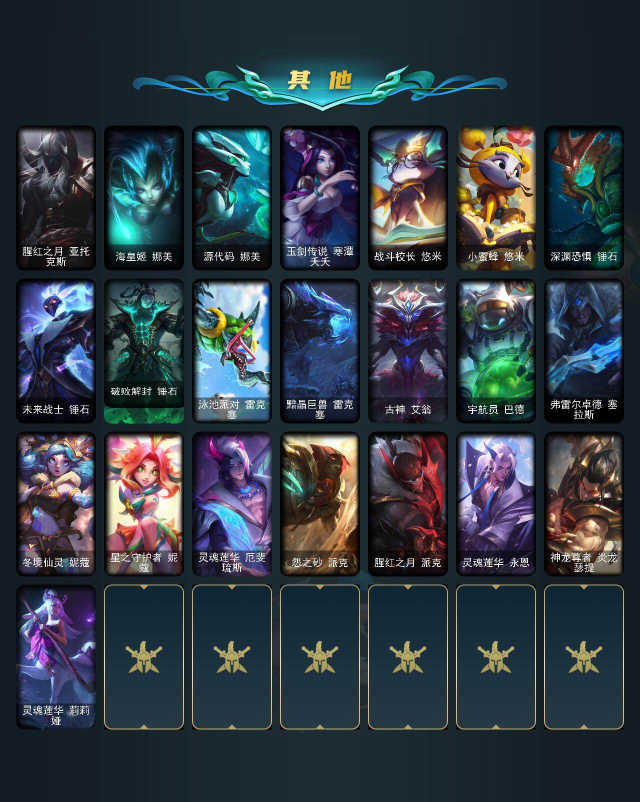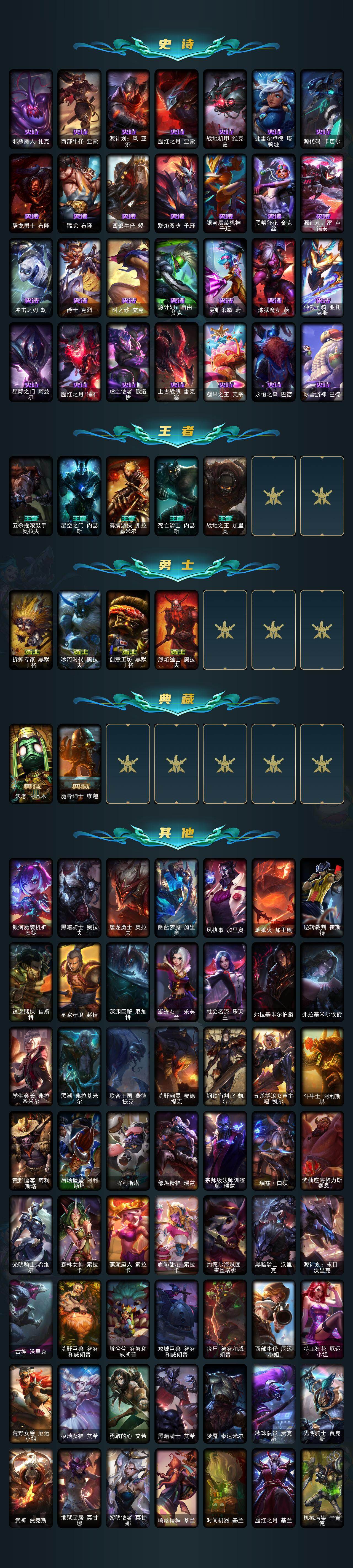 龙瞎 单双未定级段位-171英雄-658皮肤-310炫彩-1终极-44神话-103限定-57传说-154史诗 【热门头像】:爱情之歌头像 【至臻皮肤】:至臻魔女乐芙兰,至臻灵魂莲华易,至臻魅惑女巫厄运小姐,至臻征服者贾克斯,至臻焰执事布兰德,至臻飞升战神潘森,至臻灵能特工伊泽瑞尔,至臻天龙之子伊泽瑞尔,至臻战斗学院蕾欧娜,至臻西部魔影猎天使恶魔泰隆,至臻玉剑传说武剑仙锐雯,至臻青花瓷拉克丝,至臻绒毛菲兹,至臻绒毛菲兹2022,至臻神龙尊者均衡之龙沃利贝尔,至臻福牛守护者菲奥娜,至臻青花瓷丽桑卓,至臻女帝黛安娜,至臻星之守护者辛德拉,至臻黑夜使者凯隐,至臻魔女婕拉,至臻kda卡莎,至臻kdaallout卡莎,至臻真实伤害亚索,至臻幻灵战斗猫金克丝,至臻源计划阴劫,至臻星之守护者艾克,至臻腥红之月亚托克斯,至臻未来战士锤石,至臻未来战士锤石2022,至臻源计划逆流塞拉斯,至臻神龙尊者炎龙瑟提,至臻至高天奎桑提 【臻彩皮肤】:天龙之子卡莎飞龙乘云,无畏骑士瑟庄妮赤子初心,玉剑传说无极白虎,墨之影武者亚索金墨耀影,雾雨之刃锐雯,神龙尊者圣龙李青龙腾云起,神龙尊者圣龙李青登龙,弹幕天使卡莎炽天使勇敢,玉剑传说无影竞星,玉剑传说翼剑仙珠光,星之守护者金克丝黑洞,可爱可爱粉红红布里茨,春晖神女艾希玉露金风,魔女阿卡丽虚荣,净雪之月莫甘娜冬虹,幻灵战斗兔阿萝拉梦幻强袭,心之钢伊泽瑞尔天纵才华,灌篮高手德莱厄斯金色神话 【年限皮肤】:龙的传人李青,你看见过我的熊猫吗安妮,碧玉之牙卡西奥佩娅,神龙之翼库奇,替父从军花木兰,美猴王孙悟空,紫金罗刹莫甘娜,玉净夜叉凯特琳,虎痴之拳蔚,南天之怒沃里克,北辰之威内瑟斯,春晖神女拉克丝,烈焰美人薇恩,王国机神青龙德莱文,福牛守护者德莱厄斯,烈焰仙子黛安娜,龙腾虎跃瑟提,天龙之子李青,天龙之子斯莫德,点心宝贝阿木木 【海克斯皮肤】:海克斯科技阿木木,海克斯科技雷克顿,摄魂使者薇恩,海克斯科技吉格斯,零之呛骑赫卡里姆 【情人节限定】:甜心宝贝娑娜,甜心之翎洛,觅心女王艾希 【冰雪限定】:持胡萝卜的雪人易,圣诞开心鬼提莫,圣诞狂欢基兰,阿木木“主人不要我了”,胡桃夹子萨科,平安夜女神娑娜,邪恶圣诞老人维迦,喜庆之树茂凯,雪默丁格,圣诞驯鹿克格莫,魄罗骑士瑟庄妮,圣诞老人布隆,圣诞捣蛋鬼金克丝,冰雪节辛吉德 【终极皮肤】:未来战士伊泽瑞尔 【神话皮肤】:十周年纪念安妮,光明哨兵奥拉夫,新卧虎藏龙贾克斯,暗星科加斯,神凰行者瑞羽圣凰艾尼维亚,星之守护者塔莉垭,海克斯科技阿木木,海克斯科技吉格斯,海克斯科技雷克顿,零之呛骑赫卡里姆,摄魂使者薇恩,至臻征服者贾克斯,至臻真实伤害亚索,至臻至高天奎桑提,至臻天龙之子伊泽瑞尔,至臻飞升战神潘森,至臻福牛守护者菲奥娜,至臻黑夜使者凯隐,至臻幻灵战斗猫金克丝,至臻kdaallout卡莎,至臻kda卡莎,至臻灵魂莲华易,至臻灵能特工伊泽瑞尔,至臻魅惑女巫厄运小姐,至臻魔女婕拉,至臻魔女乐芙兰,至臻女帝黛安娜,至臻青花瓷拉克丝,至臻青花瓷丽桑卓,至臻绒毛菲兹,至臻绒毛菲兹2022,至臻神龙尊者均衡之龙沃利贝尔,至臻神龙尊者炎龙瑟提,至臻未来战士锤石,至臻未来战士锤石2022,至臻西部魔影猎天使恶魔泰隆,至臻腥红之月亚托克斯,至臻星之守护者艾克,至臻星之守护者辛德拉,至臻焰执事布兰德,至臻源计划逆流塞拉斯,至臻源计划阴劫,至臻玉剑传说武剑仙,至臻战斗学院蕾欧娜 【限定皮肤】:卧虎藏龙贾克斯,养蜂人辛吉德,冠军典狱长锤石,冠军之血希瓦娜,冠军之刃锐雯2016,2021全球总决赛嘉文四世,fnatic古拉加斯,fnatic迦娜,fnatic嘉文四世,fnatic卡尔萨斯,fnatic库奇,暗杀星奥莉安娜,暗杀星蒙多,暗杀星慎,暗杀星伊泽瑞尔,sktt1贾克斯,sktt1婕拉,sktt1李青,ssw辛吉德,ssw图奇,ssw泰隆,ssw锤石,sktt1雷克顿,sktt1艾克,sktt1扎克,ssg嘉文四世,ssg塔莉垭,ssg洛,f李青,f薇恩,edg佛耶戈,电玩女神厄运小姐,电玩勇者锐雯,电玩女神阿狸,星之守护者伊泽瑞尔,玉剑传说无影,暗裔英雄盖伦,胜利机器人布里茨,胜利女神瑟庄妮,胜利凤凰艾尼维亚,海贼瑞兹,南瓜头费德提克,鬼影森森茂凯,无头骑士赫卡里姆,不给糖就捣蛋艾克,魅惑女巫奈德丽,泳池派对格雷福斯,泳池派对蕾欧娜,泳池派对李青,泳池派对塔里克,泳池派对佐伊,密林猎手提莫,外星装甲库奇,奥德赛吉格斯,野兽猎人德莱文,野兽猎人瑟庄妮,波比的巧克力工坊,永恒之森乐芙兰,勇者阿狸,征服者卡尔玛,制胜金靴李青,防暴机器人布里茨,防暴天使凯尔,惊悚派对费德提克,警用试作体k9内瑟斯,克格汪 【传说皮肤】:铁哥们儿奥拉夫,地狱之门卫士加里奥,魔幻卡牌崔斯特,血石领主弗拉基米尔,大天使长米迦勒凯尔,战场女武神凯尔,源计划林易,约德尔国队长提莫,烈焰雄心崔丝塔娜,驯龙炮手崔丝塔娜,合金巨兽努努和威朗普,女皇艾希,恶魔之刃泰达米尔,绅士科加斯,双重冰晶艾尼维亚,电玩女神娑娜,冰霜之刃艾瑞莉娅,女警狙击凯特琳,未来战士凯特琳,陆地王者4wd布里茨,苹果机器人布里茨,冰川巨兽墨菲特,神拳李青,神龙尊者圣龙李青,源计划净化薇恩,驯龙学者黑默丁格,炼狱魔犬内瑟斯,屠龙勇士潘森,源计划超体莫德凯撒,钢铁军团盖伦,月蚀骑士蕾欧娜,黎明使者锐雯,枯萎之壤泽拉斯,黯黑魔龙希瓦娜,冰霜亚龙希瓦娜,偶像歌手阿狸,光明哨兵格雷福斯,符文战熊沃利贝尔,苍穹之光韦鲁斯,宇航员诺