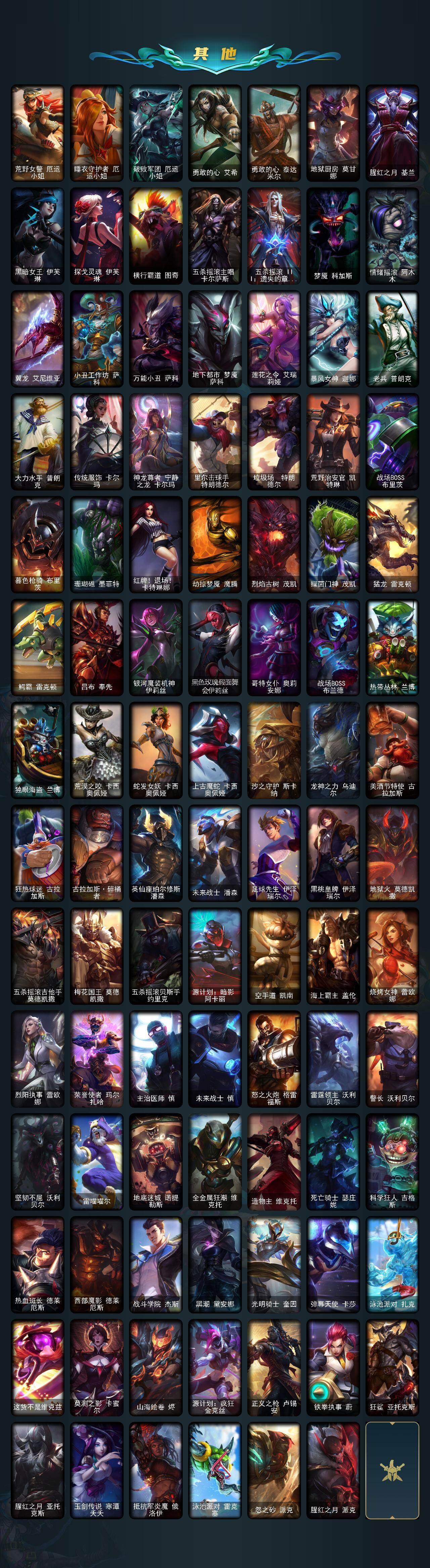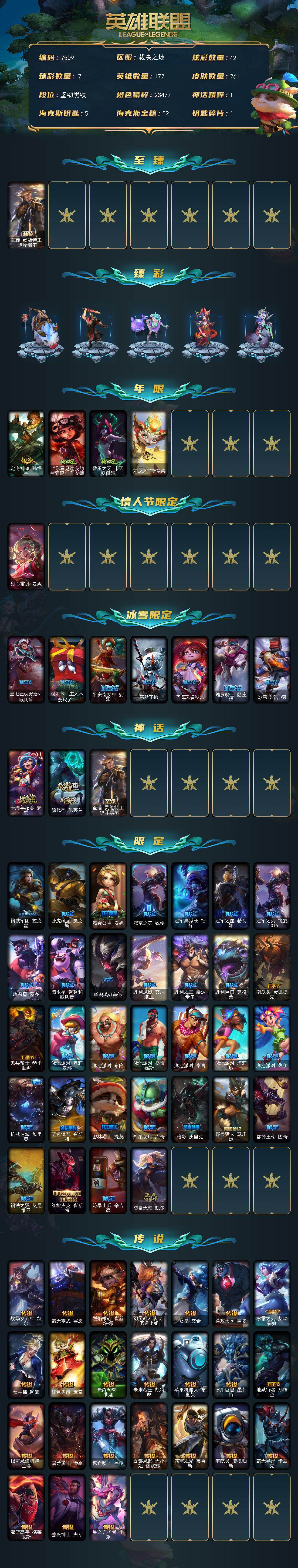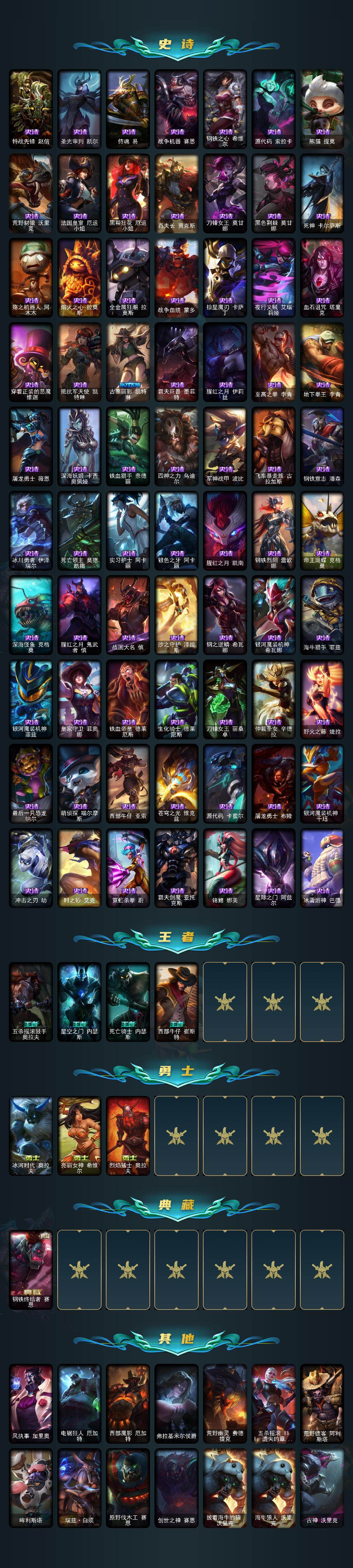 未定级段位-172英雄-261皮肤-42炫彩-0终极-3神话-44限定-24传说-70史诗 【至臻皮肤】:至臻灵能特工伊泽瑞尔 【臻彩皮肤】:无畏骑士瑟庄妮赤子初心,灰烬守护者慎余烬觉醒,泳池派对奥莉安娜优雅珠光鲸,灵魂莲华卡西奥佩娅流火,魔女阿卡丽虚荣,净雪之月莫甘娜冬虹,这货不是银狐库奇 【年限皮肤】:定海神珍孙悟空,你看见过我的熊猫吗安妮,碧玉之牙卡西奥佩娅,天龙之子斯莫德 【情人节限定】:甜心宝贝安妮 【冰雪限定】:圣诞狂欢努努和威朗普,阿木木“主人不要我了”,平安夜女神娑娜,雪默丁格,圣诞玩偶波比,魄罗骑士瑟庄妮,冰雪节辛吉德 【神话皮肤】:十周年纪念安妮,源代码乐芙兰,至臻灵能特工伊泽瑞尔 【限定皮肤】:钢铁军团拉克丝,卧虎藏龙贾克斯,舞会公主安妮,冠军之刃锐雯,冠军典狱长锤石,冠军之血希瓦娜,冠军之刃锐雯2016,暗杀星蒙多,暗杀星努努和威朗普,暗裔英雄盖伦,胜利凤凰艾尼维亚,胜利之王泰达米尔,胜利巨口克格莫,南瓜头费德提克,无头骑士赫卡里姆,泳池派对奥莉安娜,泳池派对布隆,泳池派对格雷福斯,泳池派对李青,泳池派对塔莉垭,泳池派对佐伊,机械迷城加里奥,蓝色忧郁崔斯特,密林猎手提莫,外星装甲库奇,暗影沃里克,野兽猎人瑟庄妮,都铎王朝图奇,钢铁之翼艾尼维亚,红桃杰克崔斯特,防暴士兵辛吉德,防暴天使凯尔 【传说皮肤】:战场女武神凯尔,霸天零式赛恩,烈焰雄心崔丝塔娜,幻灵战斗队长厄运小姐,女皇艾希,律政大亨蒙多,冰霜之刃艾瑞莉娅,女主播迦娜,红色男爵库奇,最终boss维迦,未来战士凯特琳,苹果机器人布里茨,冰川巨兽墨菲特,地狱行者孙悟空,银河魔装机神兰博,屠龙勇士潘森,死亡骑士盖伦,西部魔影大小姐蕾欧娜,苍穹之光韦鲁斯,宇航员诺提勒斯,霸天异形卡兹克,灌篮高手德莱厄斯,蔷薇绅士杰斯,星之守护者卡莎 【史诗皮肤】:特战先锋赵信,圣光审判凯尔,侍魂易,战争机器赛恩,钢铁之心希维尔,源代码索拉卡,熊猫提莫,荒野豺狼沃里克,法国皇室厄运小姐,黑帮狂花厄运小姐,百夫长贾克斯,刀锋女王莫甘娜,黑色荆棘莫甘娜,死神卡尔萨斯,殇之机器人阿木木,熔火之心拉莫斯,全金属狂潮拉莫斯,战争血统蒙多,掠星魔刃卡萨丁,夜行义贼艾瑞莉娅,血石诅咒塔里克,穿着正装的恶魔维迦,抵抗军天使凯特琳,古墓丽影凯特琳,霸天巨兽墨菲特,腥红之月伊莉丝,至高之拳李青,地下拳王李青,屠龙勇士薇恩,深海妖姬卡西奥佩娅,铁血猎手奈德丽,四神之力乌迪尔,军神战甲波比,飞车暴走族古拉加斯,钢铁意志潘森,冰川勇者伊泽瑞尔,死亡领主莫德凯撒,实习护士阿卡丽,银色之牙阿卡丽,腥红之月凯南,钢铁烈阳蕾欧娜,帝王斑蝶克格莫,深海怪鱼克格莫,腥红之月鬼武者慎,战国大名慎,沙之守护泽拉斯,钢之逆鳞希瓦娜,银河魔装机神希瓦娜,海牛猎手菲兹,银河魔装机神菲兹,皇家守卫菲奥娜,铁血帝皇德莱厄斯,生化骑士德莱厄斯,刀锋女王丽桑卓,仲裁圣女辛德拉,野火之藤婕拉,最后一只恐龙纳尔,萌侦探喵尔摩斯,西部牛仔亚索,苍穹之光维克兹,源代码卡蜜尔,屠龙勇士布隆,银河魔装机神千珏,冲击之刃劫,时之砂艾克,霓虹杀拳蔚,霸天剑魔亚托克斯,锦鲤娜美,星际之门阿兹尔,冰雪游神巴德 【王者皮肤】:五杀摇滚鼓手奥拉夫,星空之门内瑟斯,死亡骑士内瑟斯,西部牛仔崔斯特 【勇士皮肤】:冰河时代奥拉夫,亮丽女神希维尔,烈焰猛士奥拉夫 【典藏皮肤】:钢铁终结者赛恩 【其他皮肤1】:风执事加里奥,电锯狂人厄加特,西部魔影厄加特,弗拉基米尔侯爵,荒野幽灵费德提克,五杀摇滚iii遗失的章节凯尔,荒野镖客阿利斯塔,哞利斯塔,瑞兹白须,原野伐木工赛恩,创世之神赛恩,披着海牛的狼沃里克,海牛狼人沃里克,古神沃里克,荒野女警厄运小姐,睡衣守护者厄运小姐,破败军团厄运小姐,勇敢的心艾希,勇敢的心泰达米尔,地狱厨房莫甘娜,腥红之月基兰,黑暗女王伊芙琳,探戈灵魂伊芙琳,横行霸道图奇,五杀摇滚主唱卡尔萨斯,五杀摇滚iii遗失的章节卡尔萨斯,梦魇科加斯,情绪摇滚阿木木,翼龙艾尼维亚,小丑工作坊萨科,万能小丑萨科,地下都市梦魇萨科,莲花之令艾瑞莉娅,暴风女神迦娜,老兵普朗克,大力水手普朗克,传统服饰卡尔玛,神龙尊者宁静之龙卡尔玛,里尔击球手特朗德尔,垃圾场特朗德尔,荒野治安官凯特琳,战场boss布里茨,暮色呛骑布里茨,珊瑚礁墨菲特,红牌退场卡特琳娜,劫掠梦魇魔腾,烈焰古树茂凯,绿茵门神茂凯,猛龙雷克顿,鳄霸雷克顿,吕布奉先,银河魔装机神伊莉丝,黑色玫瑰假面舞会伊莉丝,哥特女仆奥莉安娜,战场boss布兰德,热带丛林兰博,独眼海盗兰博,荒漠之咬卡西奥佩娅,蛇发女妖卡西奥佩娅,上古魔蛇卡西奥佩娅,沙之守护斯卡纳,龙神之力乌迪尔,美酒节特使古拉加斯,狂热球迷古拉加斯,古拉加斯碎桶者,英仙座珀尔修斯潘森,未来战士潘森,足球先生伊泽瑞尔,黑桃皇牌伊泽瑞尔,地狱火莫德凯撒,五杀摇滚吉他手莫德凯撒,梅花国王莫德凯撒,五杀摇滚贝斯手约里克,源计划暗影阿卡丽,空手道凯南,海上霸主盖伦,烧烤女神蕾欧娜,烈阳执事蕾欧娜,荣誉使者玛尔扎哈,主治医师慎,未来战士慎,怒之火炮格雷福斯,雷霆领主沃利贝尔,警长沃利贝尔,坚韧不屈沃利贝尔,雷喵喵尔,地底迷城诺提勒斯,全金属狂潮维克托,造物主维克托,死亡骑士瑟庄妮,科学狂人吉格斯,热血班长德莱厄斯,西部魔影德莱厄斯,战斗学院杰斯,黑潮黛安娜,光明骑士奎