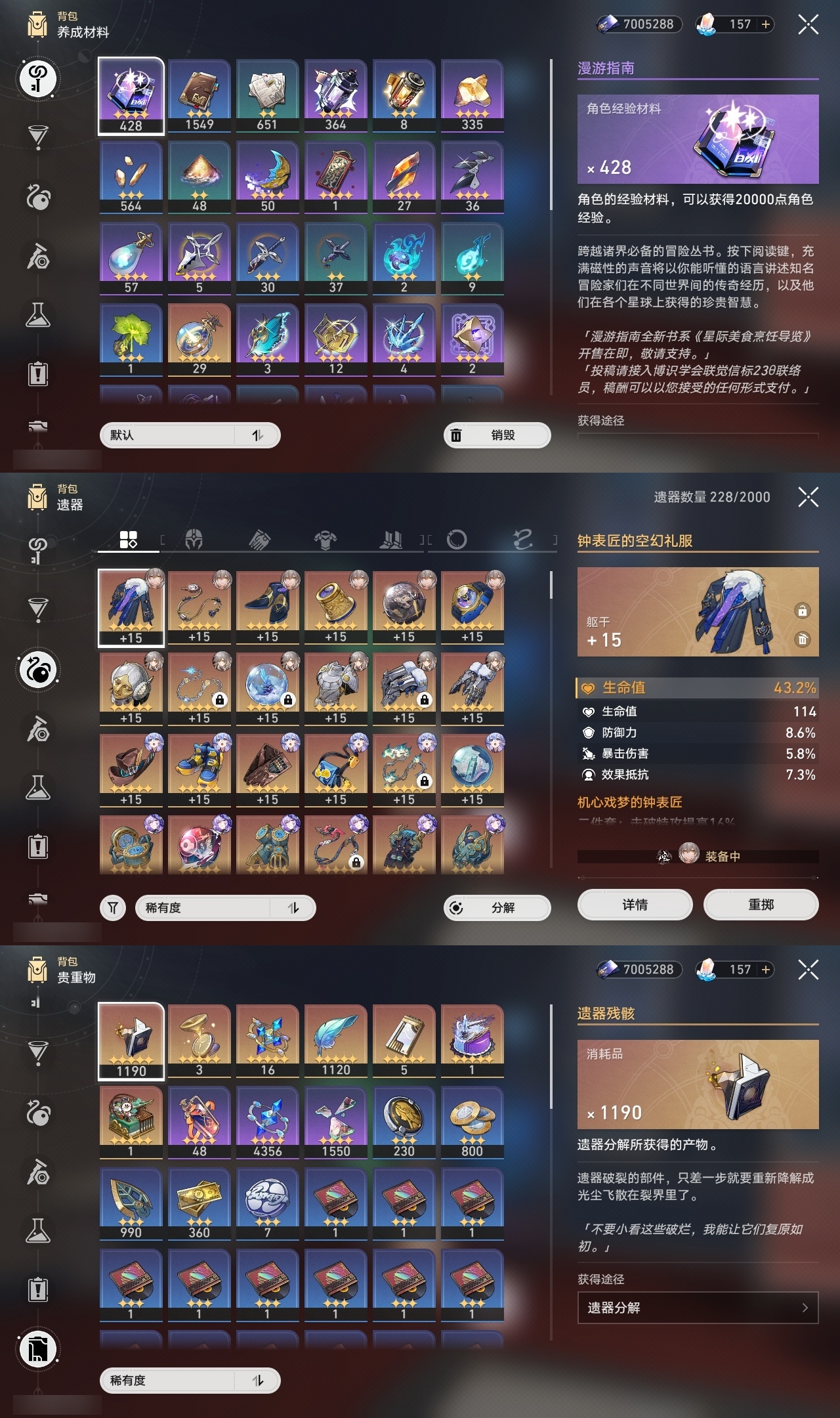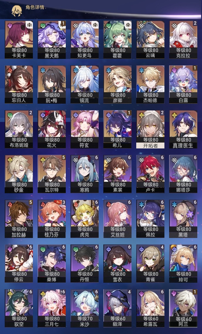 [6806051]43黄!5命瓦尔特 2命布洛妮娅2命克拉拉 1命希儿1命白露1命黑天鹅 0命彦卿0命杰帕德0命卡芙卡0命符玄0命镜流0命藿藿0命阮•梅0命真理医生0命花火0命砂金0命知更鸟0命云璃0命忘归人 精5武器: 精5记忆的质料精5孤独的疗愈精5记一位星神的陨落精5星海巡航精5不息的演算 精1武器: 精1时节不居精1如泥酣眠精1以世界之名精1无可取代的东西精1只需等待精1此身为剑精1惊魂夜精1重塑时光之忆精1夜色流光溢彩精1我将,巡征追猎精1向着不可追问处