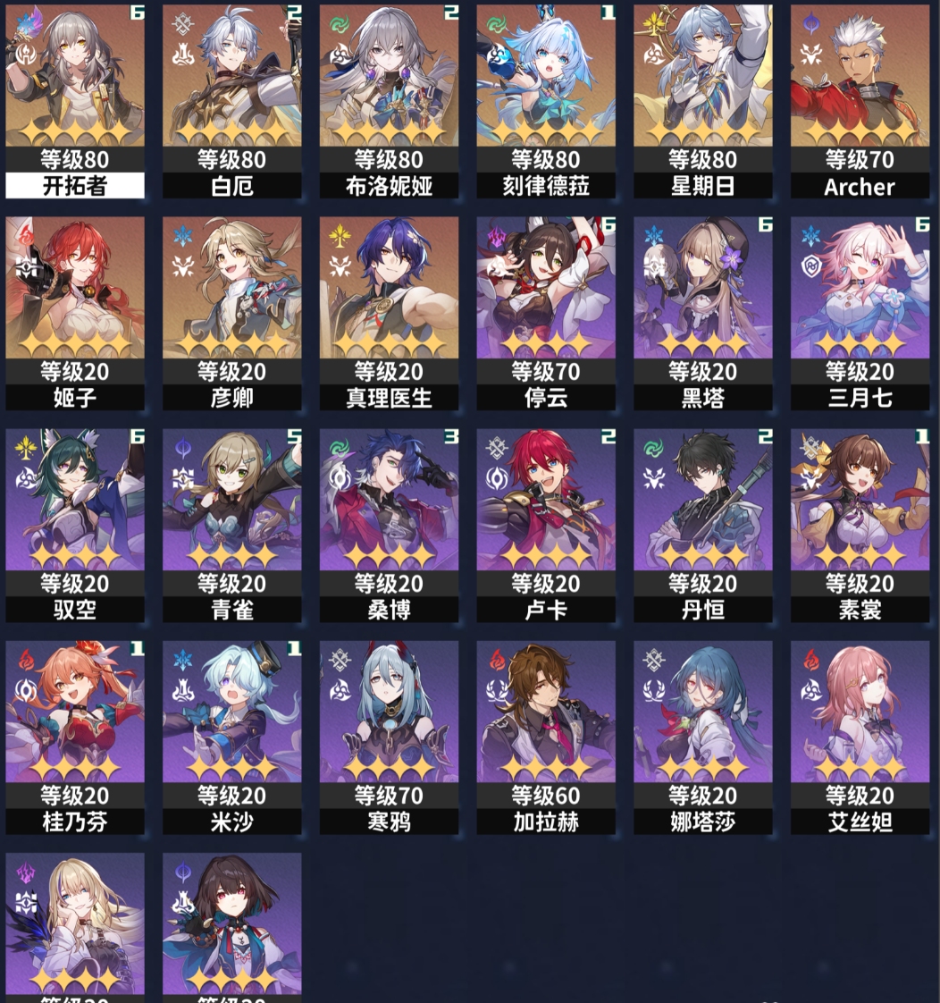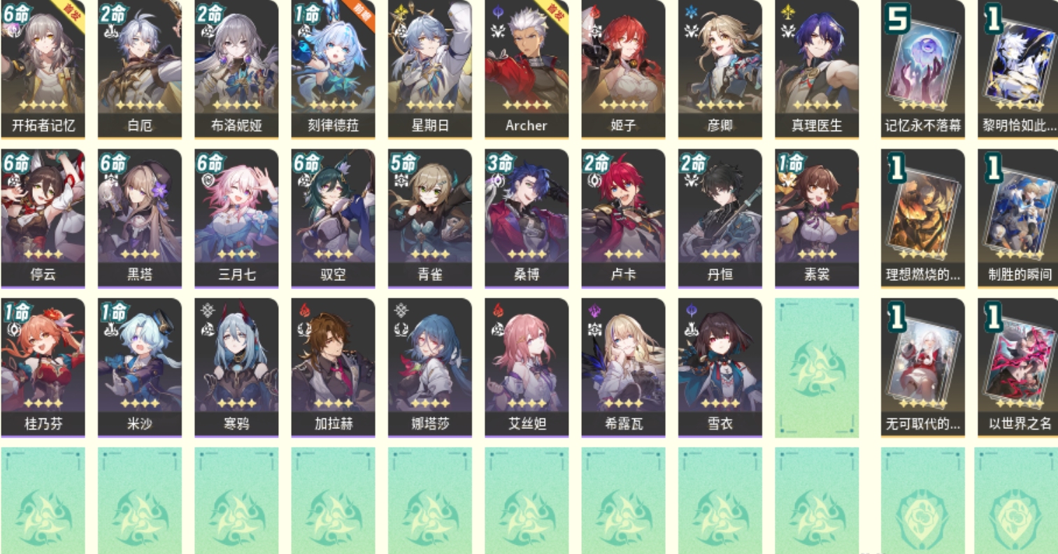 [12039135]m22847,65级女主23黄梦华0星琼2205星轨专票3星轨通票28个五星角色:2命白厄2命布洛妮娅1命刻律德菈星期日archer姬子彦卿真理医生服饰:冬去煦至6个五星光锥:精5记忆永不落幕精1黎明恰如此燃烧精1理想燃烧的地狱精1制胜的瞬间精1无可取代的东西精1以世界之名【邮箱不出售】21白厄10刻律00星期天