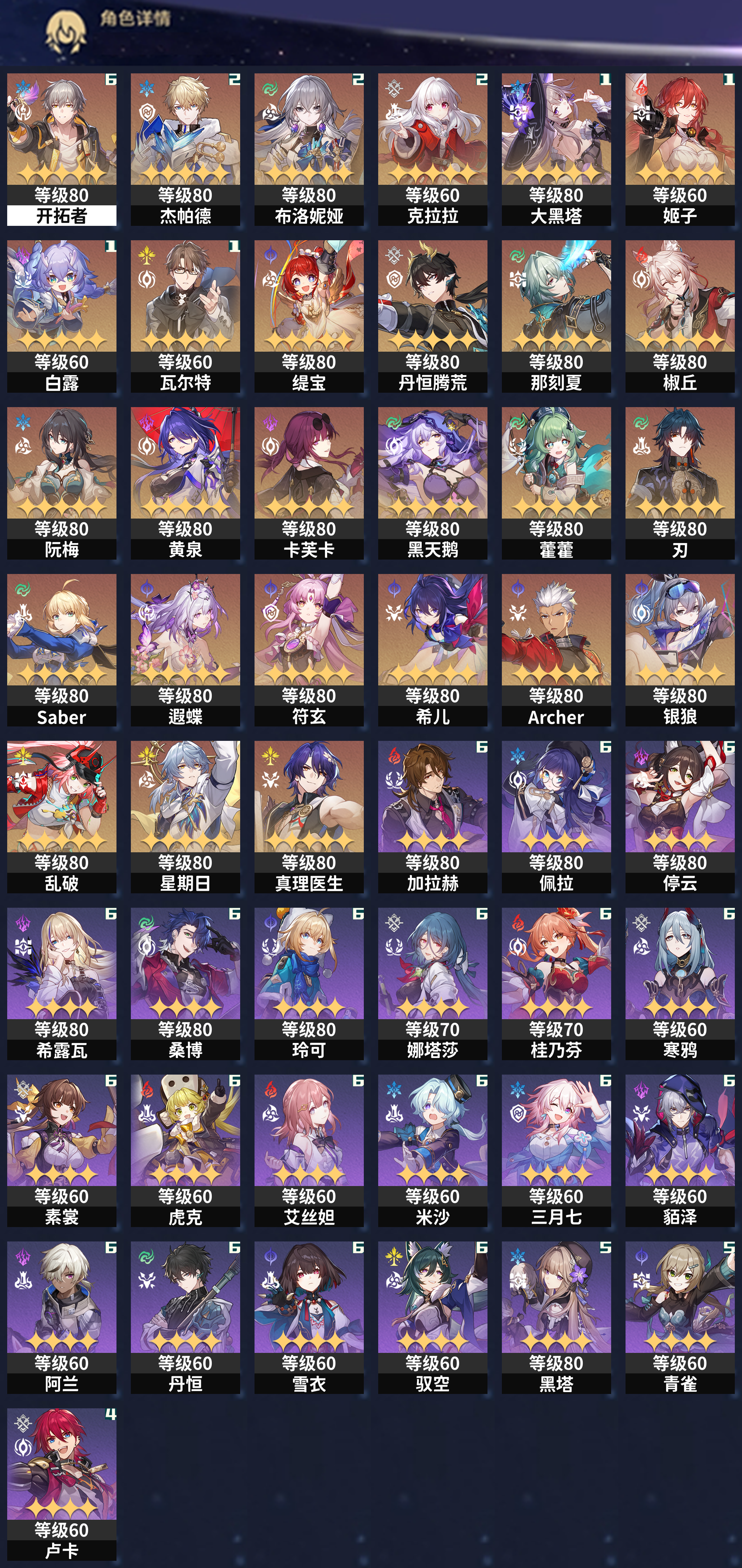 【崩坏·星穹铁道】【lyxq5737】冒险等级:70,男主,五星数量:36,绑定情况:手机号__五星角色:杰帕德 2命|布洛妮娅 2命|克拉拉 2命|大黑塔 1命|姬子 1命|白露 1命|瓦尔特 1命|缇宝|丹恒·腾荒|那刻夏|椒丘|阮·梅|黄泉|卡芙卡|黑天鹅|藿藿|刃|saber|遐蝶|符玄|希儿|archer|银狼|乱破|星期日|真理医生__五星光锥:星海巡航 5精|制胜的瞬间 2精|如泥酣眠|向着不可追问处|银河铁道之夜|但战斗还未结束|行于流逝的岸|雨一直下|惊魂夜|时节不居,【邮箱未绑定】