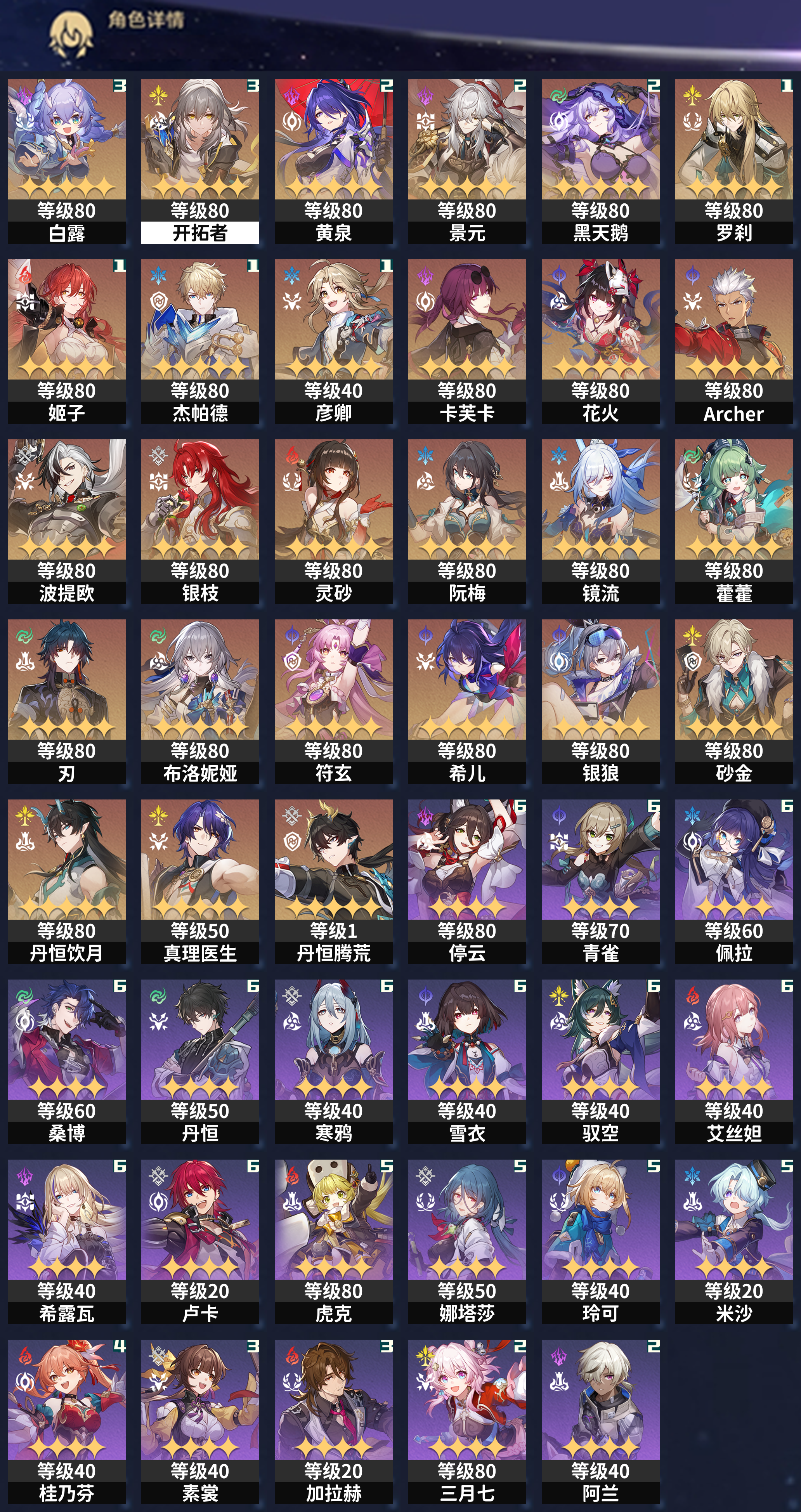 【崩坏·星穹铁道】【lyxq6340】冒险等级:70,女主,五星数量:36,绑定情况:手机号__五星角色:白露 3命|黄泉 2命|景元 2命|黑天鹅 2命|罗刹 1命|姬子 1命|杰帕德 1命|彦卿 1命|卡芙卡|花火|archer|波提欧|银枝|灵砂|阮·梅|镜流|藿藿|刃|布洛妮娅|符玄|希儿|银狼|砂金|丹恒·饮月|真理医生|丹恒·腾荒__五星光锥:记一位星神的陨落 5精|星海巡航 5精|孤独的疗愈 5精|记忆的质料 4精|不息的演算 2精|无可取代的东西|行于流逝的岸|制胜的瞬间|唯有香如故|时节不居,【邮箱未绑定】