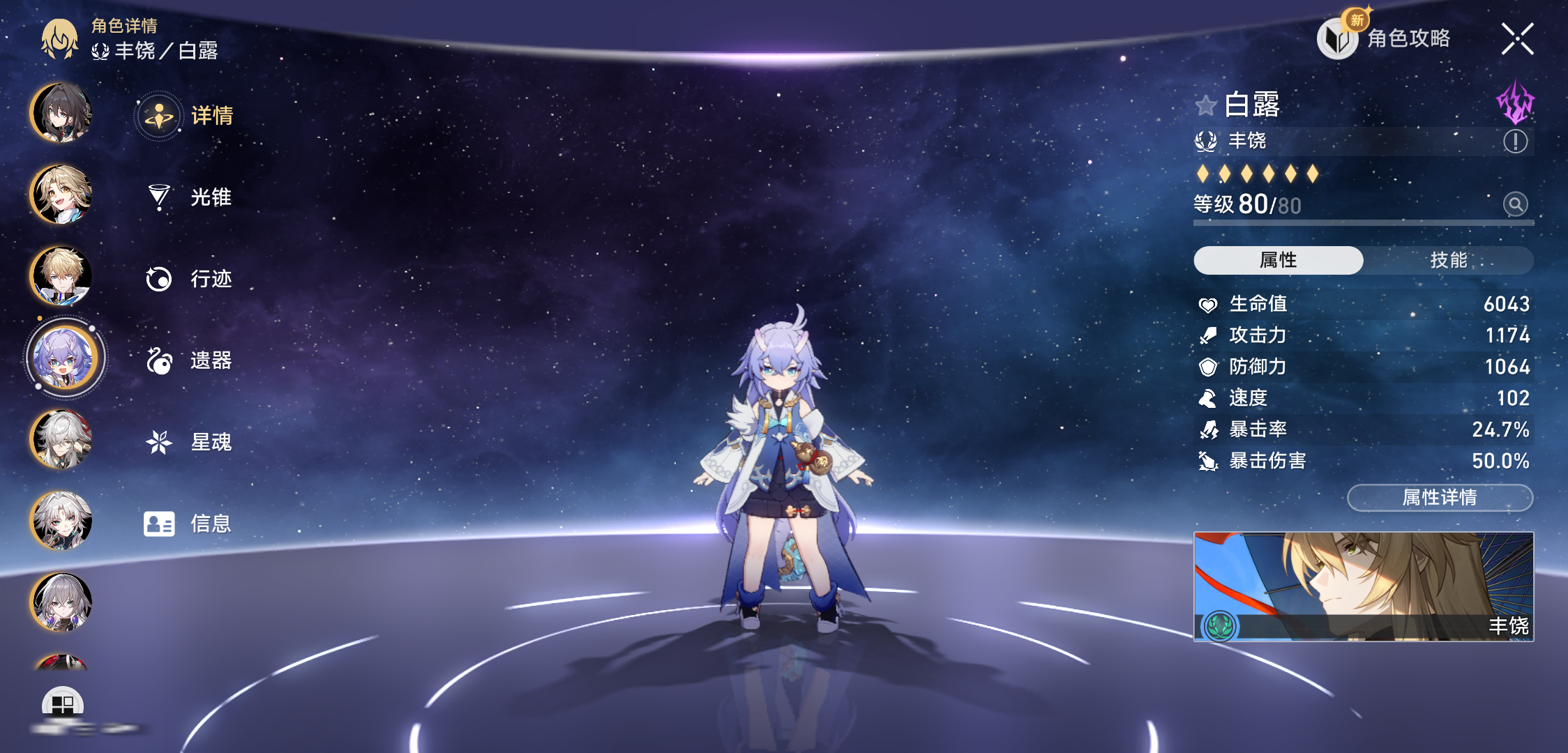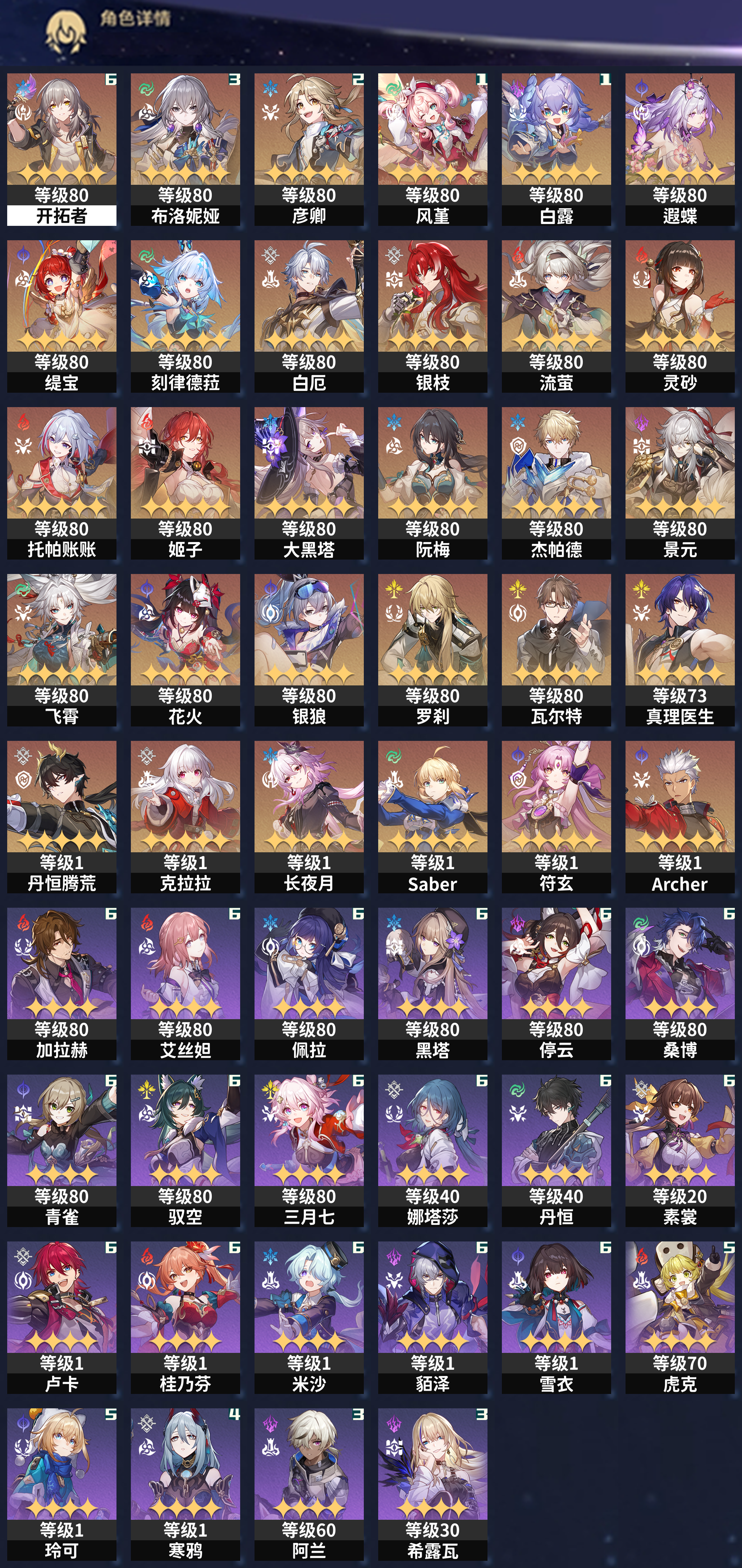 【崩坏·星穹铁道】【lyxq6373】冒险等级:70,女主,五星数量:36,绑定情况:手机号__五星角色:布洛妮娅 3命|彦卿 2命|风堇 1命|白露 1命|遐蝶|缇宝|刻律德菈|白厄|银枝|流萤|灵砂|托帕账账|姬子|大黑塔|阮·梅|杰帕德|景元|飞霄|花火|银狼|罗刹|瓦尔特|真理医生|丹恒·腾荒|克拉拉|长夜月|saber|符玄|archer__五星光锥:记一位星神的陨落 3精|制胜的瞬间 2精|记忆永不落幕|银河铁道之夜|星海巡航|理想燃烧的地狱|不息的演算,【邮箱未绑定】