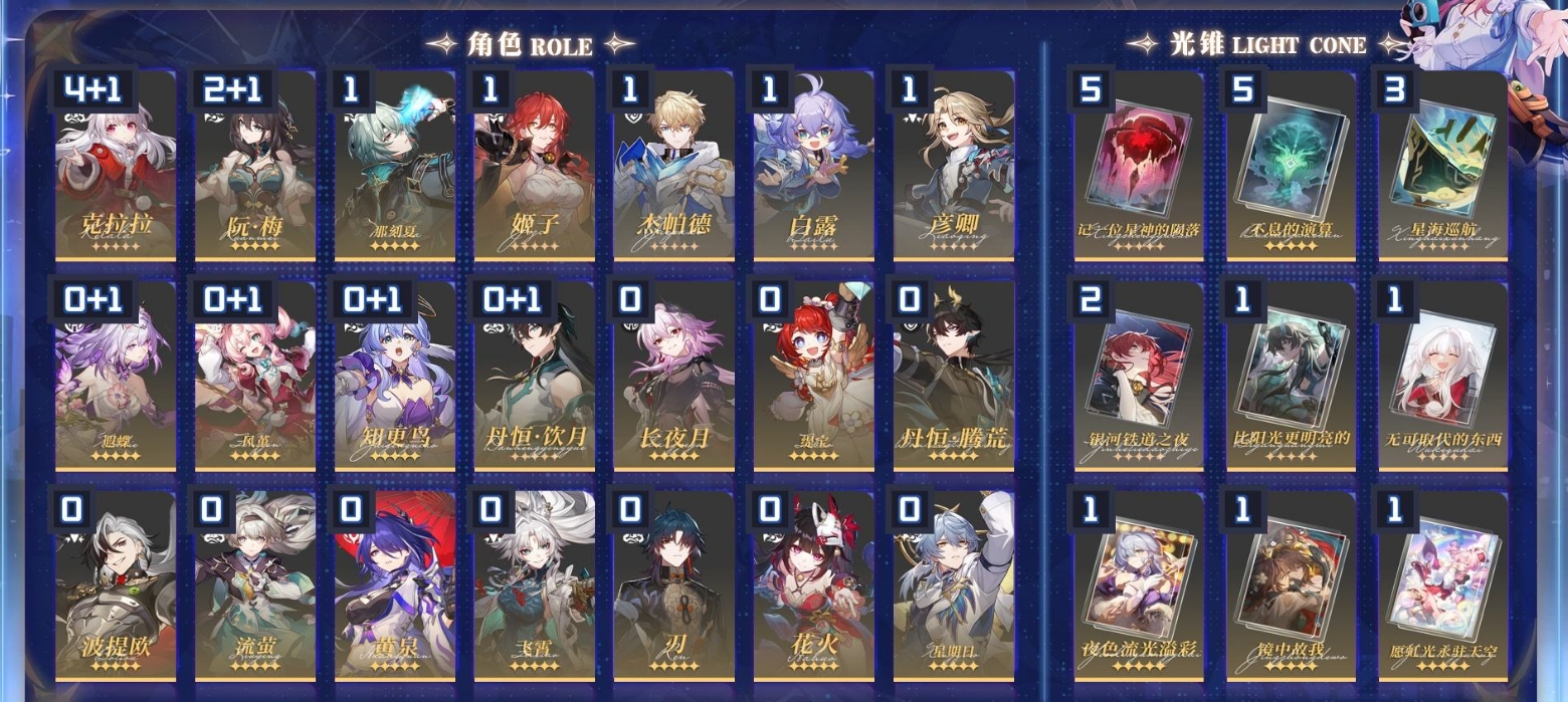 [13200471]m23430,70级男主57黄梦华80星琼503星轨专票0星轨通票024个五星角色:4命克拉拉2命阮梅1命那刻夏1命姬子1命杰帕德1命白露1命彦卿遐蝶长夜月缇宝风堇丹恒腾荒波提欧知更鸟流萤黄泉飞霄刃花火星期日真理医生丹恒饮月archer瓦尔特服饰:冬去煦至11个五星光锥:精5记一位星神的陨落精5不息的演算精3星海巡航精2银河铁道之夜精1比阳光更明亮的精1无可取代的东西精1夜色流光溢彩精1镜中故我精1愿虹光永驻天空精1让告别更美一些精1唯有香如故