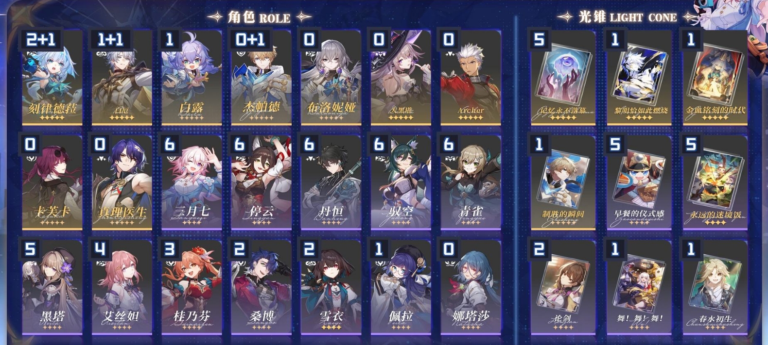 [13294638]m22953,63级女主22黄梦华0星琼269星轨专票170星轨通票510个五星角色:2命刻律德菈1命白厄1命白露布洛妮娅大黑塔archer卡芙卡杰帕德真理医生丹恒腾荒服饰:冬去煦至4个五星光锥:精5记忆永不落幕精1黎明恰如此燃烧精1金血铭刻的时代精1制胜的瞬间