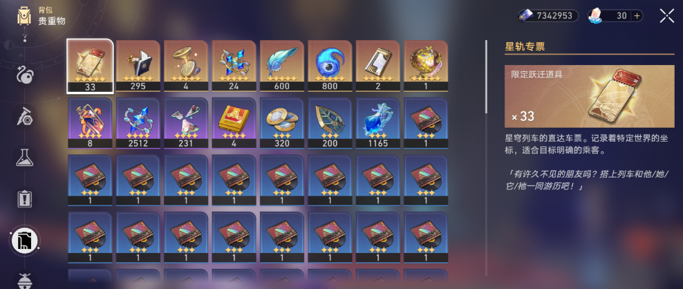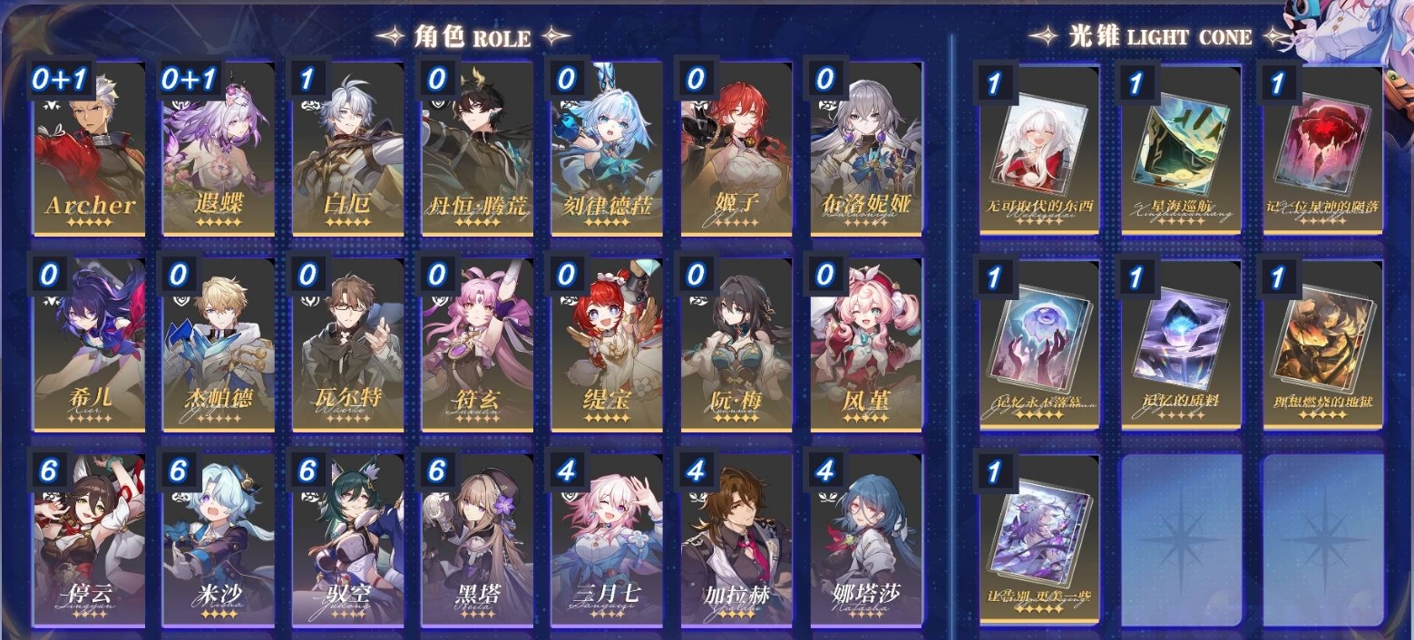 [13323695]m23540,69级男主22黄梦华0星琼30星轨专票33星轨通票014个五星角色:1命白厄阮梅风堇缇宝遐蝶丹恒腾荒刻律德菈姬子布洛妮娅符玄希儿archer瓦尔特杰帕德7个五星光锥:精1记一位星神的陨落精1记忆永不落幕精1让告别更美一些精1理想燃烧的地狱精1记忆的质料精1无可取代的东西精1星海巡航