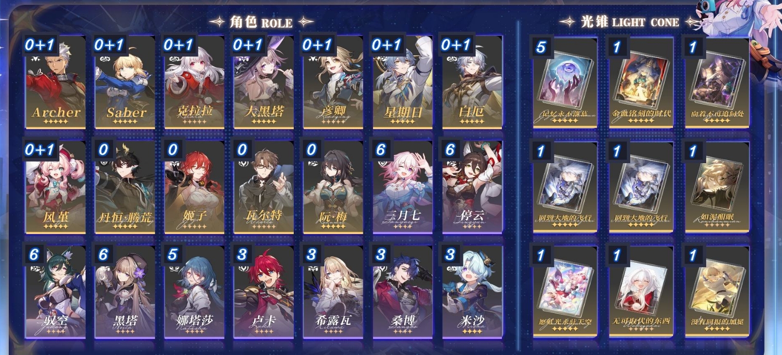 [13323929]m23566,70级男主28黄梦华0星琼1716星轨专票0星轨通票713个五星角色:白厄刻律德菈丹恒腾荒星期日大黑塔阮梅风堇saberarcher瓦尔特克拉拉姬子彦卿11个五星光锥:精5记忆永不落幕精1没有回报的加冕精1黎明恰如此燃烧精1向着不可追问处精1金血铭刻的时代精1回到大地的飞行精1回到大地的飞行精1愿虹光永驻天空精1理想燃烧的地狱精1无可取代的东西精1如泥酣眠