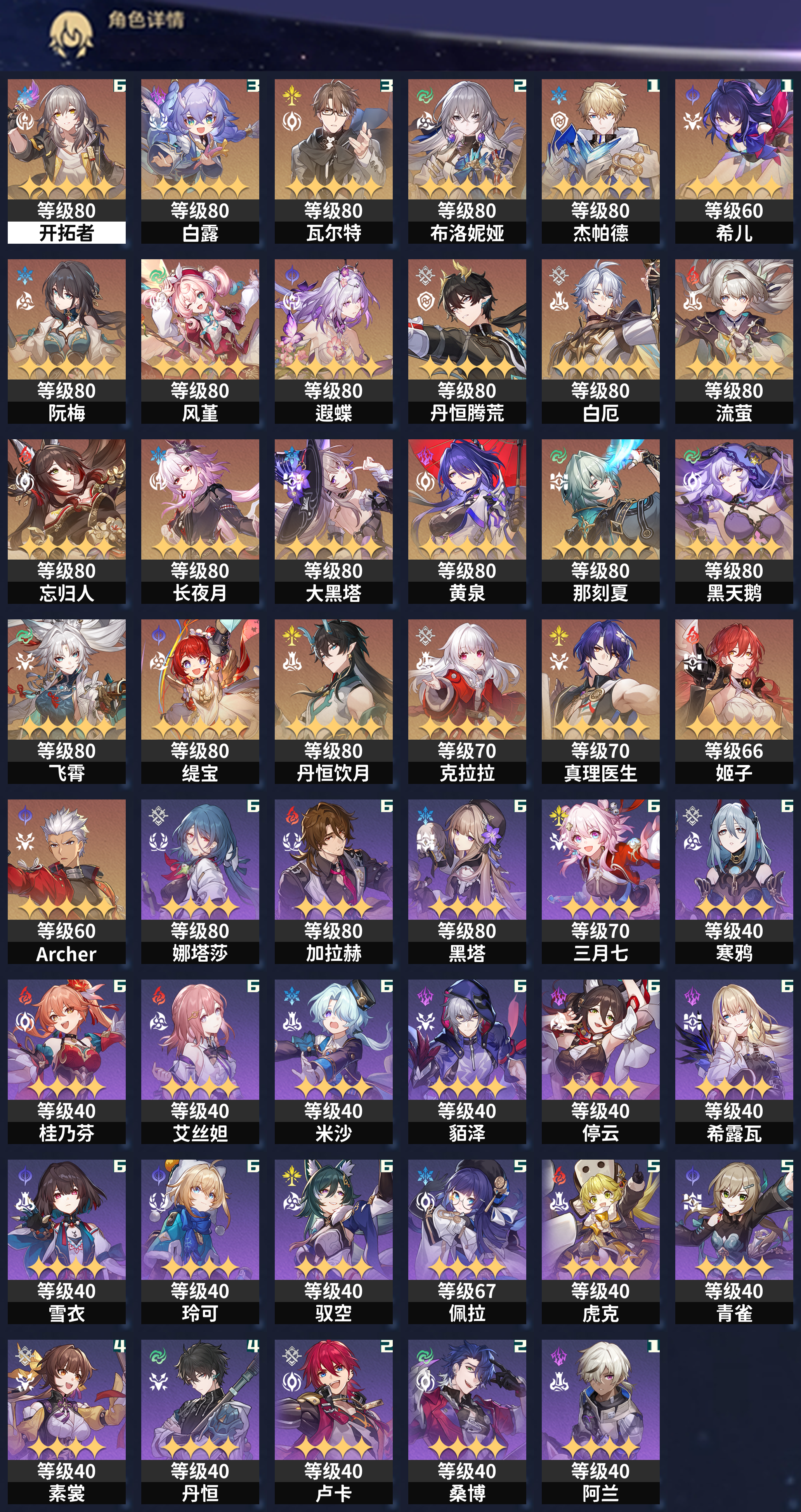 【崩坏·星穹铁道】【lyxq6506】冒险等级:70,女主,五星数量:33,绑定情况:手机号__五星角色:白露 3命|瓦尔特 3命|布洛妮娅 2命|杰帕德 1命|希儿 1命|阮·梅|风堇|遐蝶|丹恒·腾荒|白厄|流萤|忘归人|长夜月|大黑塔|黄泉|那刻夏|黑天鹅|飞霄|缇宝|丹恒·饮月|克拉拉|真理医生|姬子|archer__五星光锥:不息的演算 5精|记一位星神的陨落 5精|记忆永不落幕 2精|星海巡航 2精|孤独的疗愈 2精|无可取代的东西|让告别,更美一些|以世界之名|记忆的质料,【邮箱未绑定】
