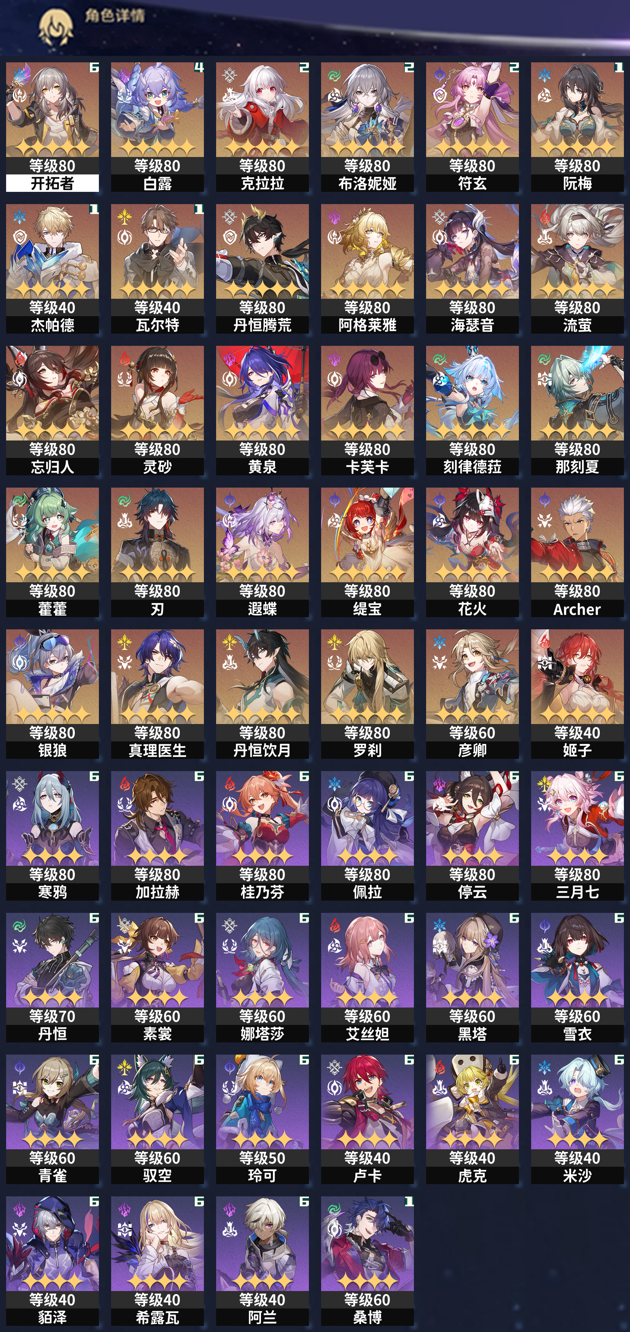 【崩坏·星穹铁道】【lyxq6577】冒险等级:70,女主,五星数量:45,绑定情况:邮箱__五星角色:白露 4命|克拉拉 2命|布洛妮娅 2命|符玄 2命|阮·梅 1命|杰帕德 1命|瓦尔特 1命|丹恒·腾荒|阿格莱雅|海瑟音|流萤|忘归人|灵砂|黄泉|卡芙卡|刻律德菈|那刻夏|藿藿|刃|遐蝶|缇宝|花火|archer|银狼|真理医生|丹恒·饮月|罗刹|彦卿|姬子__五星光锥:记忆永不落幕 5精|无可取代的东西 3精|时节不居 2精|梦应归于何处|到不了的彼岸|生命当付之一炬|镜中故我|但战斗还未结束|海洋为何而歌|行于流逝的岸|她已闭上双眼|爱如此刻永恒|让告别,更美一些|将光阴织成黄金|理想燃烧的地狱|制胜的瞬间,【邮箱不出售】