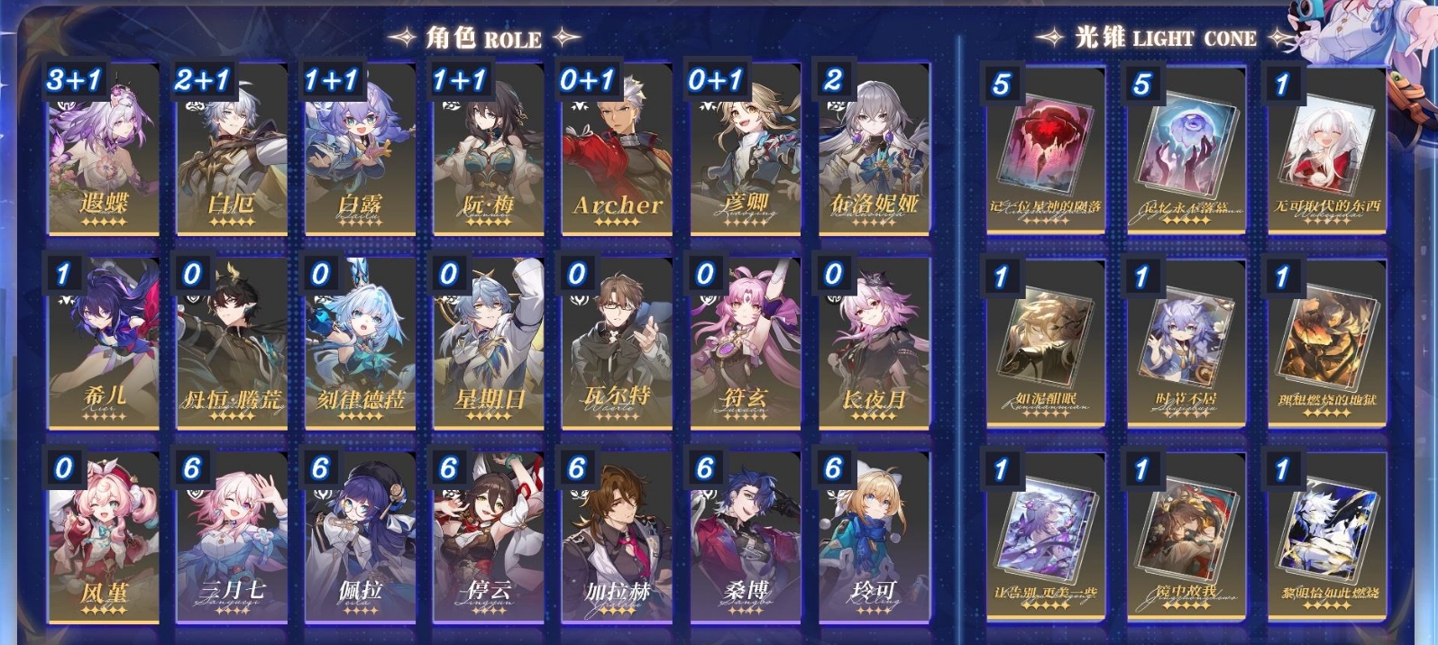 [13465045]m23745,70级女主42黄梦华0星琼2148星轨专票20星轨通票915个五星角色:3命遐蝶2命白厄2命布洛妮娅1命阮梅1命白露1命希儿长夜月风堇刻律德菈星期日archer瓦尔特彦卿丹恒腾荒符玄9个五星光锥:精5记忆永不落幕精5记一位星神的陨落精1黎明恰如此燃烧精1镜中故我精1让告别更美一些精1理想燃烧的地狱精1如泥酣眠精1无可取代的东西精1时节不居