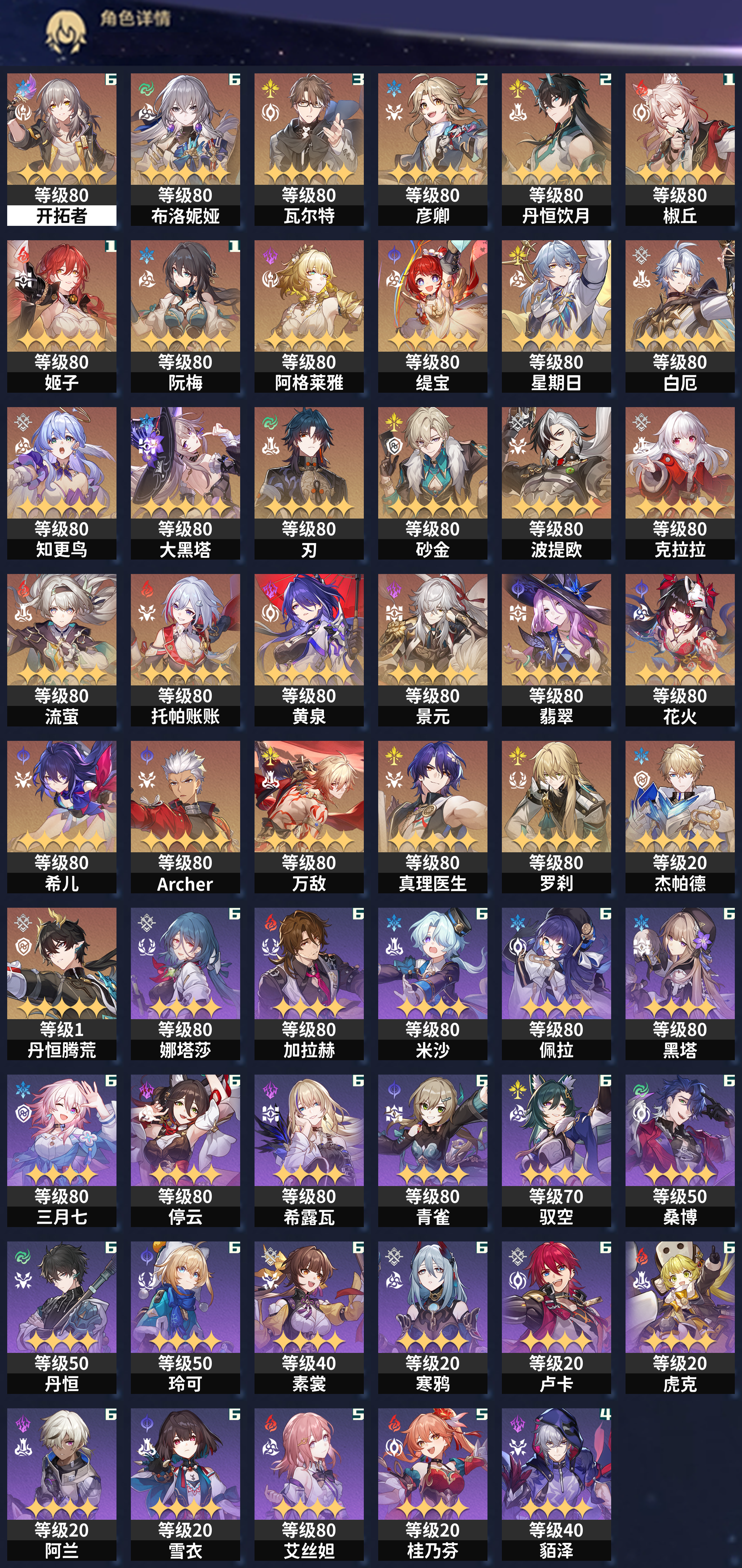 【崩坏·星穹铁道】【lyxq6632】冒险等级:70,女主,五星数量:44,绑定情况:手机号__五星角色:布洛妮娅 6命|瓦尔特 3命|彦卿 2命|丹恒·饮月 2命|椒丘 1命|姬子 1命|阮·梅 1命|阿格莱雅|缇宝|星期日|白厄|知更鸟|大黑塔|刃|砂金|波提欧|克拉拉|流萤|托帕账账|黄泉|景元|翡翠|花火|希儿|archer|万敌|真理医生|罗刹|杰帕德|丹恒·腾荒__五星光锥:记一位星神的陨落 5精|星海巡航 5精|不息的演算 5精|孤独的疗愈 2精|以世界之名 2精|比阳光更明亮的|到不了的彼岸|理想燃烧的地狱|向着不可追问处|但战斗还未结束|制胜的瞬间|如泥酣眠|记忆的质料|记忆永不落幕,【邮箱未绑定】