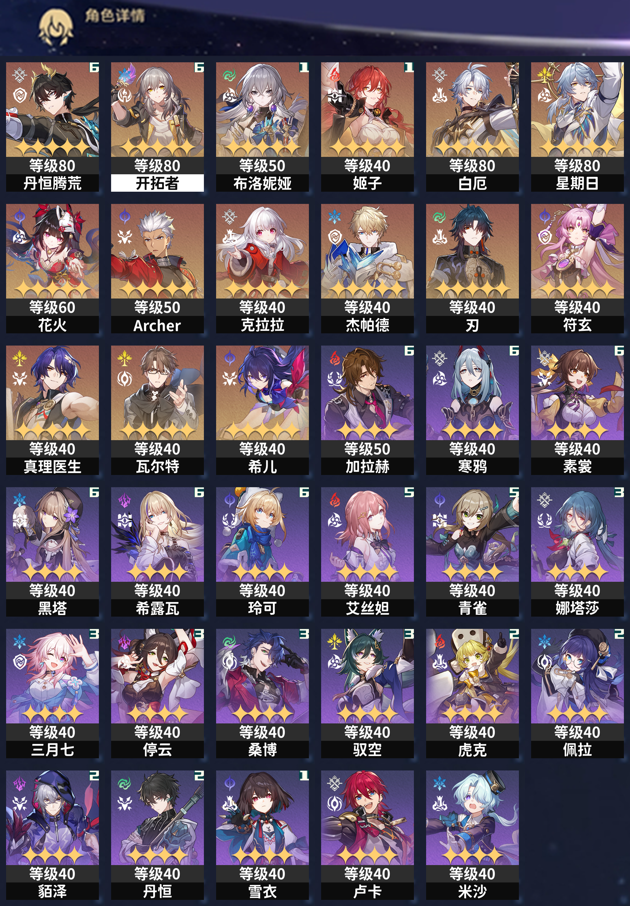 【崩坏·星穹铁道】【lyxq6579】冒险等级:66,女主,五星数量:18,绑定情况:邮箱__五星角色:丹恒·腾荒 6命|布洛妮娅 1命|姬子 1命|白厄|星期日|花火|archer|克拉拉|杰帕德|刃|符玄|真理医生|瓦尔特|希儿__五星光锥:银河铁道之夜 5精|黎明恰如此燃烧|纵然山河万程|无可取代的东西,【邮箱未实名】1