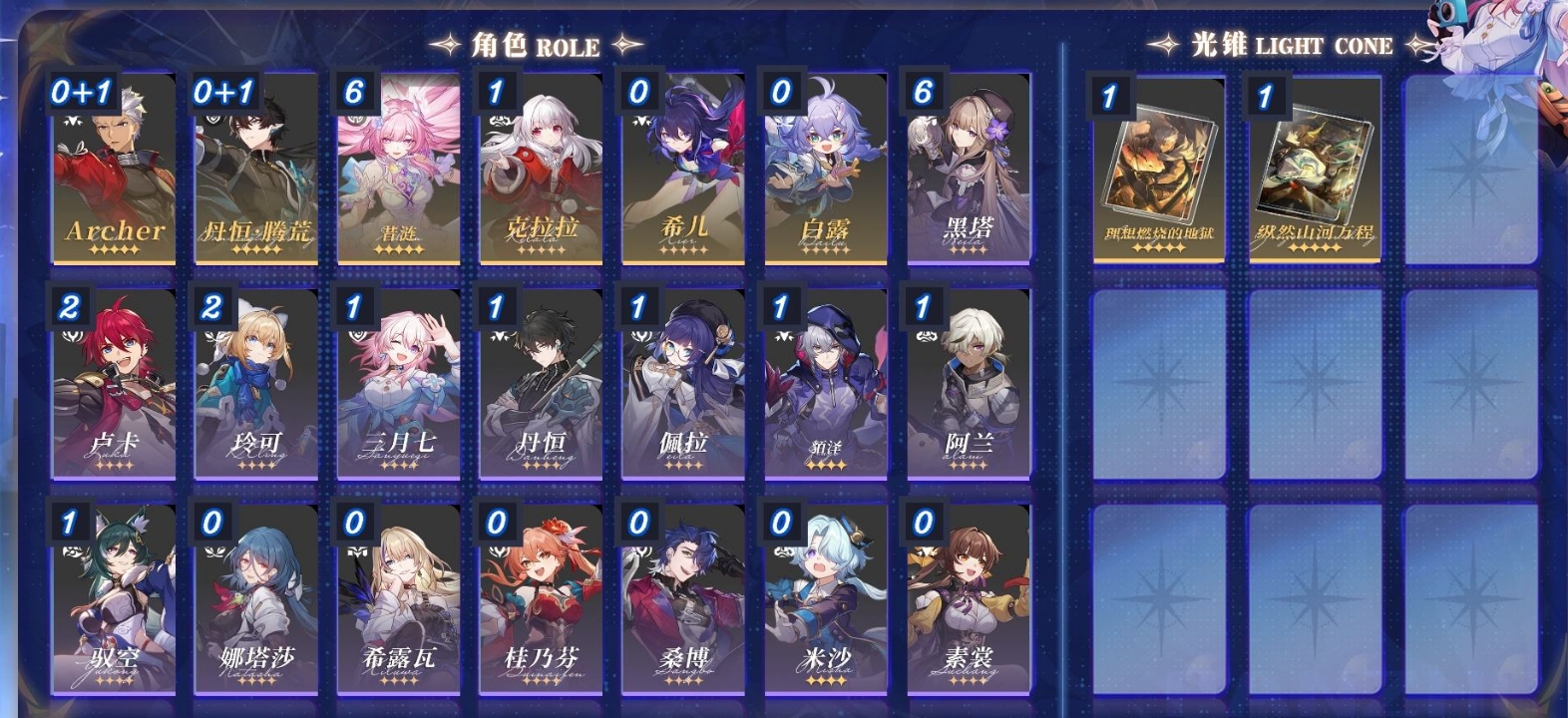 [13525430]m23657,63级女主16黄梦华0星琼100星轨专票10星轨通票36个五星角色:满命昔涟1命克拉拉丹恒腾荒archer白露希儿3个五星光锥:精1理想燃烧的地狱精1纵然山河万程精1爱如此刻永恒