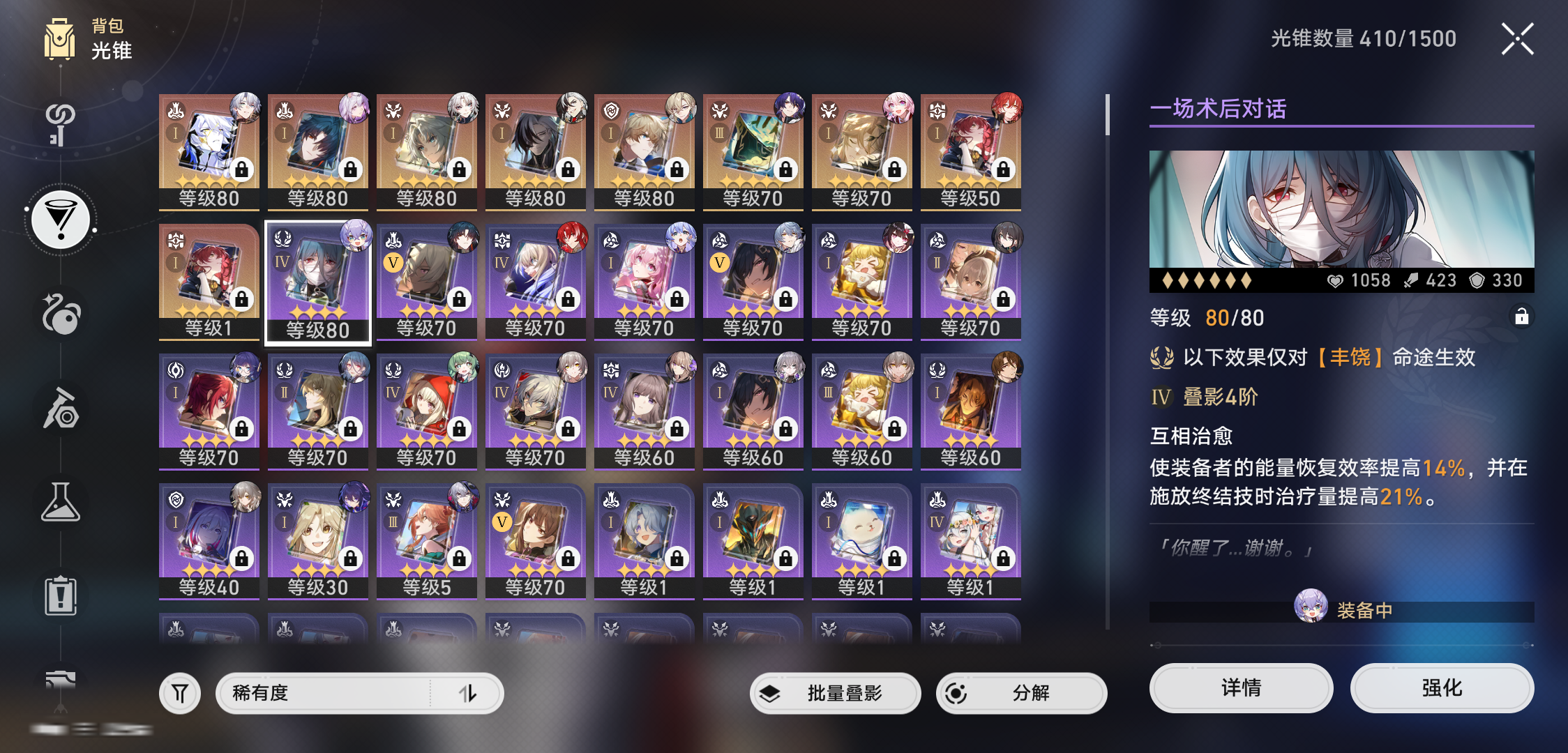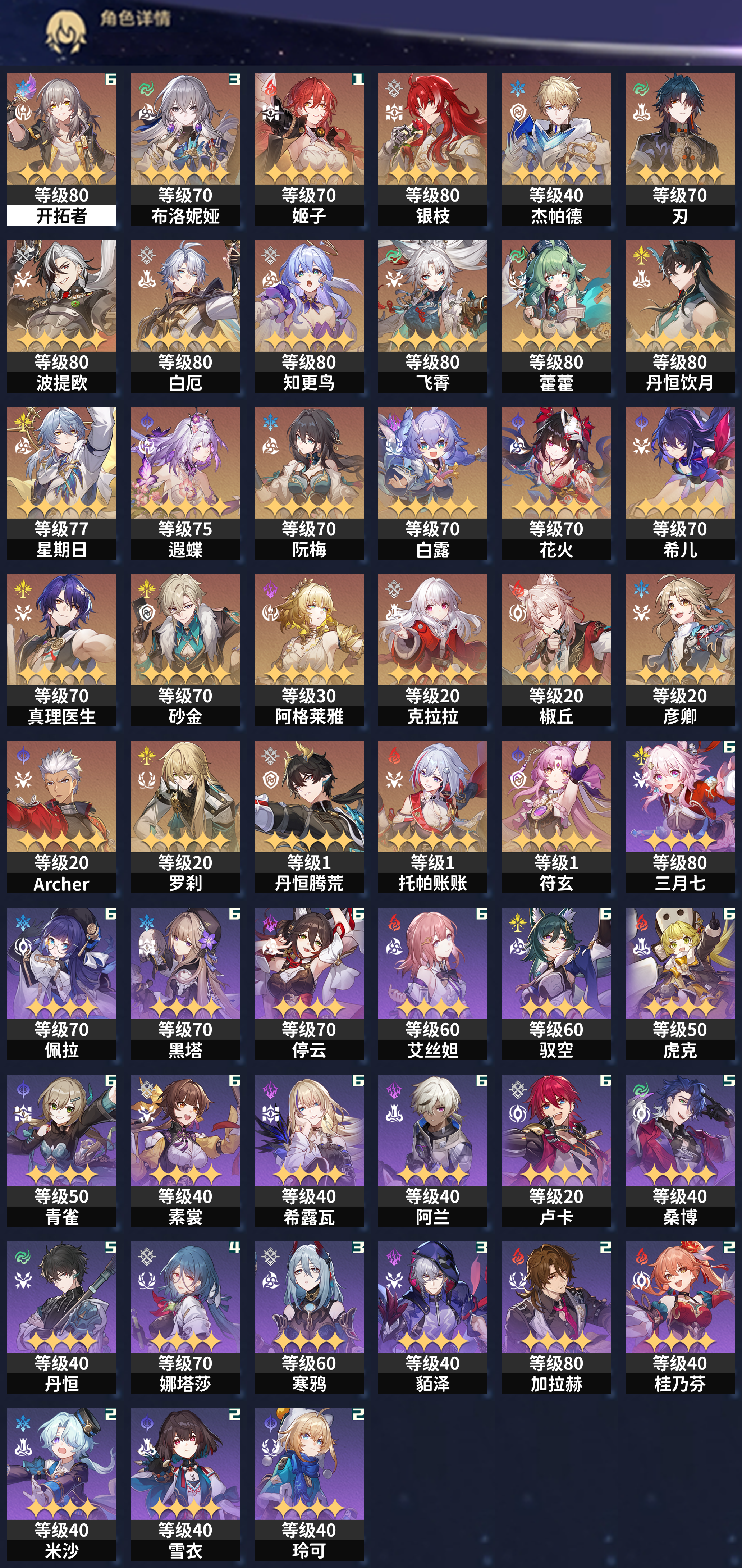 【崩坏·星穹铁道】【lyxq6661】冒险等级:70,女主,五星数量:36,绑定情况:邮箱__五星角色:布洛妮娅 3命|姬子 1命|银枝|杰帕德|刃|波提欧|白厄|知更鸟|飞霄|藿藿|丹恒·饮月|星期日|遐蝶|阮·梅|白露|花火|希儿|真理医生|砂金|阿格莱雅|克拉拉|椒丘|彦卿|archer|罗刹|丹恒·腾荒|托帕账账|符玄__五星光锥:星海巡航 3精|黎明恰如此燃烧|到不了的彼岸|我将,巡征追猎|驶向第二次生命|制胜的瞬间|如泥酣眠|银河铁道之夜,【邮箱已实名】