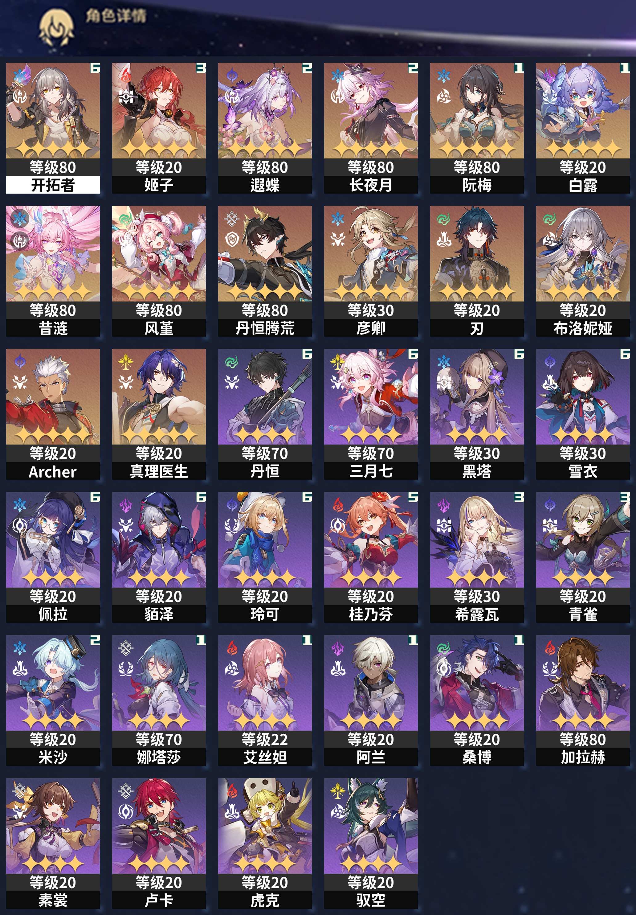 【崩坏·星穹铁道】【lyxq6702】冒险等级:66,女主,五星数量:16,绑定情况:邮箱__五星角色:姬子 3命|遐蝶 2命|长夜月 2命|阮·梅 1命|白露 1命|昔涟|风堇|丹恒·腾荒|彦卿|刃|布洛妮娅|archer|真理医生__五星光锥:记忆永不落幕 5精|致长夜的星光|让告别,更美一些,【邮箱未实名】