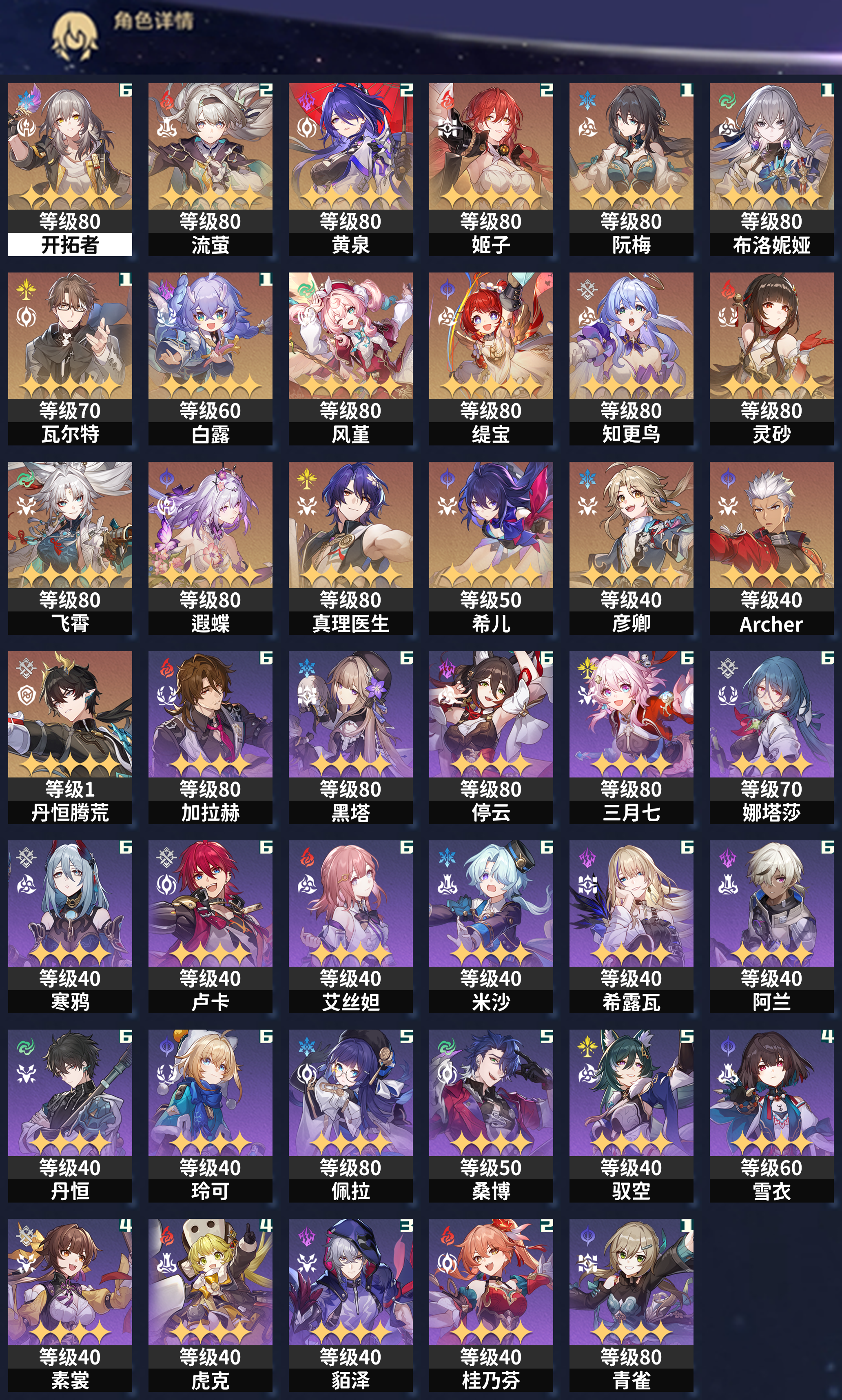 【崩坏·星穹铁道】【lyxq6766】冒险等级:70,女主,五星数量:28,绑定情况:手机号__五星角色:流萤 2命|黄泉 2命|姬子 2命|阮·梅 1命|布洛妮娅 1命|瓦尔特 1命|白露 1命|风堇|缇宝|知更鸟|灵砂|飞霄|遐蝶|真理医生|希儿|彦卿|archer|丹恒·腾荒__五星光锥:记一位星神的陨落 5精|星海巡航 5精|记忆永不落幕 5精|银河铁道之夜 2精|行于流逝的岸|唯有香如故|让告别,更美一些|孤独的疗愈|金血铭刻的时代|时节不居,【邮箱未绑定】1