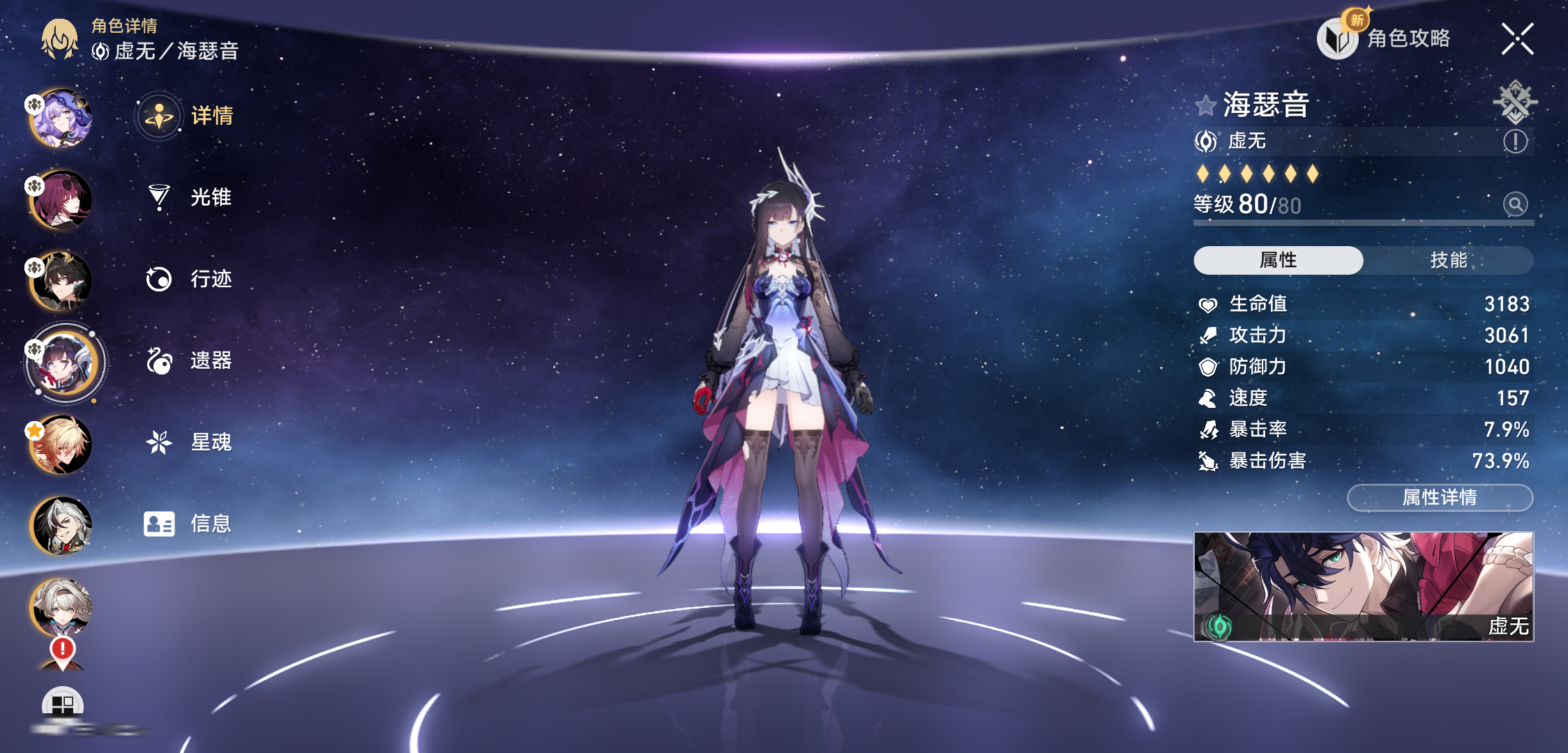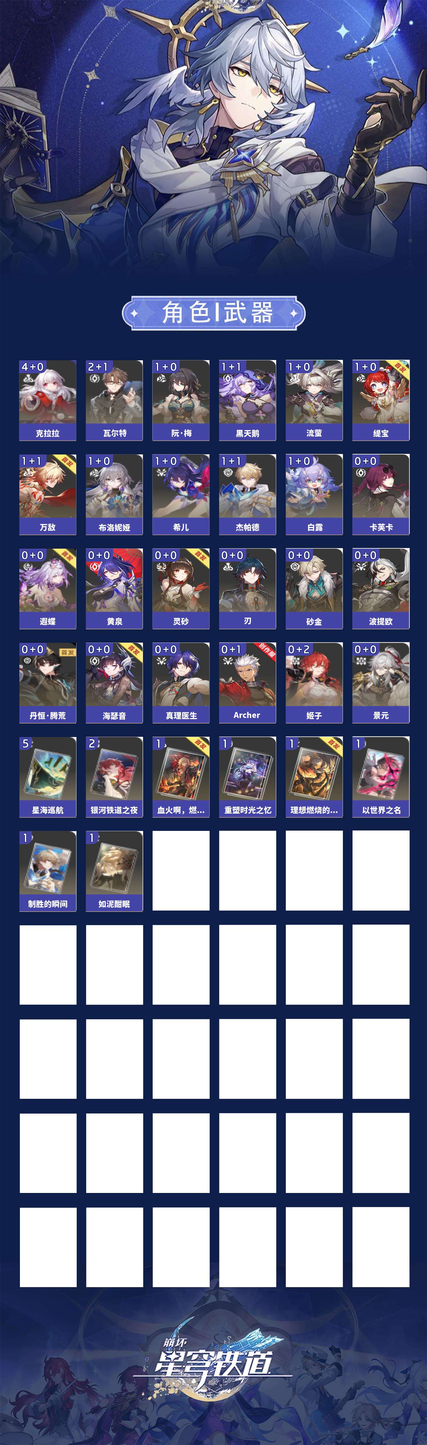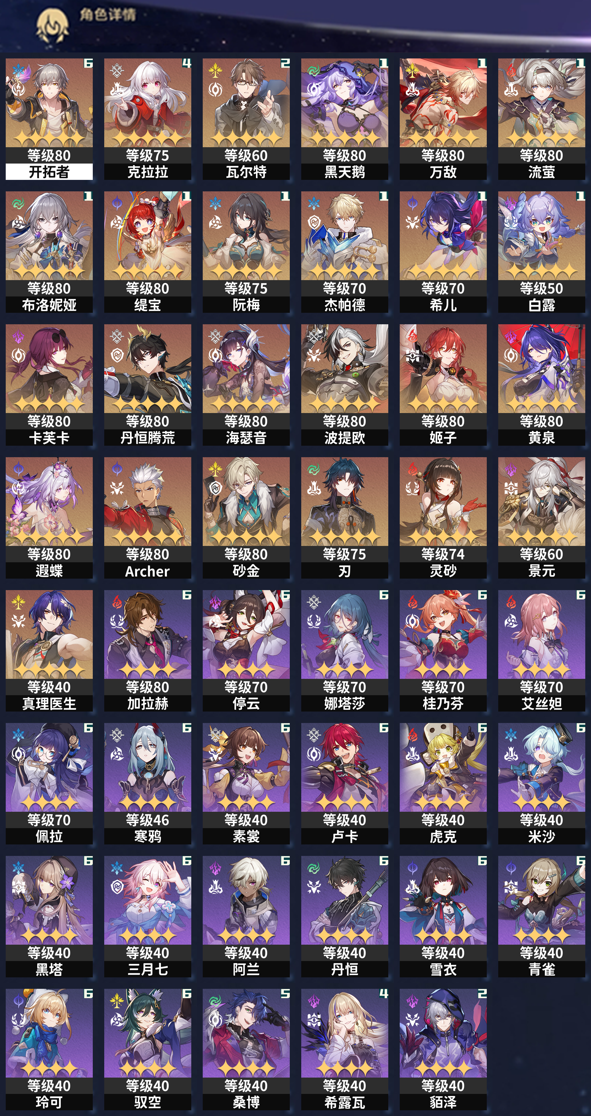 【崩坏·星穹铁道】【lyxq6870】冒险等级:70,男主,五星数量:32,绑定情况:手机号__五星角色:克拉拉 4命|瓦尔特 2命|黑天鹅 1命|万敌 1命|流萤 1命|布洛妮娅 1命|缇宝 1命|阮·梅 1命|杰帕德 1命|希儿 1命|白露 1命|卡芙卡|丹恒·腾荒|海瑟音|波提欧|姬子|黄泉|遐蝶|archer|砂金|刃|灵砂|景元|真理医生__五星光锥:星海巡航 5精|银河铁道之夜 2精|血火啊,燃烧前路|理想燃烧的地狱|重塑时光之忆|以世界之名|制胜的瞬间|如泥酣眠,【邮箱未绑定】