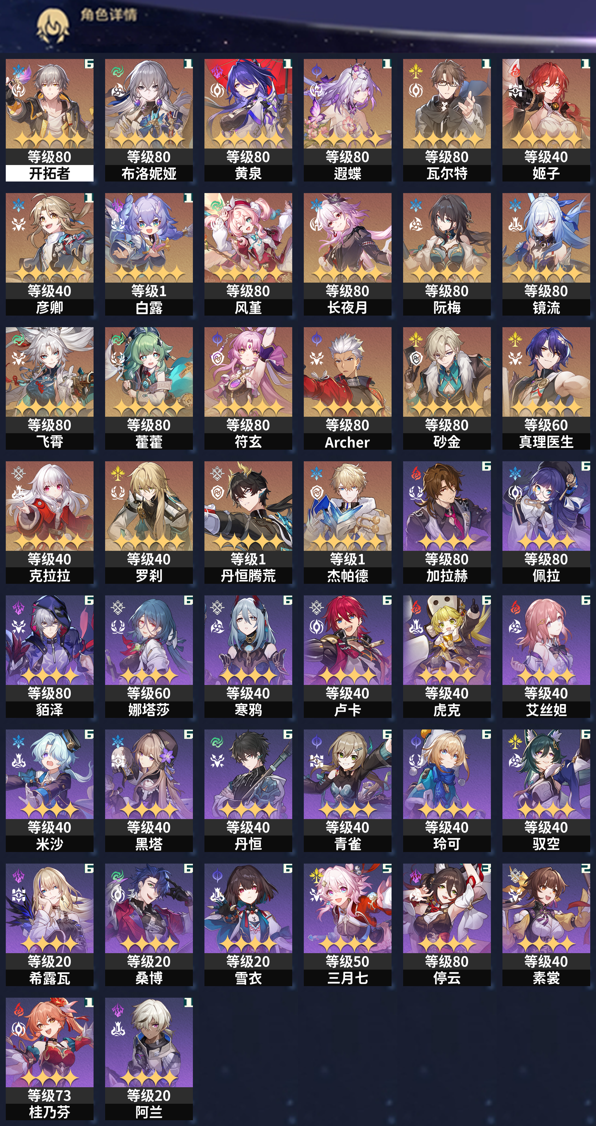 【崩坏·星穹铁道】【lyxq6874】冒险等级:70,男主,五星数量:29,绑定情况:手机号__五星角色:布洛妮娅 1命|黄泉 1命|遐蝶 1命|瓦尔特 1命|姬子 1命|彦卿 1命|白露 1命|风堇|长夜月|阮·梅|镜流|飞霄|藿藿|符玄|archer|砂金|真理医生|克拉拉|罗刹|丹恒·腾荒|杰帕德__五星光锥:星海巡航 5精|记一位星神的陨落 3精|此身为剑|以世界之名|时节不居|让告别,更美一些|银河铁道之夜|无可取代的东西,【邮箱未绑定】