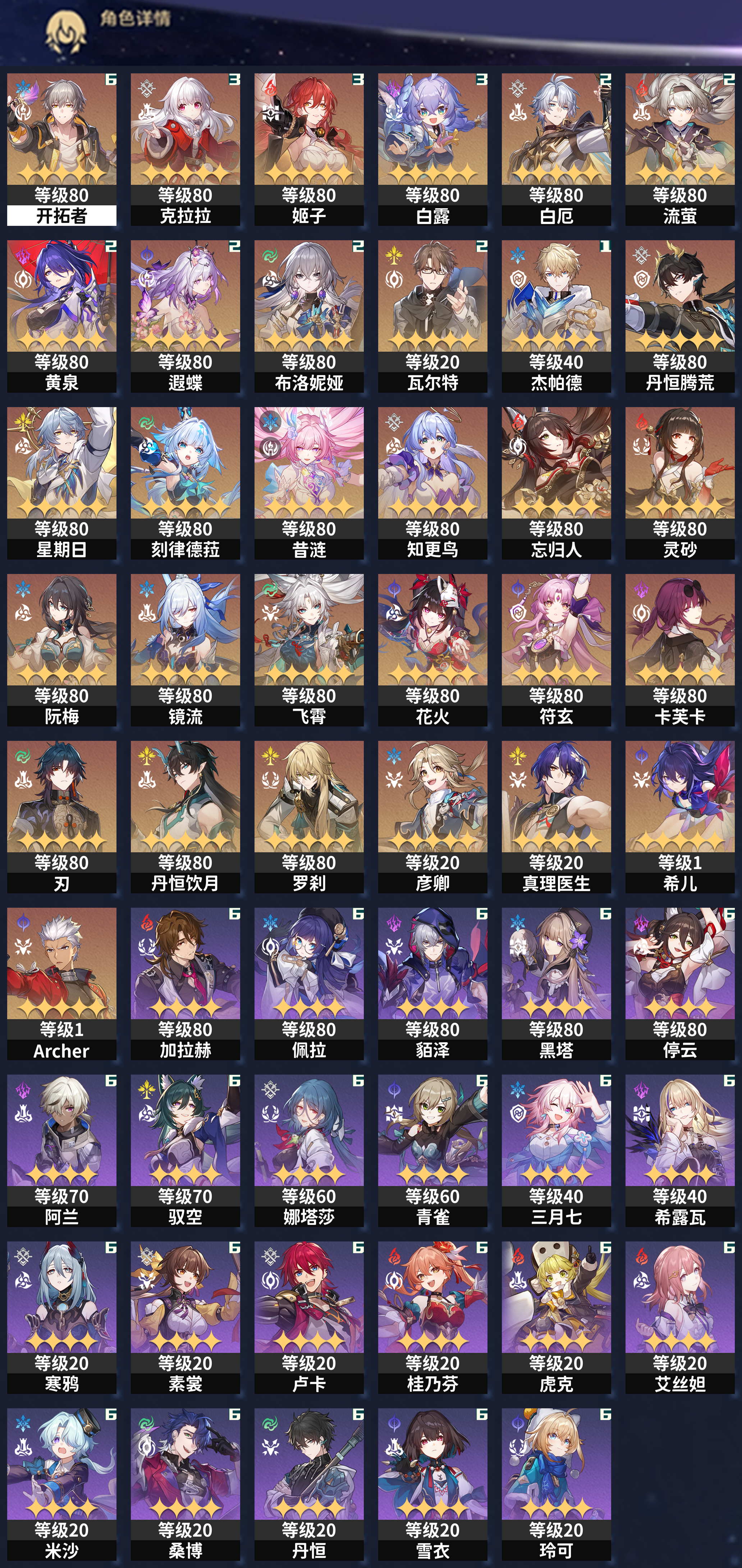 【崩坏·星穹铁道】【lyxq6872】冒险等级:70,男主,五星数量:43,绑定情况:手机号__五星角色:克拉拉 3命|姬子 3命|白露 3命|白厄 2命|流萤 2命|黄泉 2命|遐蝶 2命|布洛妮娅 2命|瓦尔特 2命|杰帕德 1命|丹恒·腾荒|星期日|刻律德菈|昔涟|知更鸟|忘归人|灵砂|阮·梅|镜流|飞霄|花火|符玄|卡芙卡|刃|丹恒·饮月|罗刹|彦卿|真理医生|希儿|archer__五星光锥:记一位星神的陨落 5精|孤独的疗愈 5精|黎明恰如此燃烧|比阳光更明亮的|此身为剑|我将,巡征追猎|镜中故我|但战斗还未结束|行于流逝的岸|让告别,更美一些|如泥酣眠|记忆的质料|理想燃烧的地狱,【邮箱未绑定】