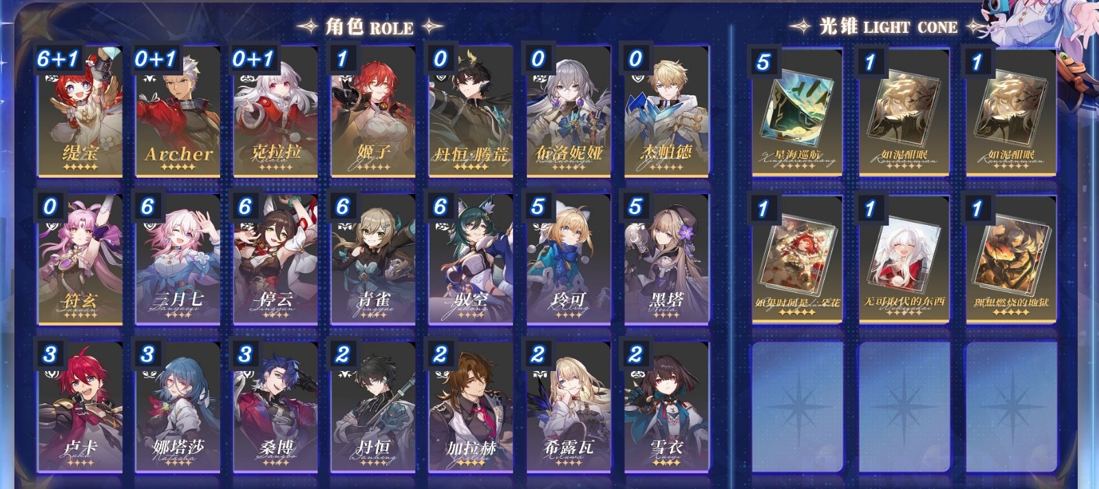 [13712452]m23757,70级女主25黄梦华0星琼131星轨专票0星轨通票08个五星角色:满命缇宝1命姬子archer丹恒腾荒克拉拉布洛妮娅杰帕德符玄6个五星光锥:精5星海巡航精1无可取代的东西精1理想燃烧的地狱精1如果时间是一朵花精1如泥酣眠精1如泥酣眠
