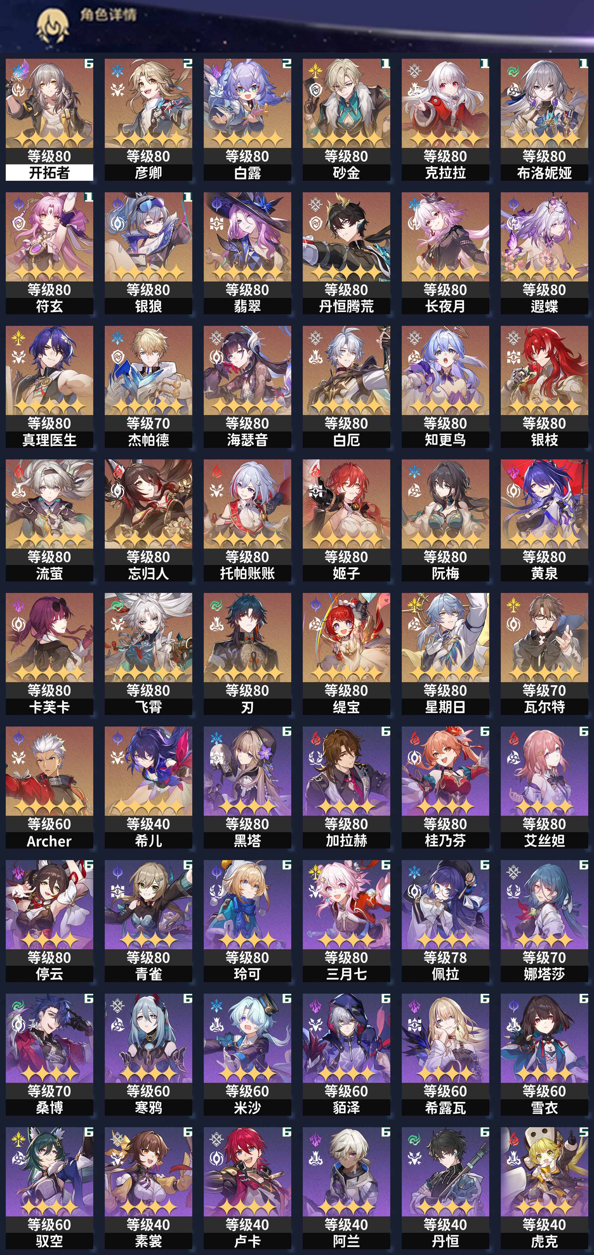 【崩坏·星穹铁道】【lyxq6987】冒险等级:70,女主,五星数量:46,绑定情况:手机号__五星角色:彦卿 2命|白露 2命|砂金 1命|克拉拉 1命|布洛妮娅 1命|符玄 1命|银狼 1命|翡翠|丹恒·腾荒|长夜月|遐蝶|真理医生|杰帕德|海瑟音|白厄|知更鸟|银枝|流萤|忘归人|托帕账账|姬子|阮·梅|黄泉|卡芙卡|飞霄|刃|缇宝|星期日|瓦尔特|archer|希儿__五星光锥:星海巡航 3精|黎明恰如此燃烧|偏偏希望无价|片刻,留在眼底|银河铁道之夜|孤独的疗愈|雨一直下|命运从未公平|制胜的瞬间|时节不居|记忆永不落幕|记一位星神的陨落|如泥酣眠|记忆的质料|不息的演算,【邮箱未绑定】