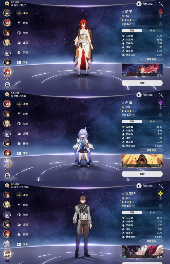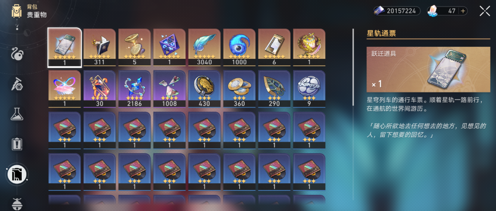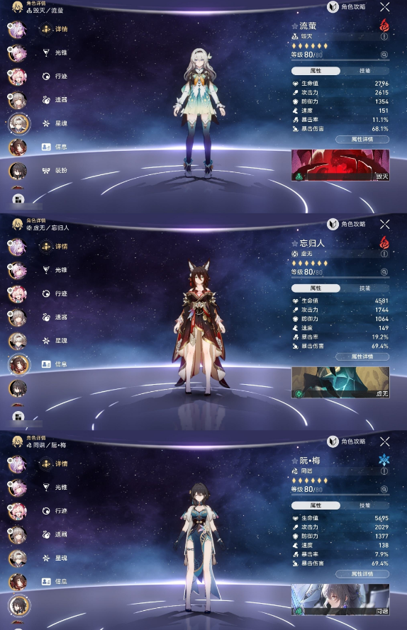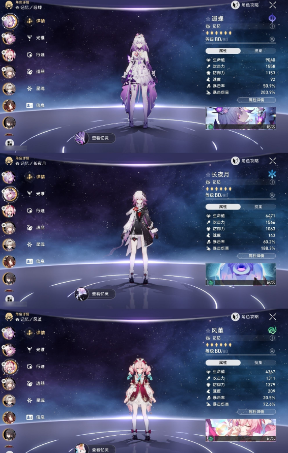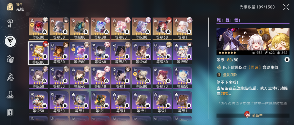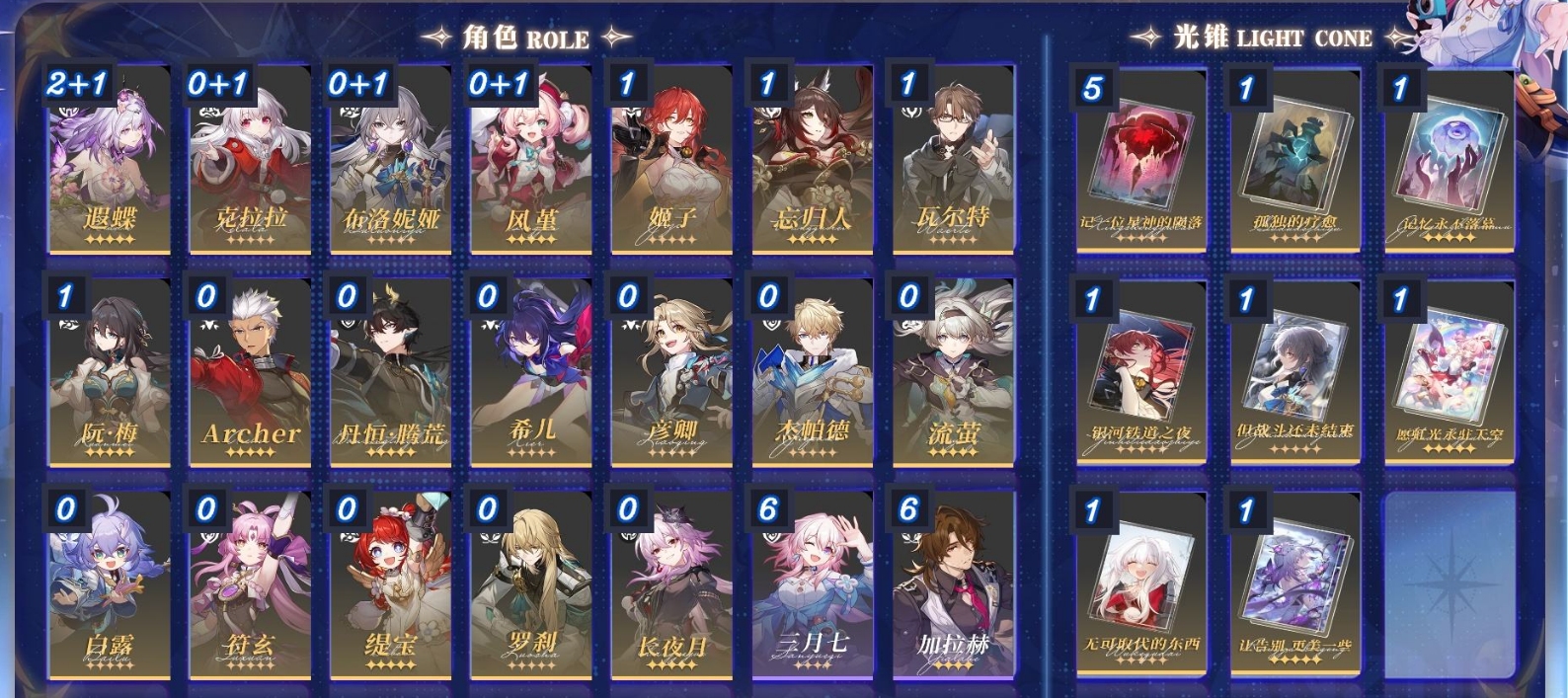 [13874229]m23880,69级女主37黄梦华0星琼47星轨专票0星轨通票119个五星角色:2命遐蝶1命忘归人1命阮梅1命姬子1命瓦尔特长夜月风堇流萤缇宝罗刹丹恒腾荒白露克拉拉彦卿杰帕德布洛妮娅符玄希儿archer8个五星光锥:精5记一位星神的陨落精1但战斗还未结束精1孤独的疗愈精1记忆永不落幕精1愿虹光永驻天空精1让告别更美一些精1银河铁道之夜精1无可取代的东西