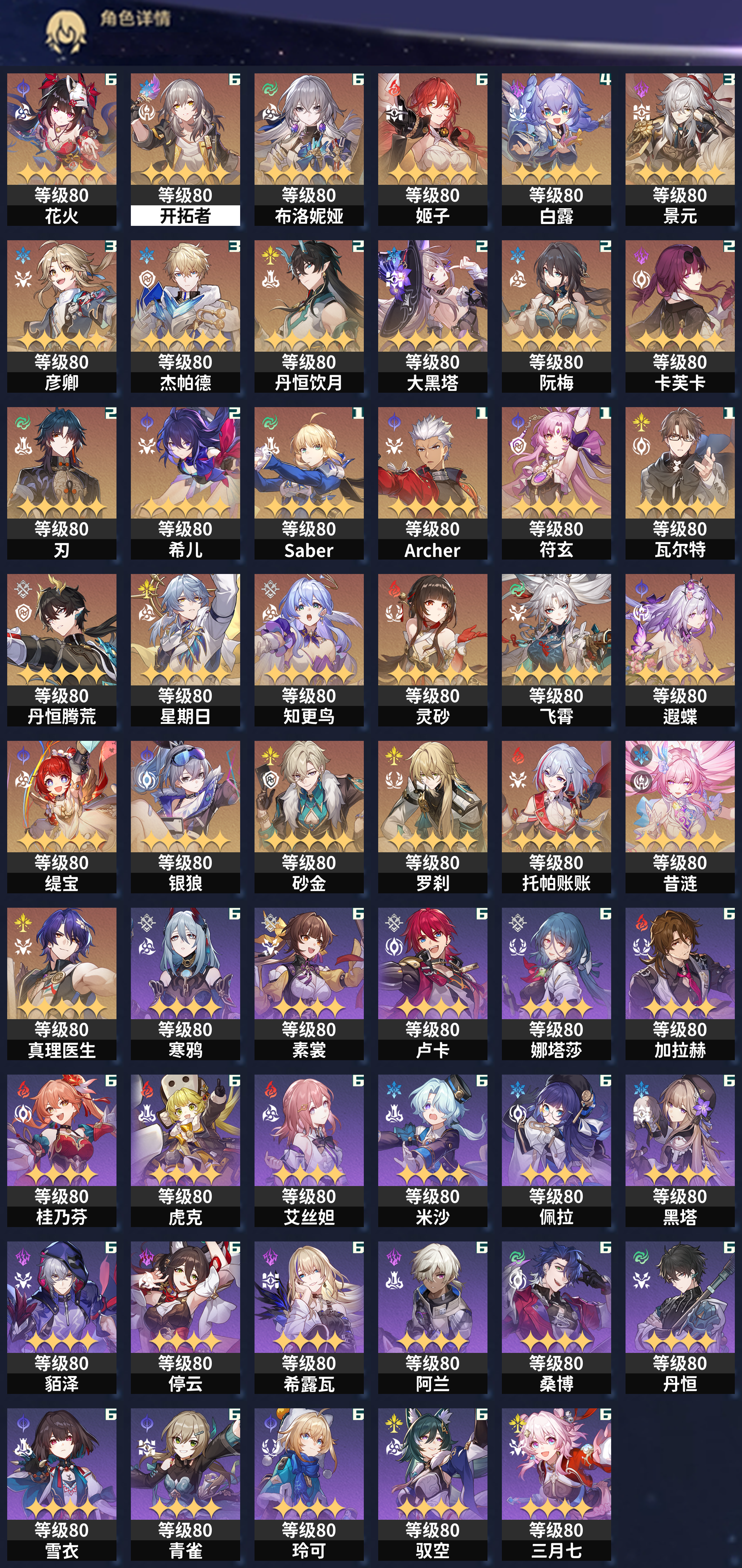 【崩坏·星穹铁道】【lyxq7077】冒险等级:70,女主,五星数量:52,绑定情况:邮箱__五星角色:花火 6命|布洛妮娅 6命|姬子 6命|白露 4命|景元 3命|彦卿 3命|杰帕德 3命|丹恒·饮月 2命|大黑塔 2命|阮·梅 2命|卡芙卡 2命|刃 2命|希儿 2命|saber 1命|archer 1命|符玄 1命|瓦尔特 1命|丹恒·腾荒|星期日|知更鸟|灵砂|飞霄|遐蝶|缇宝|银狼|砂金|罗刹|托帕账账|昔涟|真理医生__五星光锥:记忆永不落幕 4精|比阳光更明亮的|到不了的彼岸|我将,巡征追猎|如泥酣眠|于夜色中|向着不可追问处|拂晓之前|银河铁道之夜|回到大地的飞行|夜色流光溢彩|游戏尘寰|镜中故我|但战斗还未结束|只需等待|纵然山河万程|命运从未公平|她已闭上双眼|唯有香如故|时节不居|让告别,更美一些|星海巡航,【邮箱不出售】