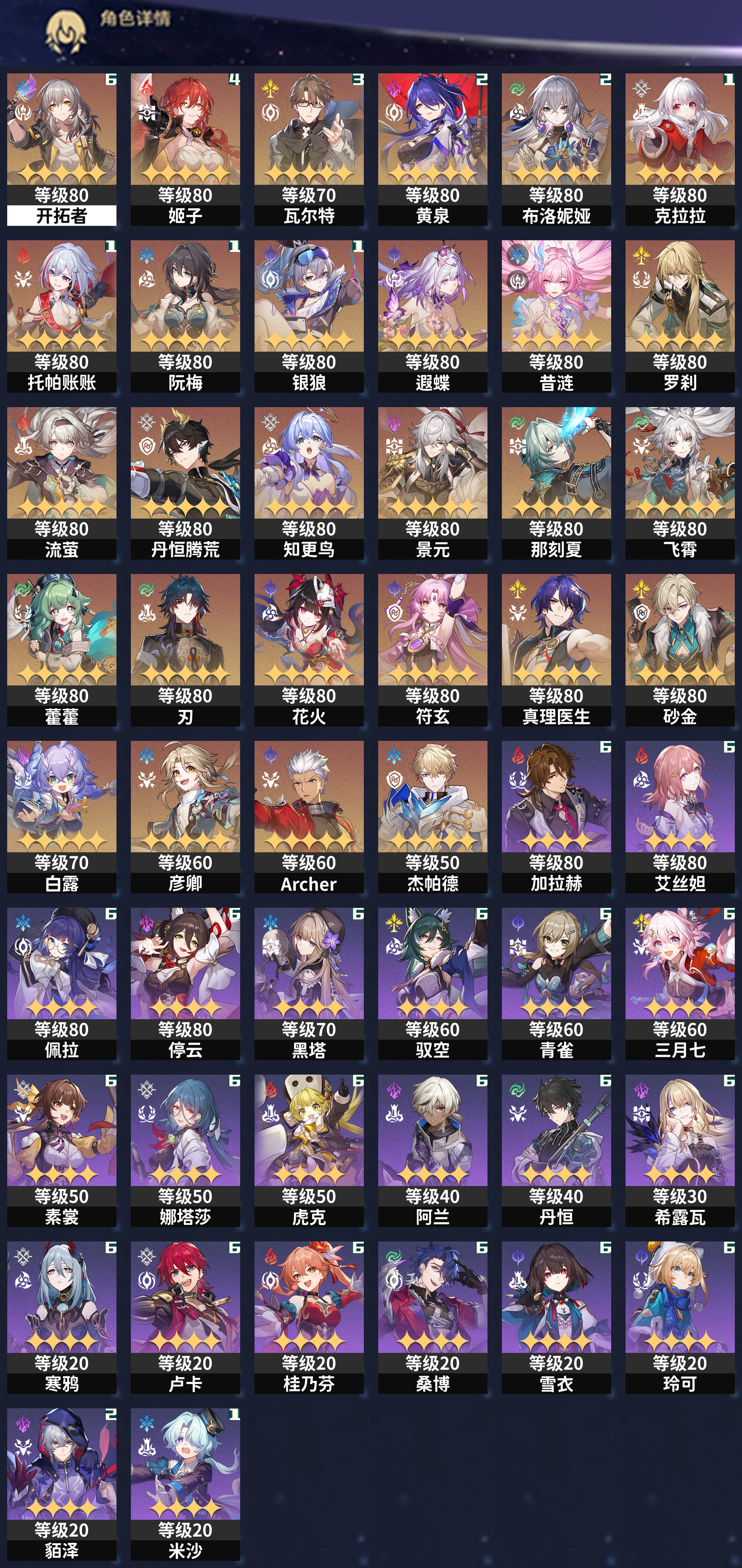 【崩坏·星穹铁道】【lyxq7075】冒险等级:70,女主,五星数量:44,绑定情况:手机号__五星角色:姬子 4命|瓦尔特 3命|黄泉 2命|布洛妮娅 2命|克拉拉 1命|托帕账账 1命|阮·梅 1命|银狼 1命|遐蝶|昔涟|罗刹|流萤|丹恒·腾荒|知更鸟|景元|那刻夏|飞霄|藿藿|刃|花火|符玄|真理医生|砂金|白露|彦卿|archer|杰帕德__五星光锥:星海巡航 5精|梦应归于何处|到不了的彼岸|无可取代的东西|纯粹思维的洗礼|烦恼着,幸福着|生命当付之一炬|银河铁道之夜|但战斗还未结束|行于流逝的岸|命运从未公平|时节不居|记忆永不落幕|让告别,更美一些|制胜的瞬间|记一位星神的陨落|记忆的质料,【邮箱未绑定】