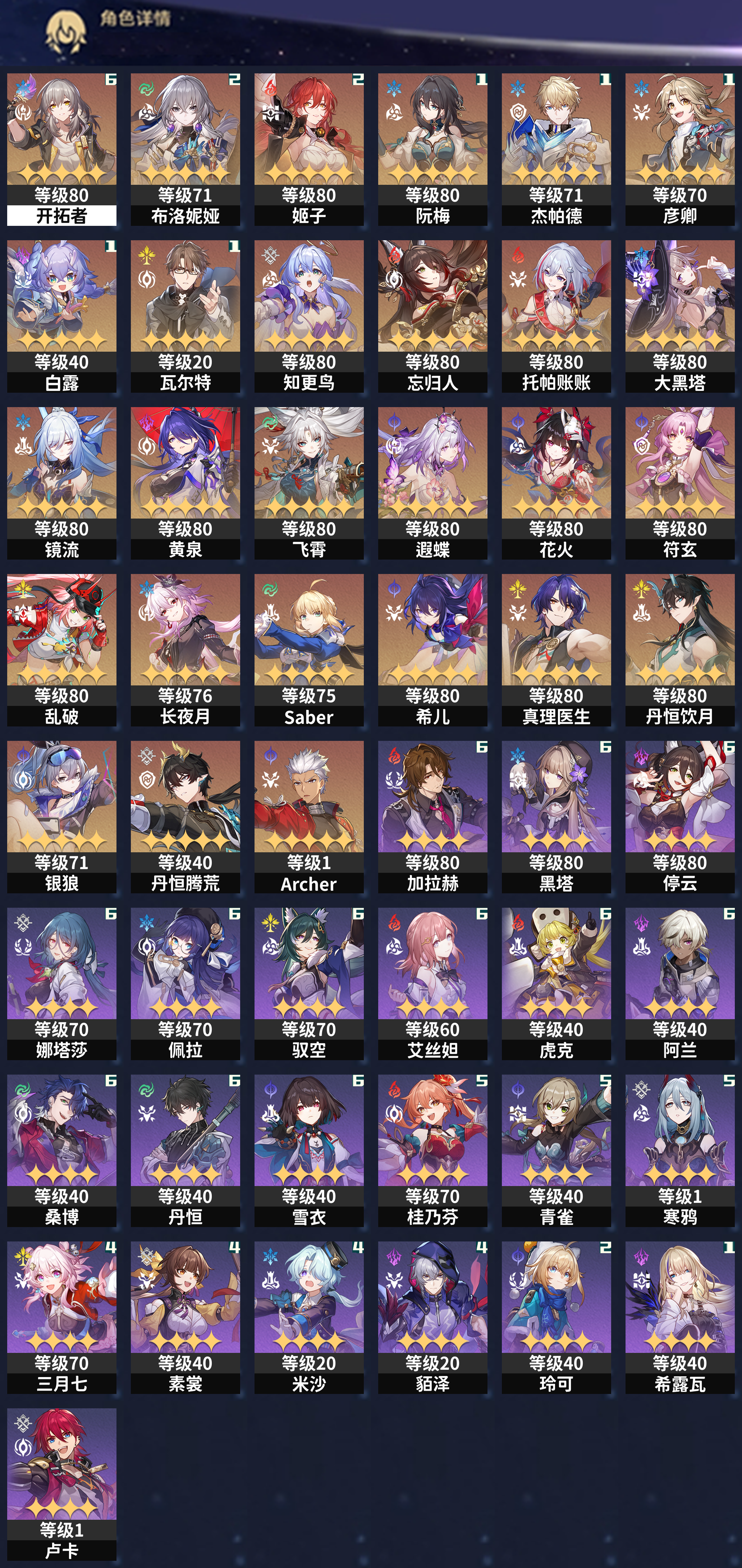 【崩坏·星穹铁道】【lyxq7092】冒险等级:70,女主,五星数量:38,绑定情况:手机号__五星角色:布洛妮娅 2命|姬子 2命|阮·梅 1命|杰帕德 1命|彦卿 1命|白露 1命|瓦尔特 1命|知更鸟|忘归人|托帕账账|大黑塔|镜流|黄泉|飞霄|遐蝶|花火|符玄|乱破|长夜月|saber|希儿|真理医生|丹恒·饮月|银狼|丹恒·腾荒|archer__五星光锥:记一位星神的陨落 5精|星海巡航 5精|不息的演算 5精|如泥酣眠 2精|我将,巡征追猎|向着不可追问处|但战斗还未结束|行于流逝的岸|时节不居|镜中故我|无可取代的东西|记忆的质料,【邮箱未绑定】