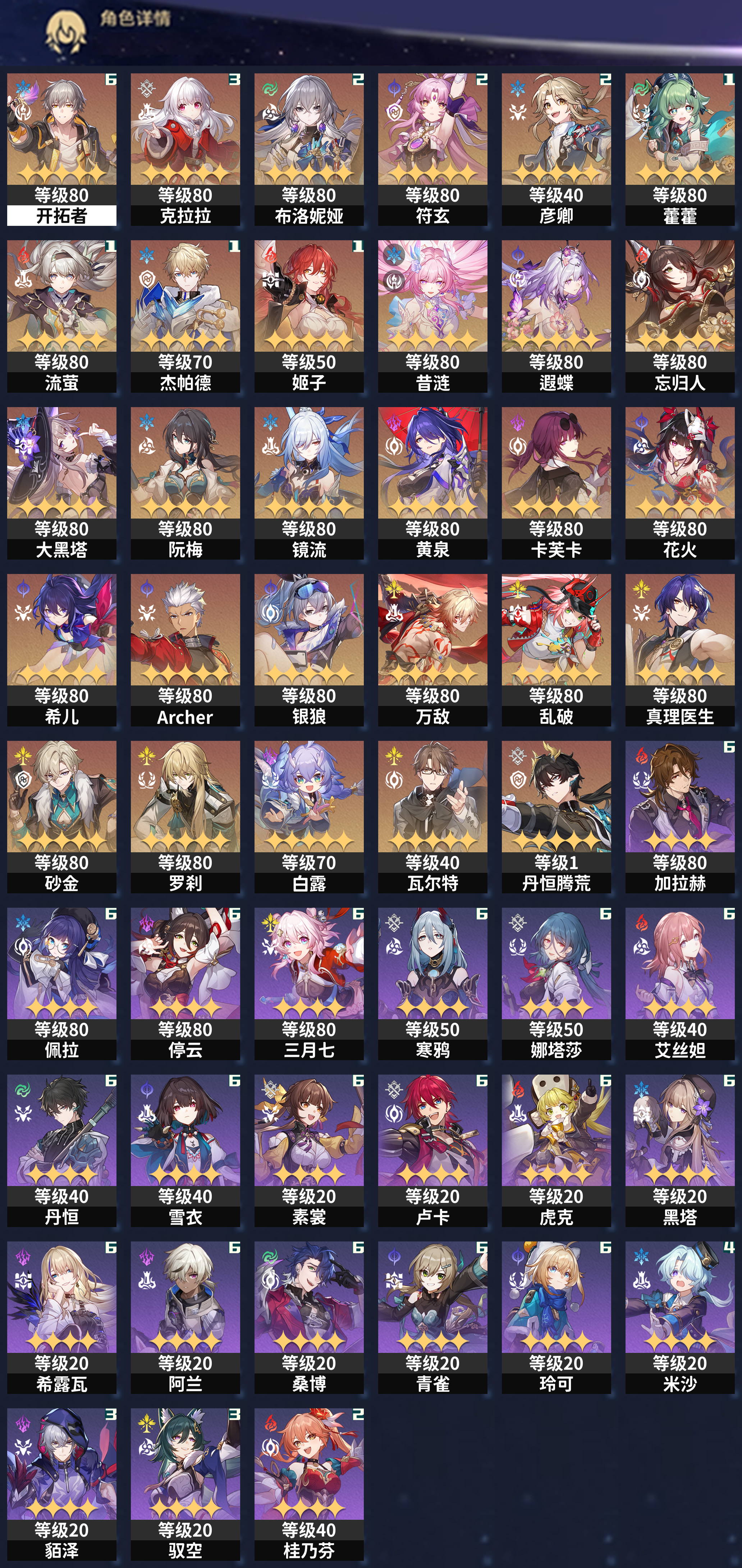 【崩坏·星穹铁道】【lyxq7102】冒险等级:70,男主,五星数量:43,绑定情况:邮箱__五星角色:克拉拉 3命|布洛妮娅 2命|符玄 2命|彦卿 2命|藿藿 1命|流萤 1命|杰帕德 1命|姬子 1命|昔涟|遐蝶|忘归人|大黑塔|阮·梅|镜流|黄泉|卡芙卡|花火|希儿|archer|银狼|万敌|乱破|真理医生|砂金|罗刹|白露|瓦尔特|丹恒·腾荒__五星光锥:星海巡航 5精|记一位星神的陨落 4精|时节不居 2精|血火啊,燃烧前路|梦应归于何处|此身为剑|游戏尘寰|长路终有归途|行于流逝的岸|雨一直下|她已闭上双眼|惊魂夜|银河铁道之夜|以世界之名|制胜的瞬间,【邮箱不出售】
