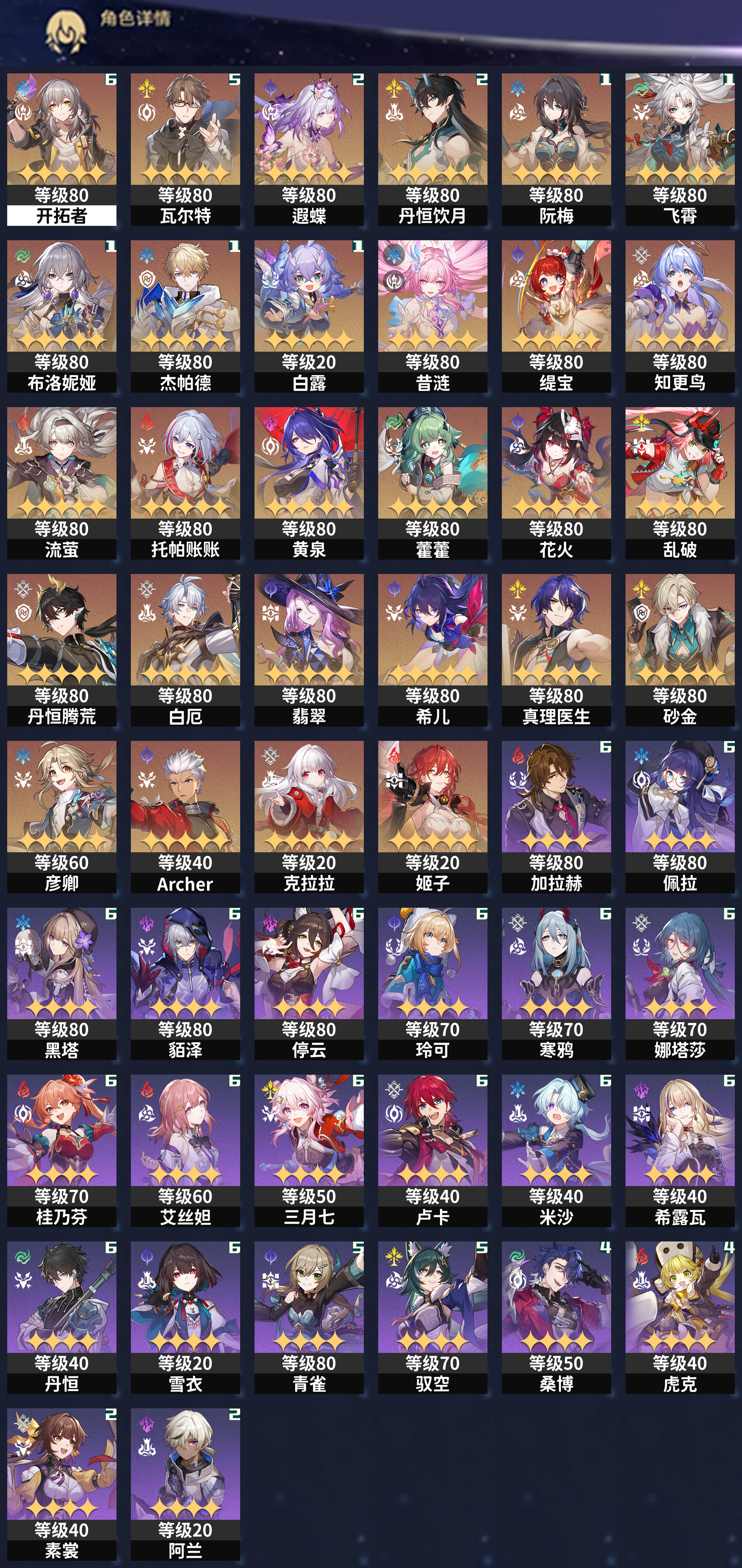 【崩坏·星穹铁道】【lyxq7103】冒险等级:70,女主,五星数量:38,绑定情况:手机号__五星角色:瓦尔特 5命|遐蝶 2命|丹恒·饮月 2命|阮·梅 1命|飞霄 1命|布洛妮娅 1命|杰帕德 1命|白露 1命|昔涟|缇宝|知更鸟|流萤|托帕账账|黄泉|藿藿|花火|乱破|丹恒·腾荒|白厄|翡翠|希儿|真理医生|砂金|彦卿|archer|克拉拉|姬子__五星光锥:记一位星神的陨落 5精|星海巡航 5精|记忆永不落幕 5精|银河铁道之夜 2精|比阳光更明亮的|我将,巡征追猎|游戏尘寰|以世界之名|让告别,更美一些|无可取代的东西|时节不居,【邮箱未绑定】
