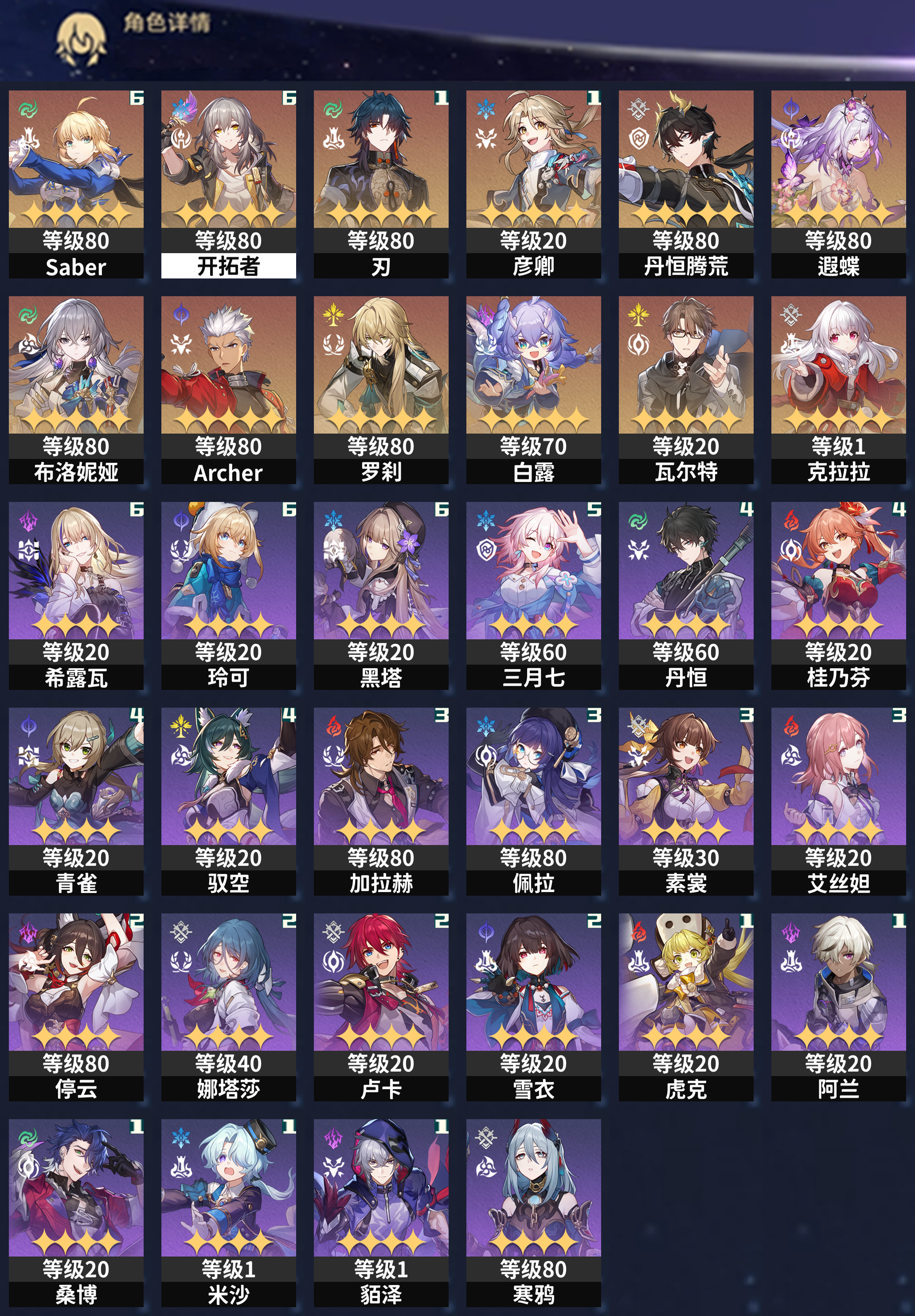 【崩坏·星穹铁道】【lyxq7108】冒险等级:68,女主,五星数量:18,绑定情况:邮箱__五星角色:saber 6命|刃 1命|彦卿 1命|丹恒·腾荒|遐蝶|布洛妮娅|archer|罗刹|白露|瓦尔特|克拉拉__五星光锥:记一位星神的陨落|没有回报的加冕|理想燃烧的地狱|让告别,更美一些|时节不居|记忆永不落幕|星海巡航,【邮箱未实名】