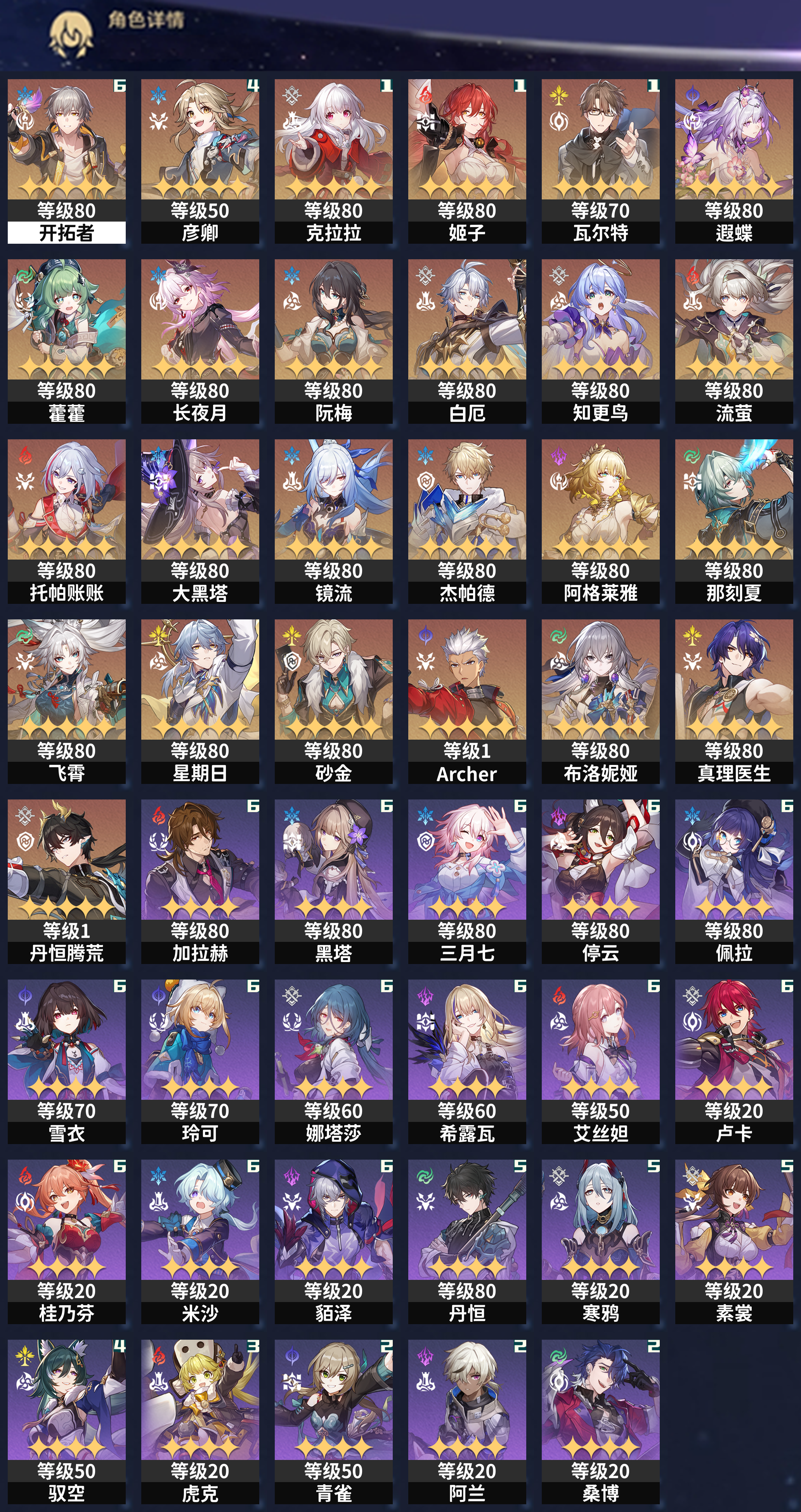 【崩坏·星穹铁道】【lyxq7131】冒险等级:70,男主,五星数量:34,绑定情况:手机号__五星角色:彦卿 4命|克拉拉 1命|姬子 1命|瓦尔特 1命|遐蝶|藿藿|长夜月|阮·梅|白厄|知更鸟|流萤|托帕账账|大黑塔|镜流|杰帕德|阿格莱雅|那刻夏|飞霄|星期日|砂金|archer|布洛妮娅|真理医生|丹恒·腾荒__五星光锥:记一位星神的陨落 4精|不息的演算 3精|时节不居 2精|此身为剑|向着不可追问处|让告别,更美一些|将光阴织成黄金|但战斗还未结束|以世界之名|如泥酣眠,【邮箱未绑定】