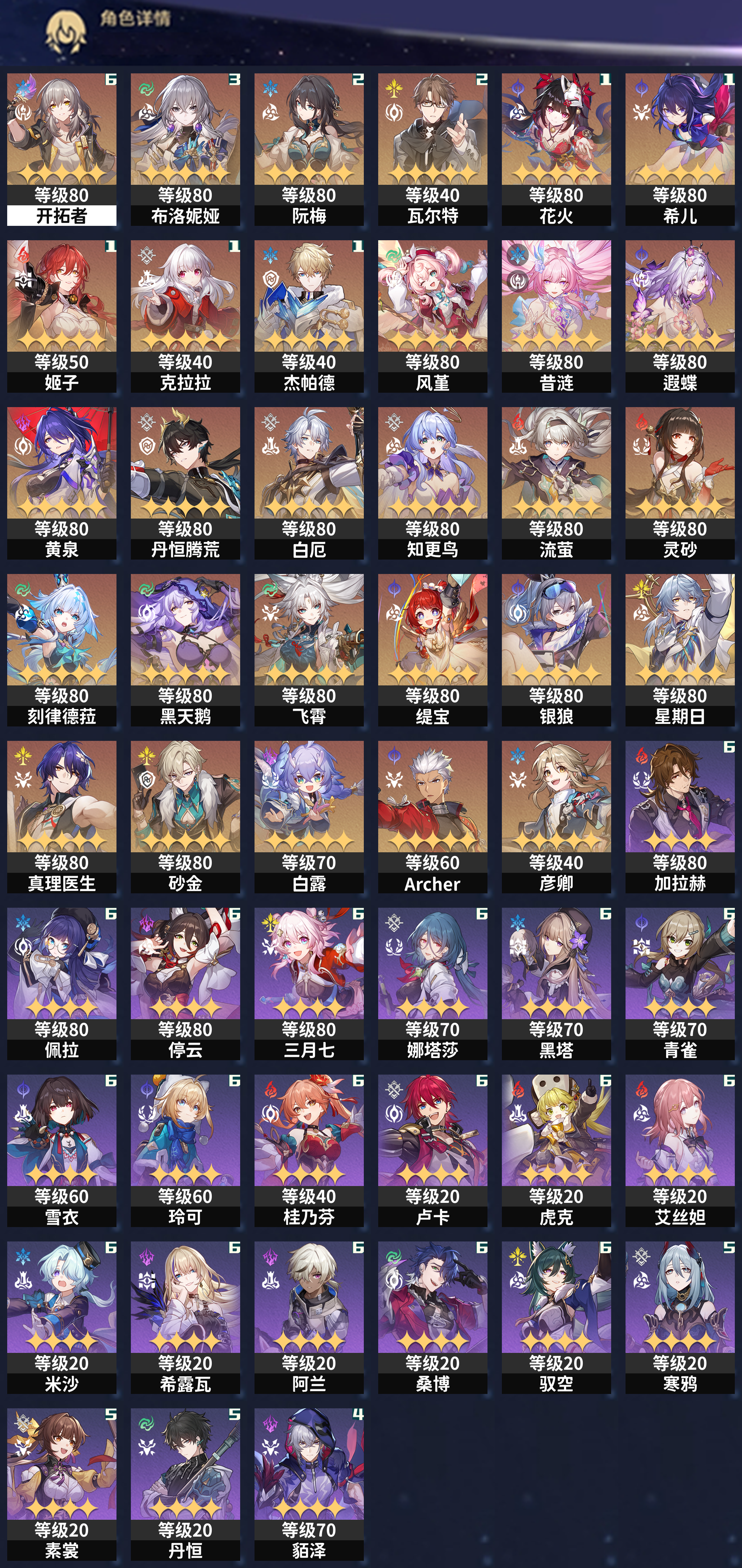 【崩坏·星穹铁道】【lyxq7139】冒险等级:70,女主,五星数量:39,绑定情况:邮箱__五星角色:布洛妮娅 3命|阮·梅 2命|瓦尔特 2命|花火 1命|希儿 1命|姬子 1命|克拉拉 1命|杰帕德 1命|风堇|昔涟|遐蝶|黄泉|丹恒·腾荒|白厄|知更鸟|流萤|灵砂|刻律德菈|黑天鹅|飞霄|缇宝|银狼|星期日|真理医生|砂金|白露|archer|彦卿__五星光锥:记忆永不落幕 5精|如泥酣眠 2精|记一位星神的陨落|无可取代的东西|如果时间是一朵花|回到大地的飞行|夜色流光溢彩|行于流逝的岸|时节不居|愿虹光永驻天空|让告别,更美一些,【邮箱不出售】