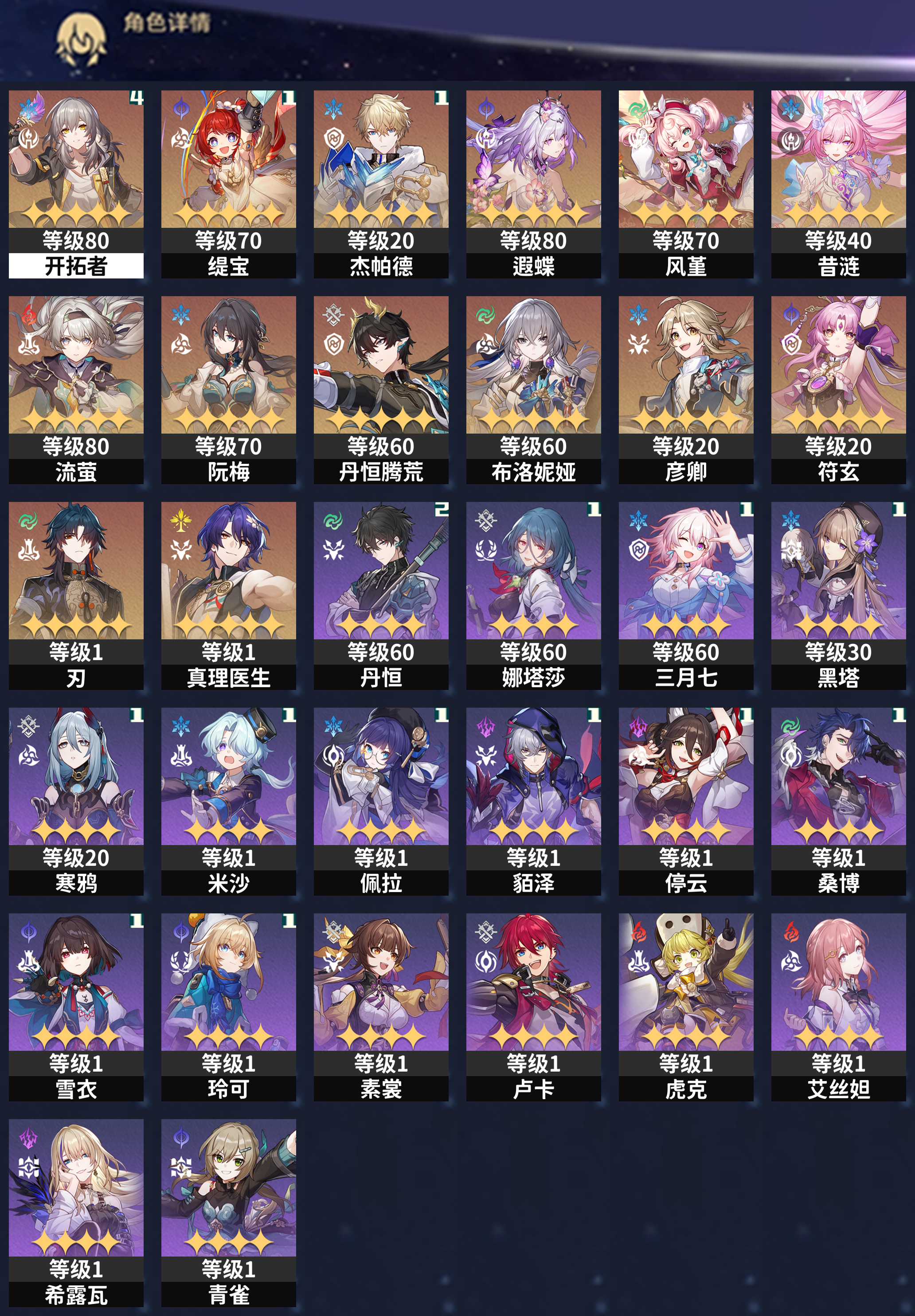 【崩坏·星穹铁道】【lyxq7105】冒险等级:60,女主,五星数量:17,绑定情况:邮箱__五星角色:缇宝 1命|杰帕德 1命|遐蝶|风堇|昔涟|流萤|阮·梅|丹恒·腾荒|布洛妮娅|彦卿|符玄|刃|真理医生__五星光锥:愿虹光永驻天空|让告别,更美一些|记一位星神的陨落|以世界之名,【邮箱已实名】