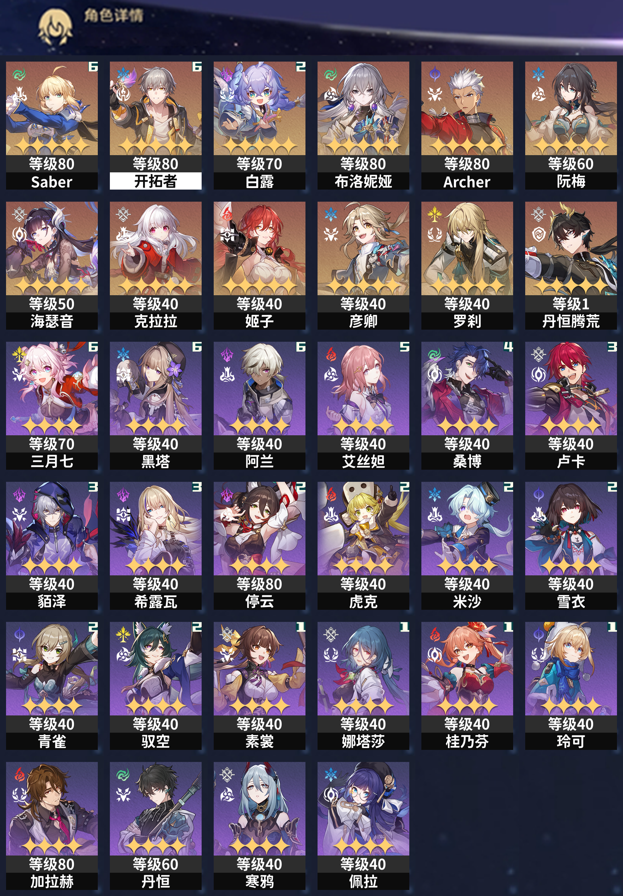 【崩坏·星穹铁道】【lyxq7136】冒险等级:65,男主,五星数量:17,绑定情况:邮箱__五星角色:saber 6命|白露 2命|布洛妮娅|archer|阮·梅|海瑟音|克拉拉|姬子|彦卿|罗刹|丹恒·腾荒__五星光锥:星海巡航 5精|没有回报的加冕|理想燃烧的地狱|但战斗还未结束|以世界之名|制胜的瞬间,【邮箱未实名】