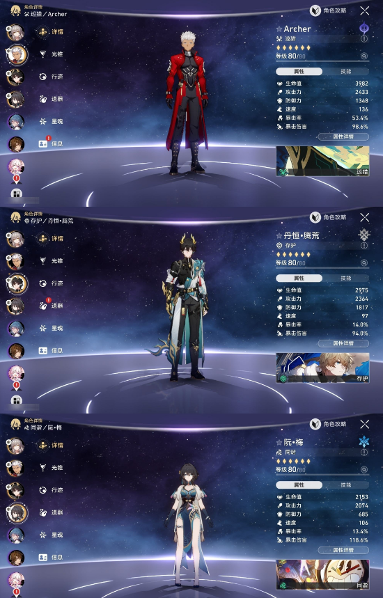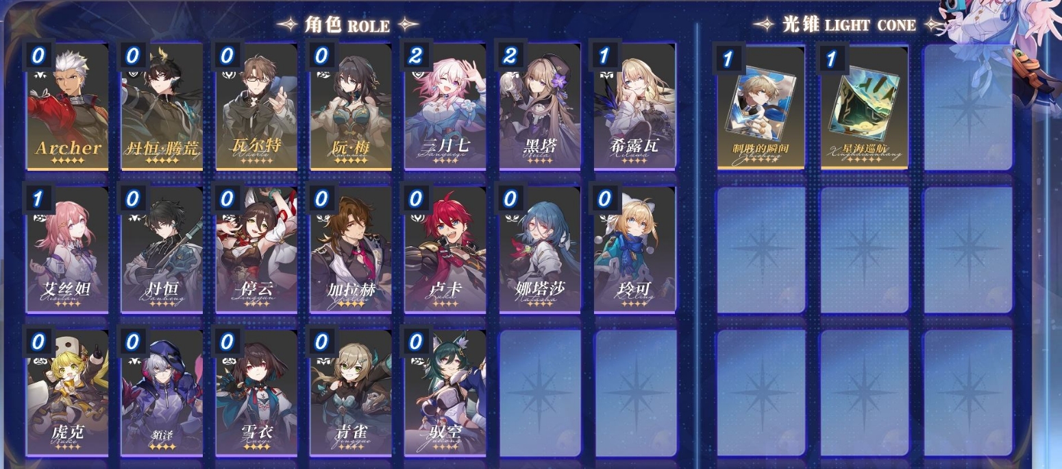 [13979649]m24031,62级 6黄,女主,4个五星角色:阮梅,瓦尔特,archer,丹恒腾荒, 2个五星光锥:精1星海巡航,精1制胜的瞬间, 梦华0,星琼65654,星轨专票27