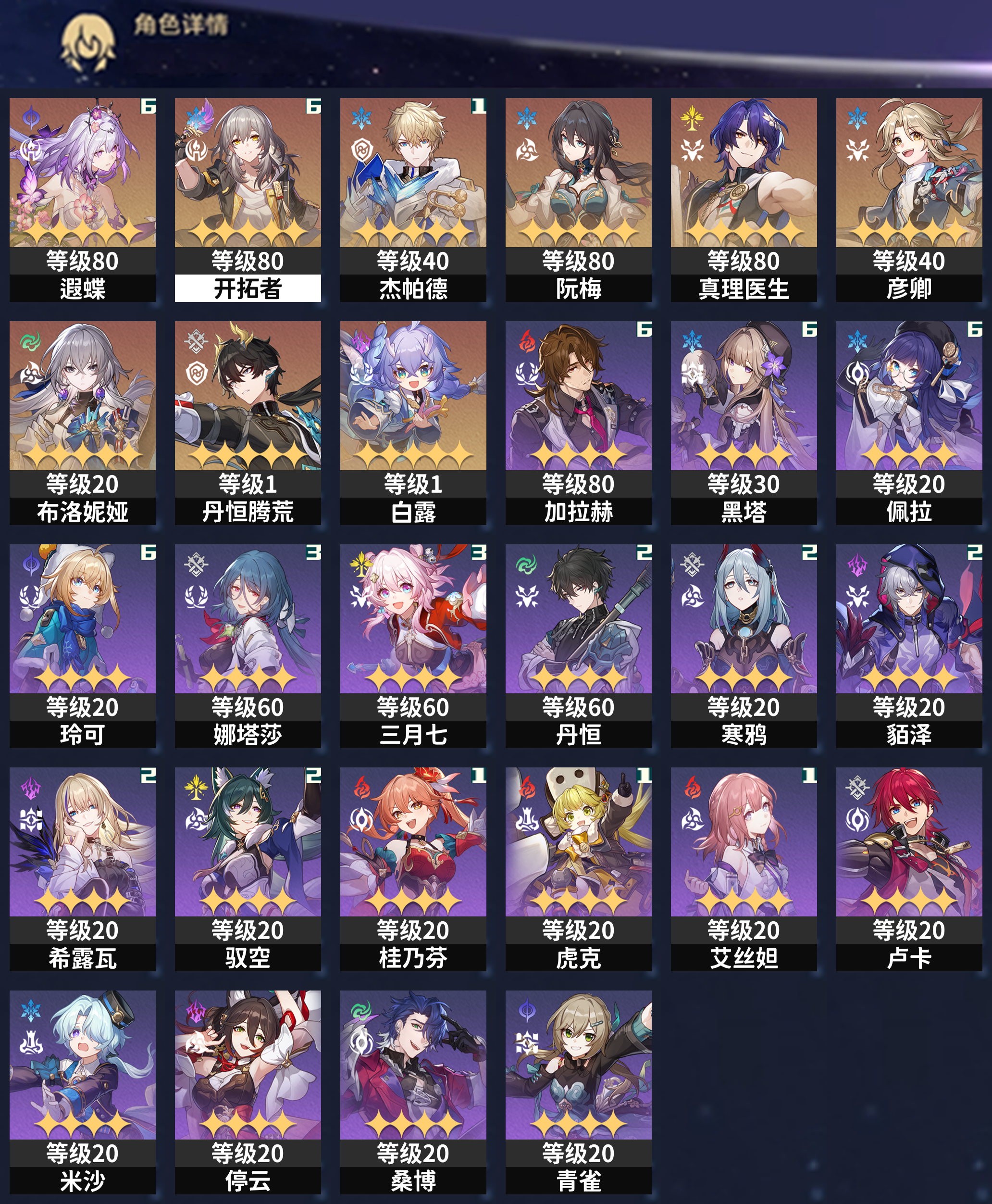 【崩坏·星穹铁道】【lyxq7202】冒险等级:67,女主,五星数量:12,绑定情况:邮箱__五星角色:遐蝶 6命|杰帕德 1命|阮·梅|真理医生|彦卿|布洛妮娅|丹恒·腾荒|白露__五星光锥:星海巡航 5精|让告别,更美一些 5精|无可取代的东西|以世界之名,【邮箱已实名】