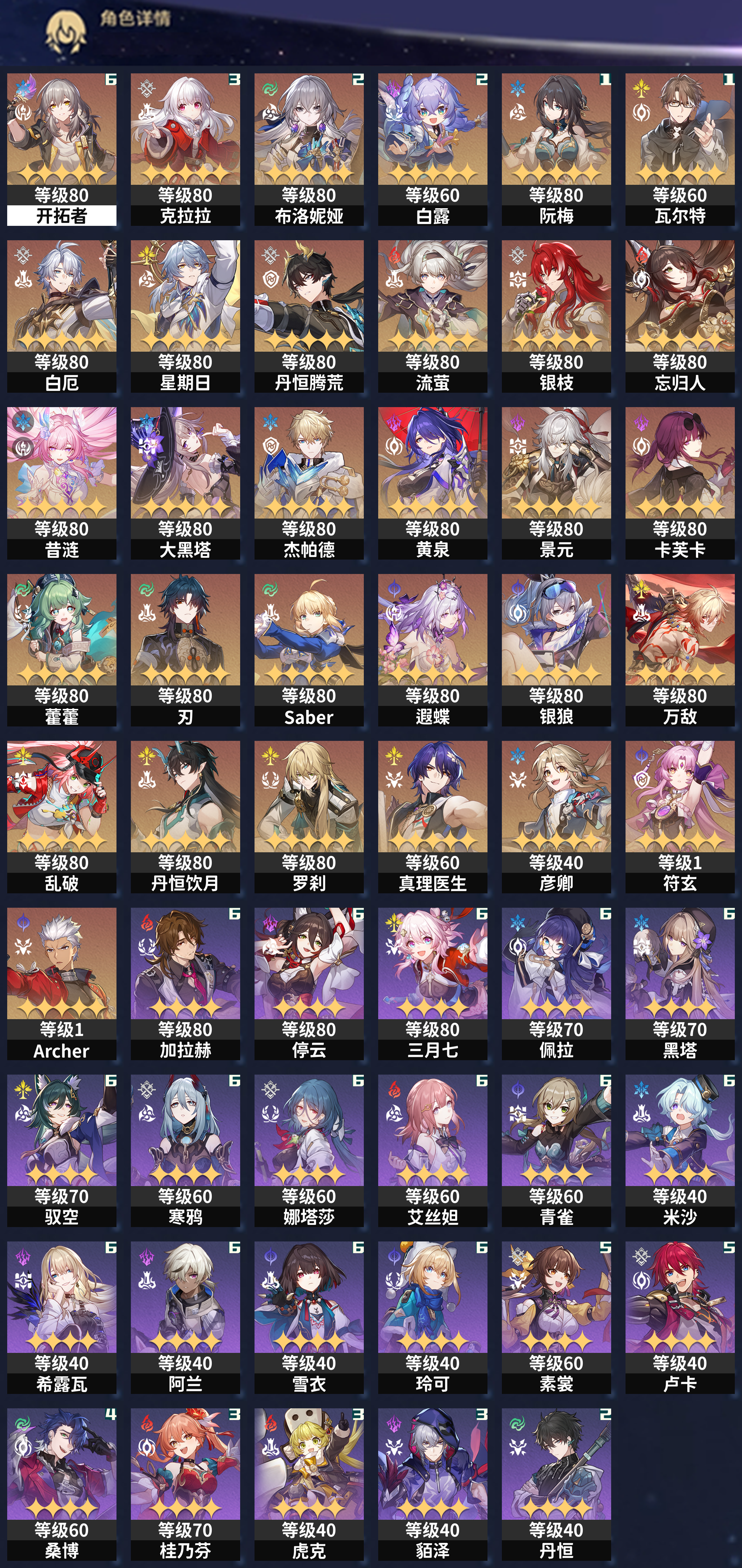 【崩坏·星穹铁道】【lyxq7178】冒险等级:70,女主,五星数量:42,绑定情况:邮箱__五星角色:克拉拉 3命|布洛妮娅 2命|白露 2命|阮·梅 1命|瓦尔特 1命|白厄|星期日|丹恒·腾荒|流萤|银枝|忘归人|昔涟|大黑塔|杰帕德|黄泉|景元|卡芙卡|藿藿|刃|saber|遐蝶|银狼|万敌|乱破|丹恒·饮月|罗刹|真理医生|彦卿|符玄|archer__五星光锥:记一位星神的陨落 5精|制胜的瞬间 3精|孤独的疗愈 2精|黎明恰如此燃烧|无可取代的东西|片刻,留在眼底|夜色流光溢彩|但战斗还未结束|只需等待|记忆永不落幕|时节不居|星海巡航,【邮箱不出售】1